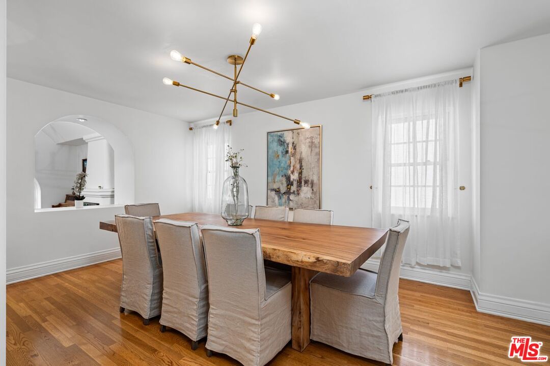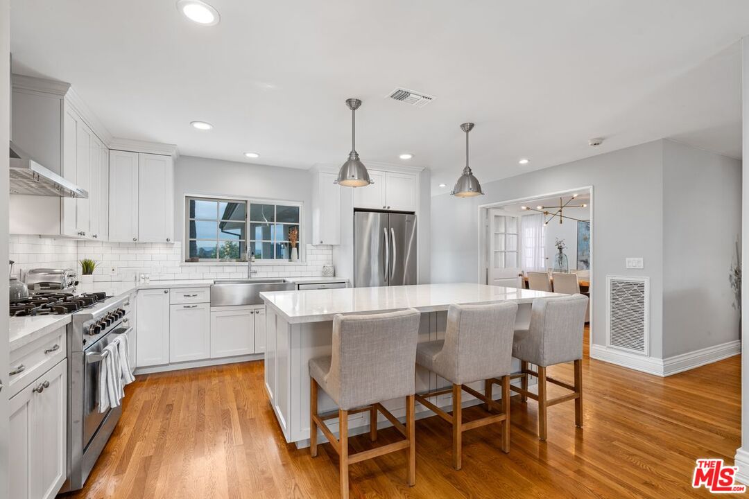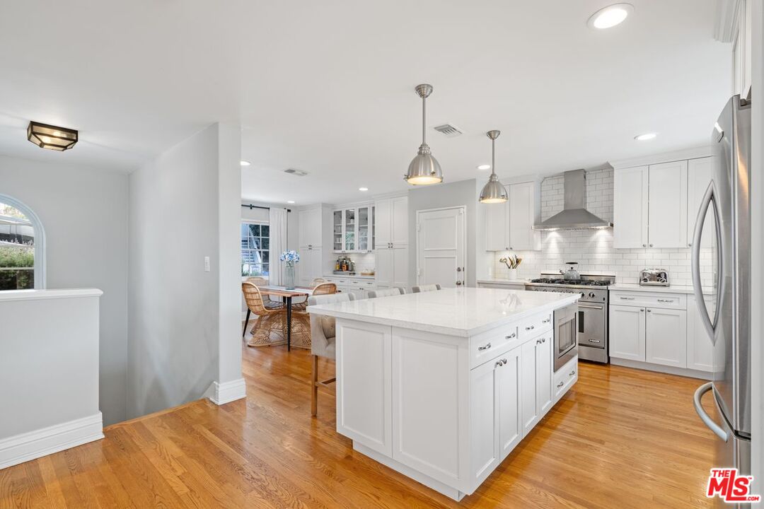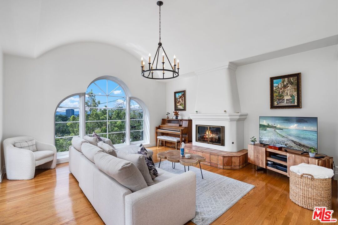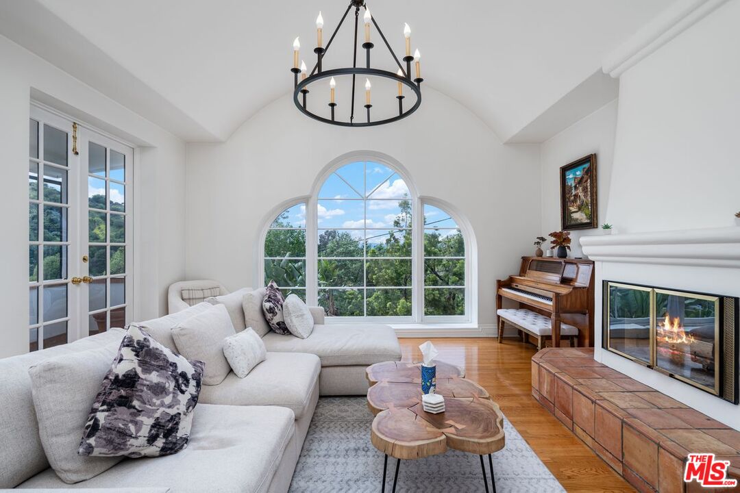 Welcome to your own private retreat nestled south of the boulevard in the coveted hills of Sherman Oaks. This stunning Santa Barbara-inspired hacienda has been thoughtfully upgraded to blend timeless architectural charm with modern comfort. Sunlight pours through expansive windows, illuminating rich wood floors and clean, elegant lines throughout.The gourmet chef's kitchen is the heart of the home, complete with stainless steel appliances, a generous center island with bar seating and a custom breakfast nook ideal for morning gatherings. An expansive formal dining room sets the stage for unforgettable dinners, flowing seamlessly into a sophisticated living room adorned with a fireplace, oversized windows and access to a sweeping balcony with scenic views.The romantic primary suite is a true retreat, featuring its own private balcony, a spacious walk-in closet and a spa-like en suite bath with a soaking tub, dual walk-in shower and double vanities. Three additional bedrooms offer high ceilings, large windows and designer details, ideal for guests. Downstairs, discover a sprawling bonus room with original Spanish tile floors great for a game room, home gym, office or creative studio. This versatile space opens directly to your backyard oasis, where tropical palms frame a sparkling lap pool, BBQ station, lush turf and multiple areas for lounging or dining al fresco.For added convenience and privacy, the property includes a separate attached guest quarters with its own entrance, two bedrooms and a full bath ideal for visitors. This home is the ultimate blend of smart home technology, luxury, warmth and California lifestyle with many upgrades including new roof, HVAC, outdoor Kitchen/BBQ, exterior lighting, epoxy garage flooring, cameras and pool pump. Don't miss your chance to own this one-of-a-kind sanctuary south of the Blvd in Sherman Oaks.