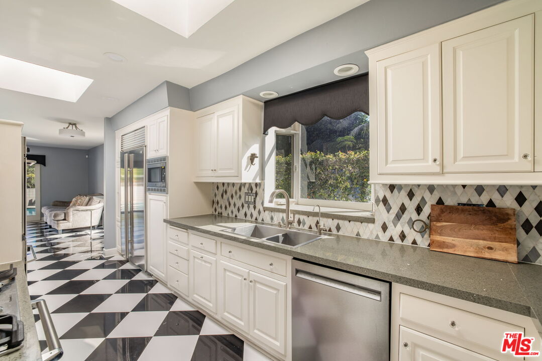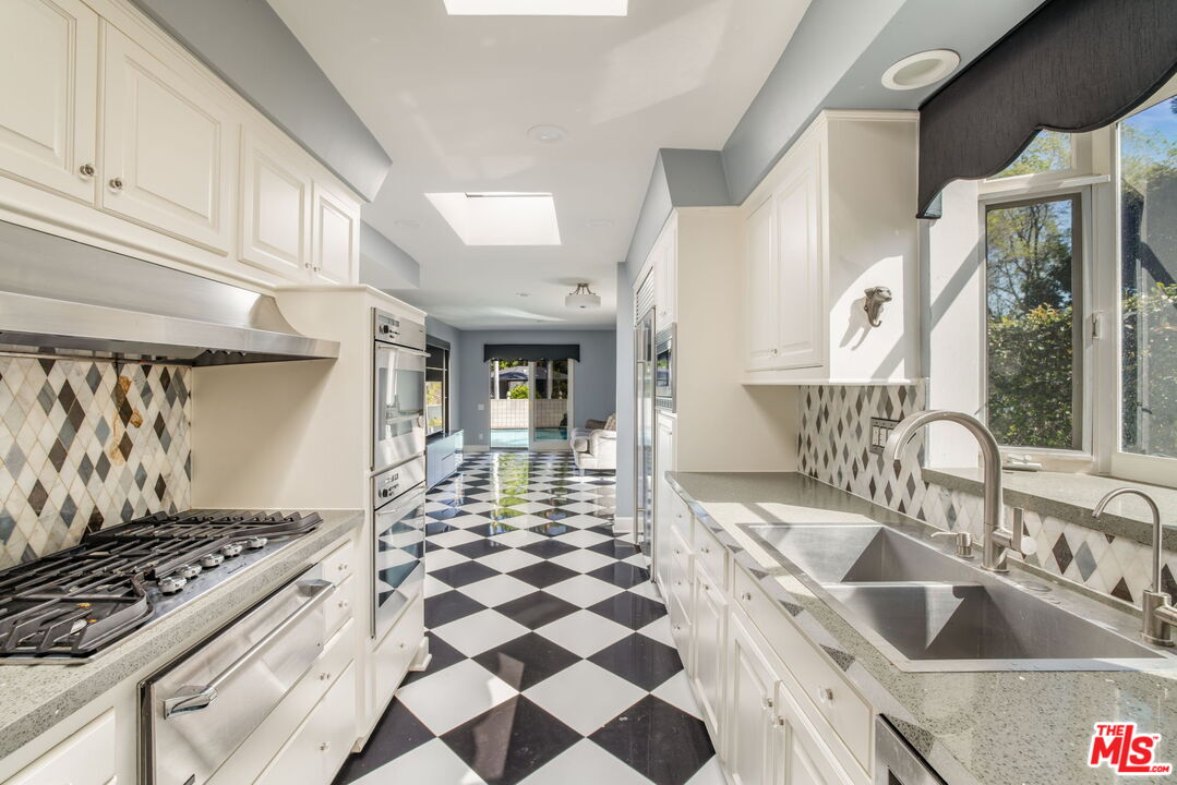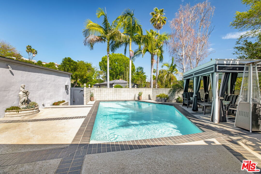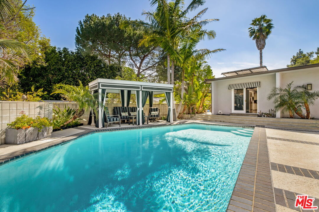 Experience the timeless allure of Mid-Century Modern design in this spectacular residence located in the coveted Royal Oaks enclave of Encino. Set in an idyllic, resort-like setting, the home blends architectural style with effortless California indoor-outdoor living. This exceptional retreat offers 3 bedrooms, 3.5 bathrooms, a dedicated office with direct access to the backyard, and a versatile bonus room off the pool with its own private entrance, ideal for guests, a studio, or gym. The beautifully appointed kitchen features Sub-Zero refrigeration, quartz countertops, and Miele double ovens, combining sleek design with top-tier functionality. Step outside to discover two expansive and private outdoor living spaces designed for entertaining and relaxation. Lounge beside the sparkling pool, unwind in the cabana, host elegant poolside gatherings, or dine alfresco beneath the stars in a setting that perfectly captures the spirit of California living. Modern comforts abound with security cameras, solar power, an advanced air-scrubber system, and water-conserving turf, offering both efficiency and peace of mind. Ideally located just moments from the Valley and Westside's premier shopping, dining, and entertainment, this home presents a rare opportunity to embrace a truly elevated lifestyle.