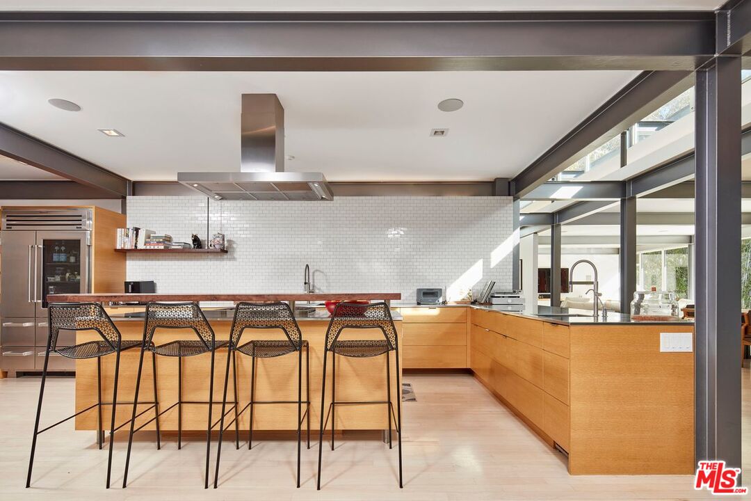 Situated on Alcima Avenue in Pacific Palisades, this tucked-back property exemplifies modernist design. Known as the "Abidi House," the residence exudes privacy. Originally designed by acclaimed architect James Tyler (FAIA), former principal architect for Craig Ellwood, the home has been thoughtfully updated for contemporary living. Embracing its natural surroundings, the property features floor-to-ceiling windows in true mid-century tradition. The entry level opens with an expansive foyer framed by windows, leading to a great room that seamlessly combines living and dining areas, all oriented toward views of the backyard and pool. A covered outdoor dining terrace extends the living space, while two ensuite bedrooms and a gourmet eat-in kitchen complete this floor. The lower level offers the home's private quarters, including a serene primary suite, two additional bedrooms with a shared bath, and a flexible media room or indoor gym. Each generously sized room is thoughtfully designed to capture verdant outlooks and maintain a strong connection to the lush backyard. Outside, the centerpiece is a sparkling pool with a built-in spa, contributing to the property's calm, retreat-like atmosphere. Owners have completed all necessary remediation work resulting from the fires and will provide documentation to confirm.
