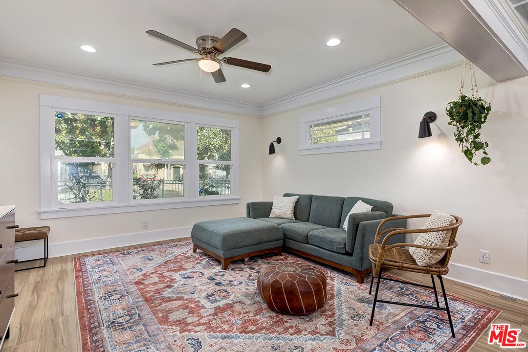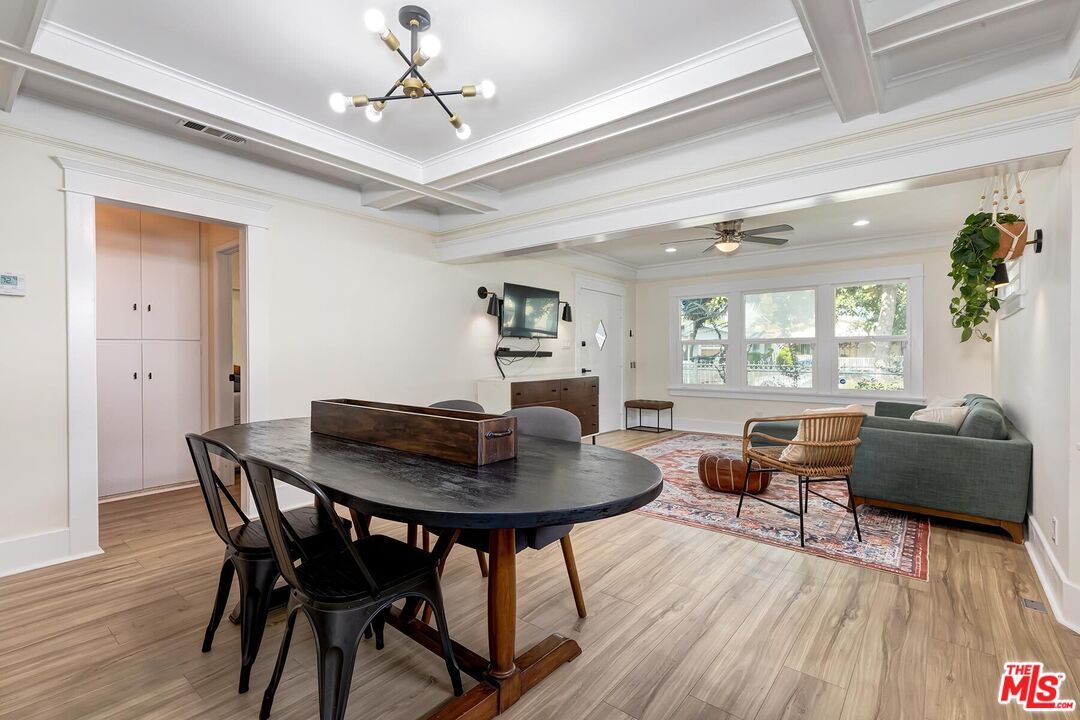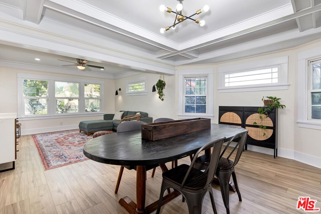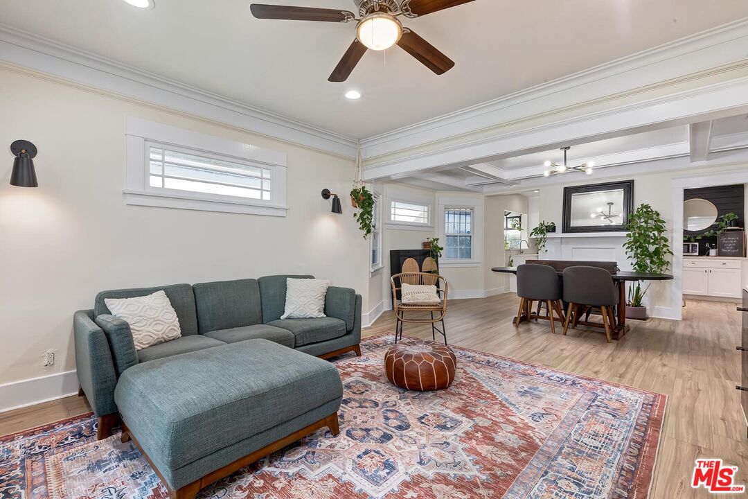 Beautifully Remodeled 1921 Craftsman on a Quiet, Tree-Lined Street! This charming home welcomes you with a classic covered wood porch and a gated front lawn, setting the tone for its warm curb appeal. Inside, the bright and airy living room features engineered hardwood floors, crown molding, recessed lighting, and large picture windows framing views of the peaceful neighborhood. The spacious dining room showcases a striking coffered ceiling, perfect for entertaining. The updated gourmet kitchen boasts new shaker cabinets, quartz countertops, and stainless-steel appliances. The stunning primary bathroom impresses with hexagon tile floors, floor-to-ceiling tilework, an oversized soaking tub, and a separate tiled shower. The stylish guest bathroom features marbled quartz counters and vibrant floor-to-ceiling sun-splash tile. The expansive backyard offers multiple spaces to relax and play, including a covered tile patio, grassy yard, brick barbecue, and a trampoline. A detached garage provides excellent potential for a home office, studio, or future ADU. Fantastic central location a mile west of USC, Exposition Park, the LA Coliseum, the Natural History Museum, the California Science Center, and the brand-new Lucas Museum of Narrative Art!