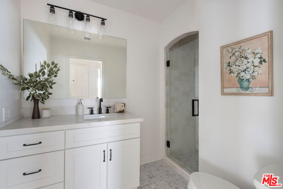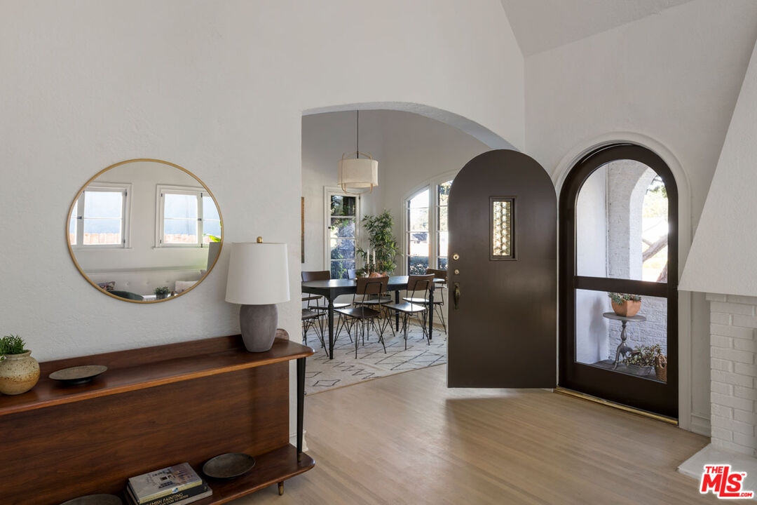Eagle Rock dreams come true with this updated Storybook Tudor on a leafy cul-de-sac, set on lush grounds with a detached studio. The luminous grand living room makes an indelible impression with cathedral ceilings; gorgeous details include restored period windows, arched passthroughs, detailed millwork, and warm hardwood floors. Chefs will love the reimagined kitchen, a light-filled space with custom cabinetry, stone countertops, premium fixtures, and stainless steel appliances. Both bedrooms are airy and spacious, and freshly updated bathrooms feature ceramic tile. A private, permitted studio retreat with its own 3/4 bath adds flexibility as a guest suite, creative atelier, or a gym. The terraced yard is dotted with serene entertaining zones, including an upper-level patio deck for starlit dining. Amenities include a detached garage, driveway, and central AC/heat. The location places you close to Trader Joe's, Sprouts, Milk Farm, Queen's Raw Bar, Eagle Rock Deli, Yellow Paper, and more.