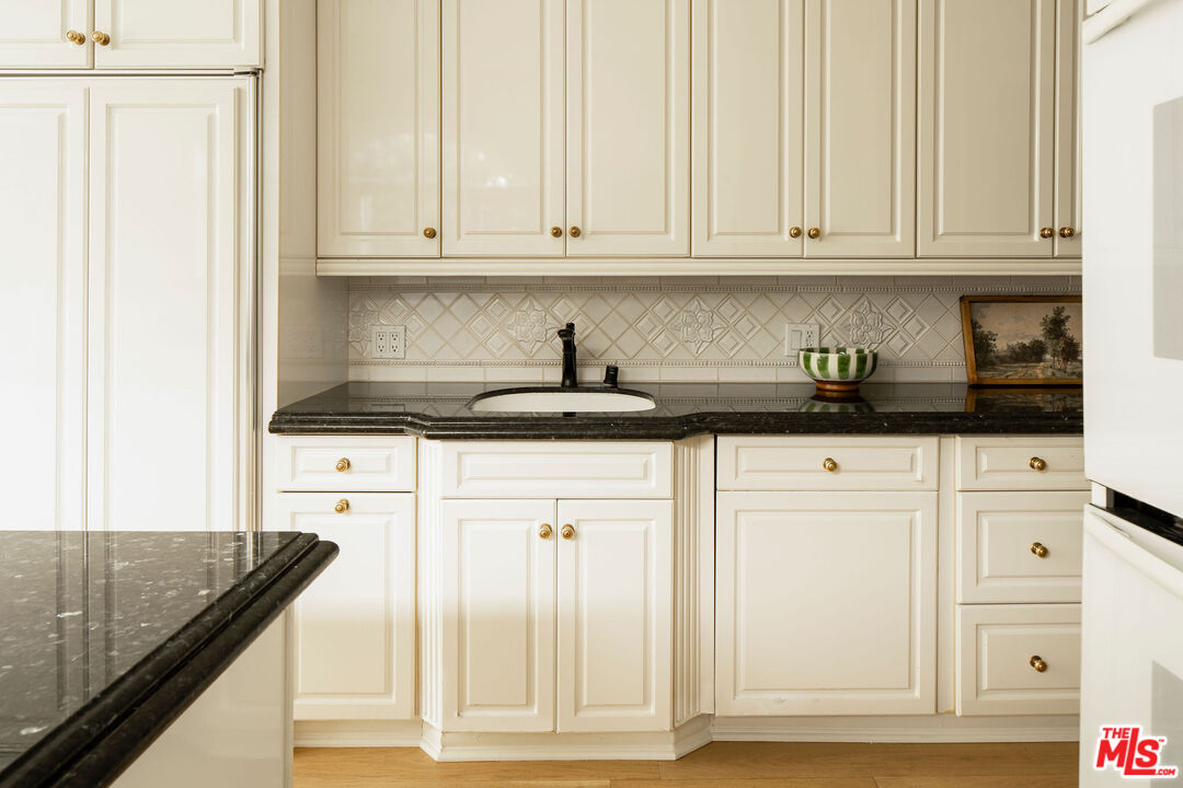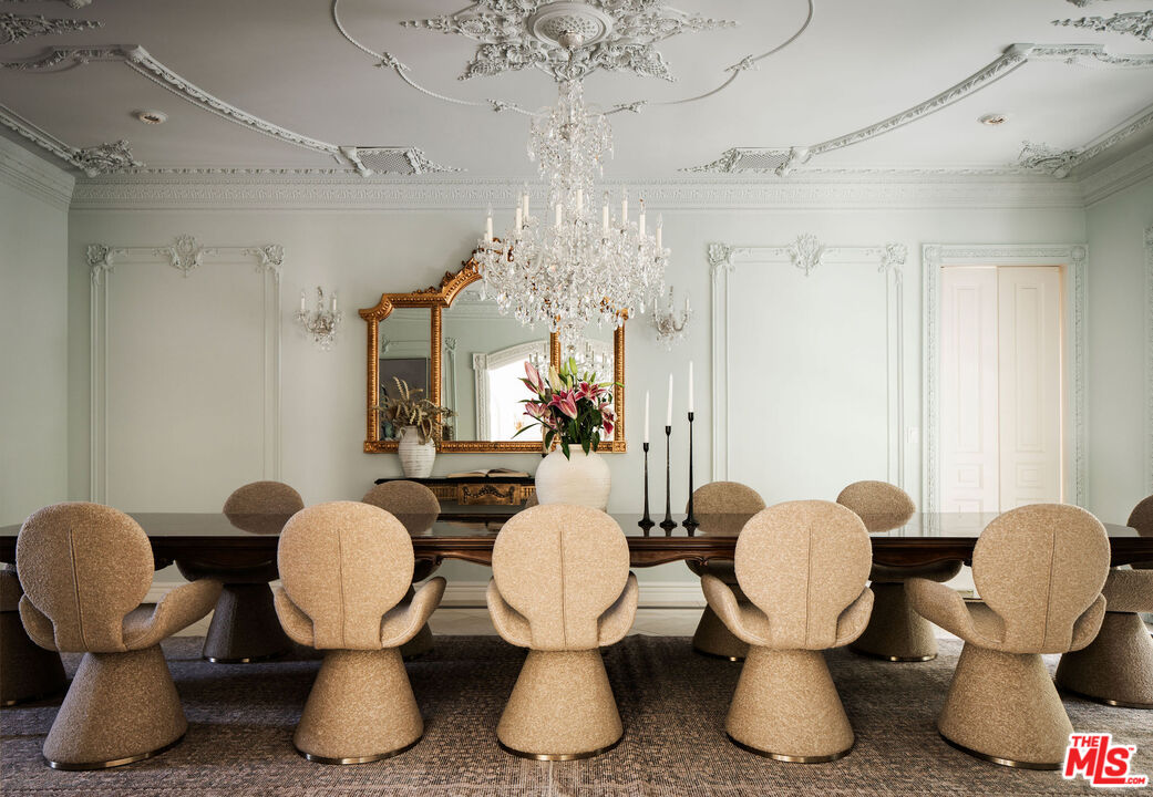 French Neoclassic Striking Prime Hancock Park Custom Home built from-the-ground-up in 2001 with 5 bedrooms + 5.5 baths, an amazing center hall plan with expansive rooms, high ceilings, intricate millwork, and lush grounds. Grand statement entry with 20 ft high ceilings, 10 ft high double front doors, dramatic double curved staircase with motorized sparkling crystal chandelier looks through dining room straight out to lush tropical backyard with palm trees, waterfalls, resort pool. Oversized formal dining room with architectural ornate molding opens with double doors to outdoor patio with pool, sun drenched formal living room with gas fireplace on one side, and kitchen/breakfast room on the other. Kitchen with center island, double sinks, double ovens, warming drawer, Sub Zero fridge/freezer has a breakfast room with beautiful windows to backyard with pool. The spacious elegant breakfast room overlooks the pool with radiused windows, and opens with doors to a newly tiled Jerusalem stone outdoor deck with built-in bbq. The yard with pool, built in 2004 and remote controlled, is an oasis with waterfalls, lush landscaping, spa, lounge deck. The living room has a grand piano and a roaring gas fireplace. The great big family room has built-in bookcases and TV, and a full wet bar. Powder room and laundry room down. One bedroom suite downstairs currently staged as an office. Upstairs, the grand oversized primary bedroom has new white oak floors, statement fireplace, large deck overlooking the pools and waterfalls, 5 closets, and a large en-suite bath with toilet closet +walk-in shower + sunken spa tub + skylight + double vanity with sinks. Three secondary bedroom suites upstairs with generous closets and full baths. Thoughtful storage space includes double deep storage closets under each staircase, coat closet, and an upstairs hallway closet for storage. 10 ft hi ceilings downstairs and 9 ft upstairs, Pella double paned windows, three zones HVAC - 1 downstairs, 1 primary bedroom, 1 rest of the upstairs, smart alarm system, new industrial hot water heater, 8 foot high solid interior doors throughout. Built by an esteemed Hancock Park family for themselves and true pride of ownership!