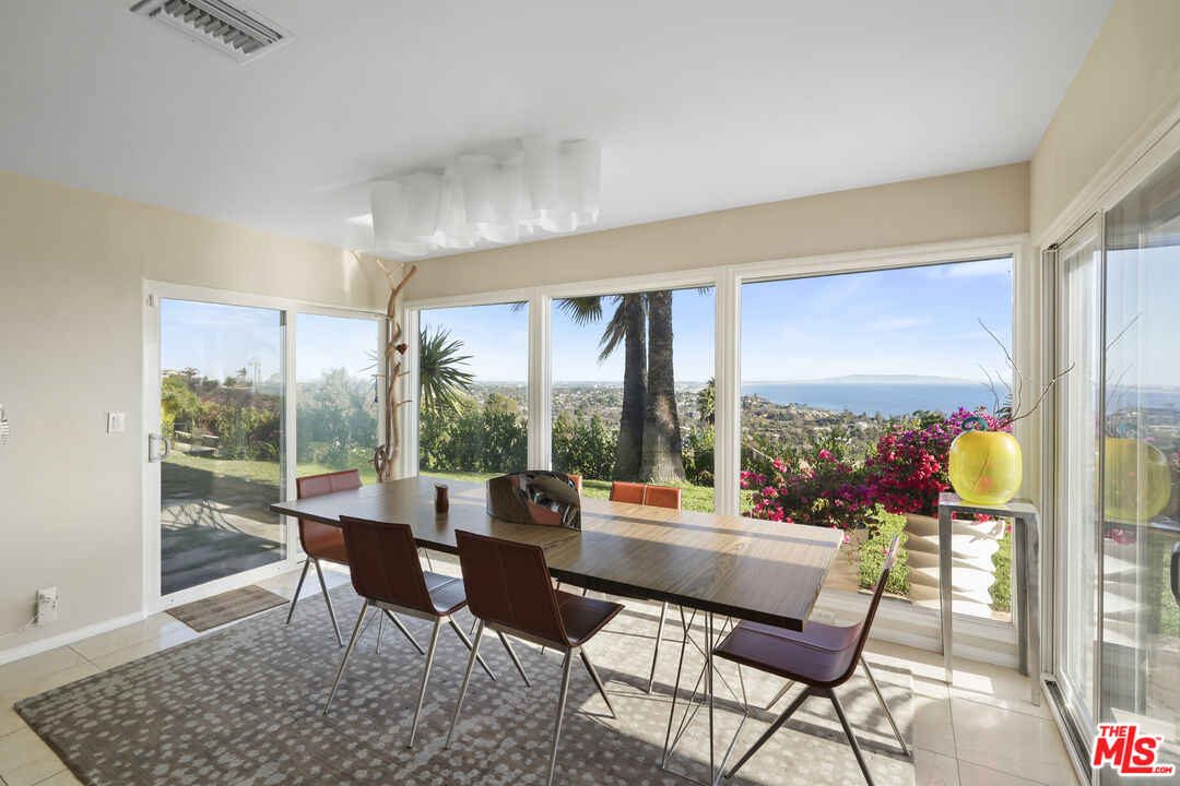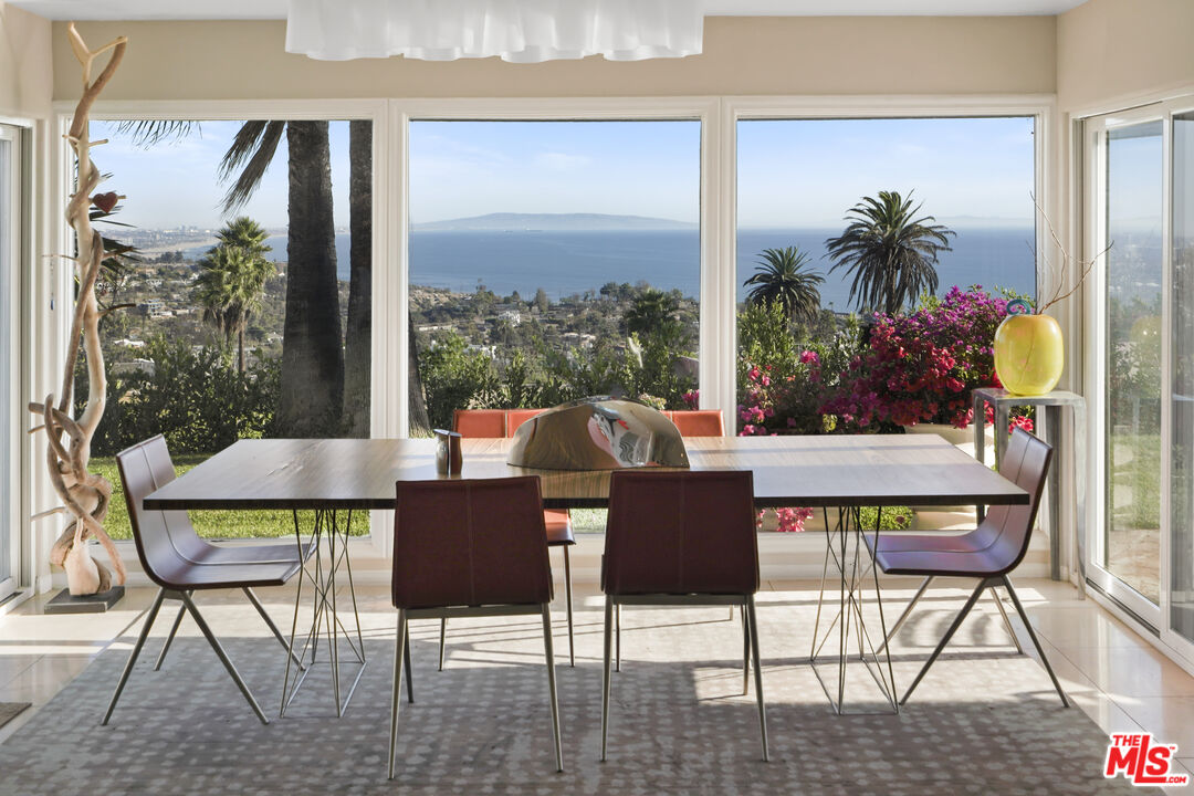 This incredible single-level modern Mediterranean showcases unobstructed 180-degree views of the ocean, coastline, Catalina, and shimmering city lights from nearly every room. Perched on a quiet cul-de-sac, the residence combines spectacular vistas with privacy, elegance, and a highly desirable layout. Set on approximately 9,800+ sq. ft. lot with an expansive 100-foot-wide backyard with a gorgeous pool and spa. The home spans approximately 2,900+ sq. ft. of living space. It features 4 bedrooms, 3.5 baths, plus a dedicated office space, also a large den with a wet bar. The interiors are appointed with gorgeous mahogany floors, a decorative working fireplace, redone bathrooms (one with steam shower), and a large gourmet kitchen with a dining area overlooking the yard and ocean beyond.The primary suite is a true retreat, offering breathtaking ocean views, a spacious walk-in closet, luxurious bathroom and direct access to the outdoors. The seamless indoor-outdoor flow extends to multiple entertaining spaces: a grassy yard, hardscaped patio, side yard with built-in BBQ for al fresco dining, and set against total privacy. Home is offered fully furnished, with some of the artwork included. This is a turn-key opportunity to enjoy the Palisades lifestyle immediately. Priced just above land value and sold in as-is condition, the property provides both present-day comfort and tremendous potential to reimagine to your own style. A truly unique residence where privacy, elegance, and some of the most captivating views in Los Angeles come together.