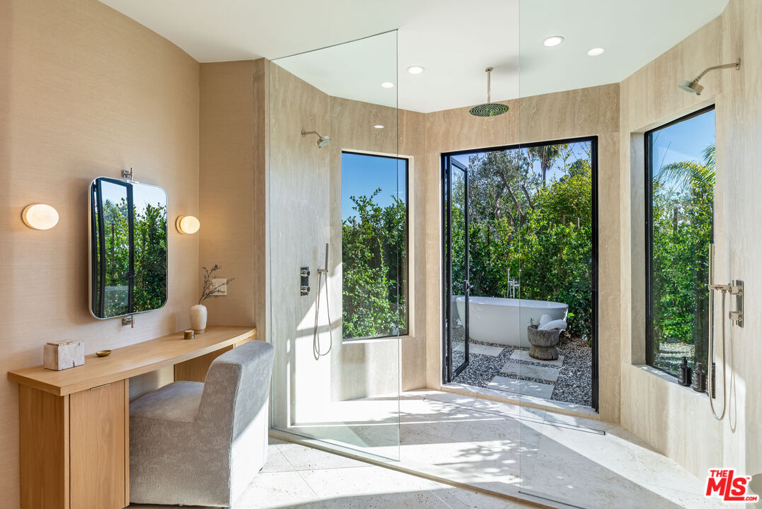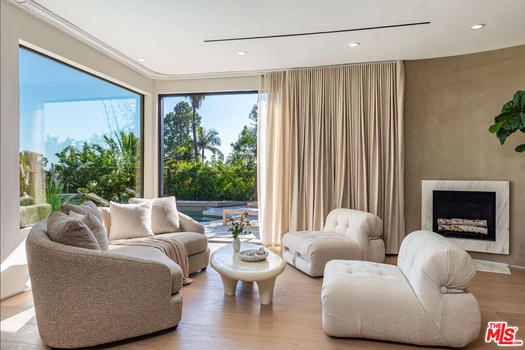 Welcome to this Amangiri inspired home that captures the spirit of desert tranquility, creating the ultimate oasis in the heart of the Trousdale Estates. Set on a private promontory along one of the neighborhood's most desirable streets, the home blends effortlessly with its surroundings, offering both timeless appeal and refined comfort. A fully private gated entry opens to a long, olive treelined driveway leading to a spacious motor court. Beyond the grand 12-foot pivot door, light-filled interiors span more than 6,300 square feet of living space, defined by clean lines and natural textures. Warm tones of wood, marble, and travertine bring depth and sophistication to every space. With six bedrooms, nine bathrooms, and impeccable craftsmanship throughout, this residence offers the perfect blend of privacy, elegance, and modern indoor/outdoor California living. The open floor plan flows easily through the main living areas, where a dramatic, double-sided fireplace anchors the living and dining rooms. A comfortable library lounge connects to the chef's kitchen and extends seamlessly outdoors, striking an ideal balance between openness and retreat. The primary suite features dual walk-in closets and bathrooms and opens directly to the backyard oasis. The backyard is a private escape of its own with an expansive grassy pad, a large terrace, a sleek infinity pool, and sweeping views of the city skyline, Century City, the Santa Monica Mountains, and the ocean. This is a one-of-a-kind trophy property with the finest finishes, attention to detail, and quality in the heart of Beverly Hills.