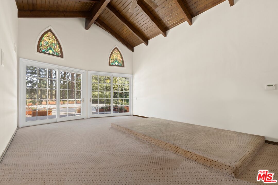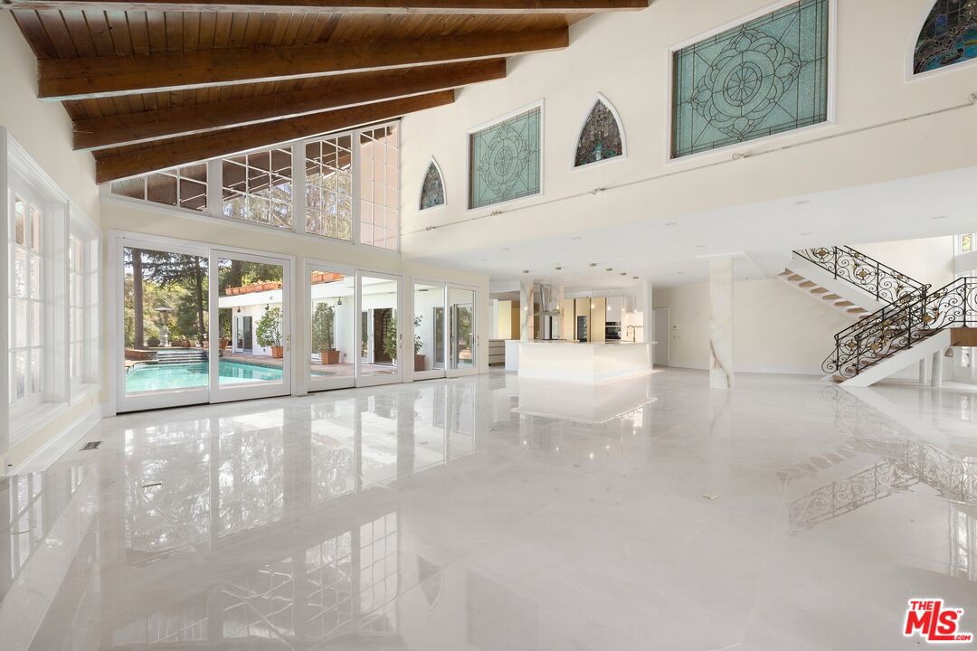 Perched atop prestigious Bel Air with sweeping views over the Stone Canyon Reservoir, this newly reimagined architectural retreat blends timeless design with refined modern luxury. Tucked near the end of a private cul-de-sac, the estate offers exceptional tranquility, privacy, and seamless indoor-outdoor living. A dramatic grand living room with soaring vaulted wood-beamed ceilings, a statement fireplace, and walls of glass opens effortlessly to the expansive grounds, creating an ideal setting for both intimate gatherings and large-scale entertaining. Curated stained glass installation sourced from St. Paul Church introduces a sense of heritage and artistry, casting beautiful natural light and adding a distinctive architectural narrative. The adjacent designer kitchen is a true showpiece, featuring exquisite Italian marble surfaces, custom cabinetry, and a full suite of gold Miele appliances, all anchored by an oversized center island. The formal dining room is elevated by a rare and storied focal point, an original piece from the legendary Chasen's Restaurant bringing a touch of Hollywood history and timeless glamour to the space as well as throughout the home with additional Chasen's windows. The upper-level primary suite is a serene sanctuary overlooking the reservoir, complete with a spa-inspired bath offering dual vanities, a sunken soaking tub, separate glass-enclosed shower, and a private sauna. An expansive walk-in closet also ideal as a dressing room or additional flex space completes the suite. Downstairs, four generously sized ensuite bedrooms provide comfort and privacy, complemented by a dedicated office, powder room, and private housekeeper's quarters. Outdoors, the tranquil grounds evoke a resort-like atmosphere, featuring a sparkling pool, multiple lounge areas, and a dramatic 20+ foot fire pit, an inviting focal point for evening gatherings. A built-in BBQ enhances the outdoor entertaining experience, while a terraced fruit garden just below the main yard offers an array of mature trees, including pomegranate, mango, avocado, and more. A rare offering combining scale, sophistication, and one of Bel Air's most coveted and peaceful vantage points.