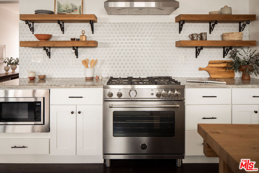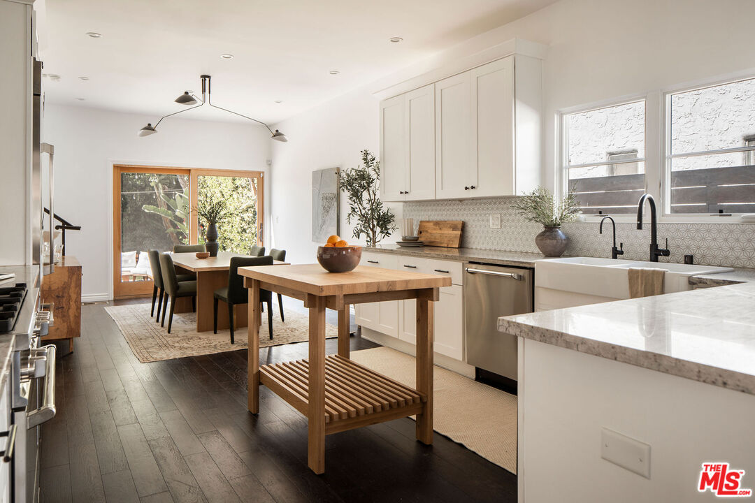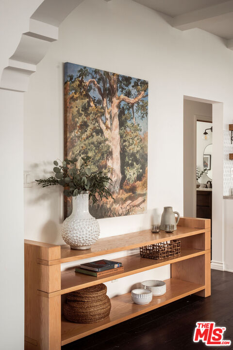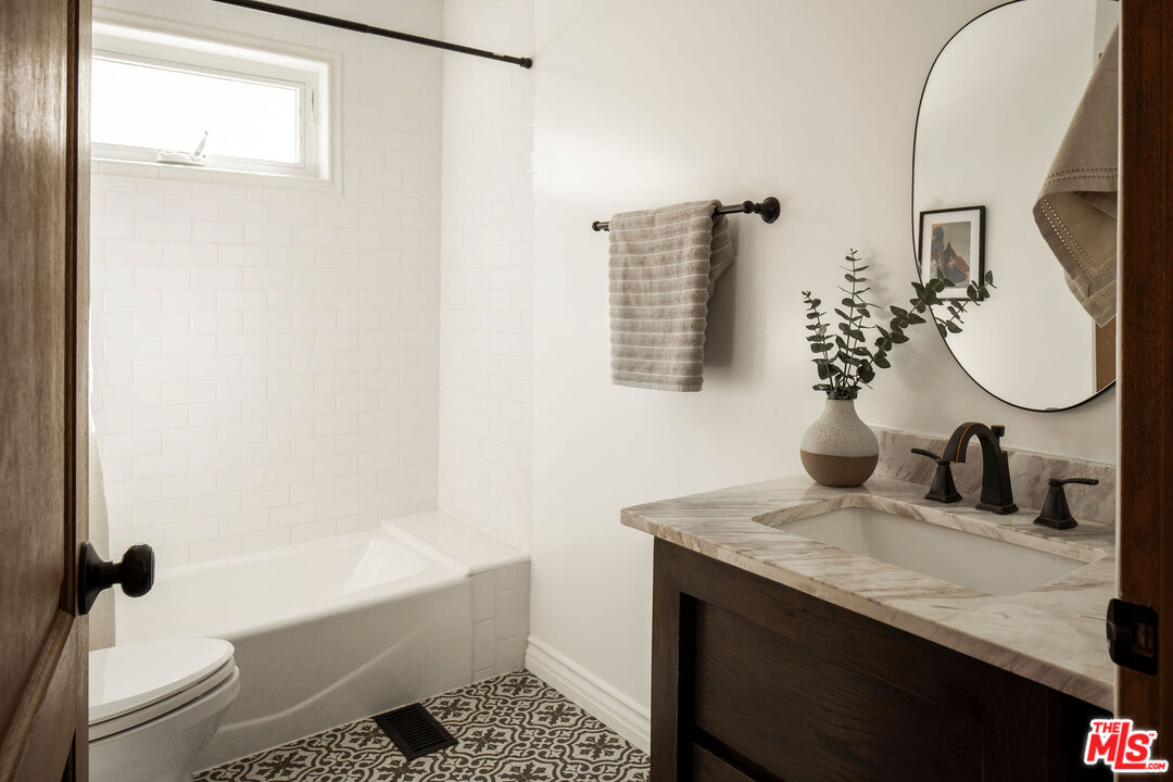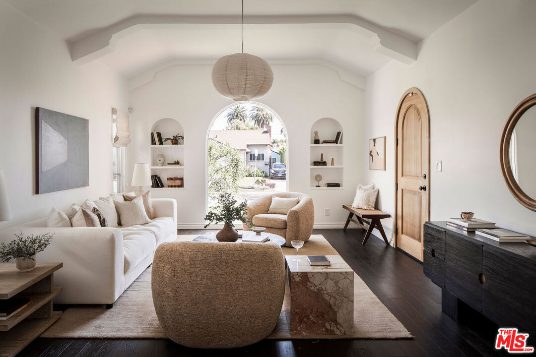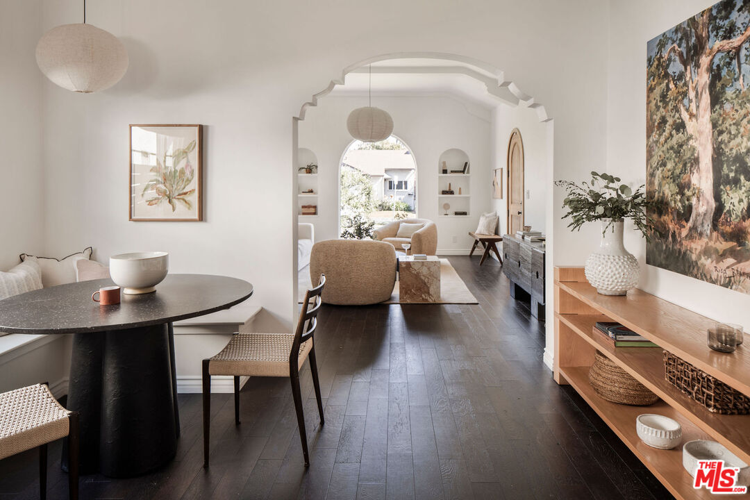 Tucked into the charming and sought-after pocket of Picfair Village one of Mid-City Los Angeles' most beloved neighborhoods this beautifully reimagined 3 bedroom 3 bathroom Spanish home blends timeless character with thoughtful modern updates. An inviting front porch welcomes you into a light-filled living room anchored by a striking fireplace and framed by soaring beamed ceilings that create an incredible sense of volume. Classic arched windows pour in natural light, highlighting the architectural details that give the home its warmth and charm. Just off the main living space, a cozy breakfast nook with a built-in banquette offers the perfect place for morning coffee or relaxed meals. The kitchen serves as the true heart of the home, thoughtfully designed with ample storage and a layout that makes everyday cooking and entertaining effortless. Toward the rear of the home, the dining area provides a lovely setting for gatherings and opens through wood sliders to the backyard, creating seamless indoor-outdoor flow. Two comfortable bedrooms are located on the main level, including one with an en-suite bath. Upstairs, the private primary suite offers a peaceful retreat with lovely natural light and windows that overlook the surrounding neighborhood and city beyond. Once outside, the backyard has been tastefully landscaped to create a tranquil escape perfect for relaxing or hosting friends. A finished garage with a mini-split system provides versatile bonus space ideal for a home office, gym, studio, or creative workspace. This is a rare opportunity to own a beautifully updated Spanish home in such a special neighborhood surrounded by character homes, a growing collection of restaurants, and a strong sense of community.