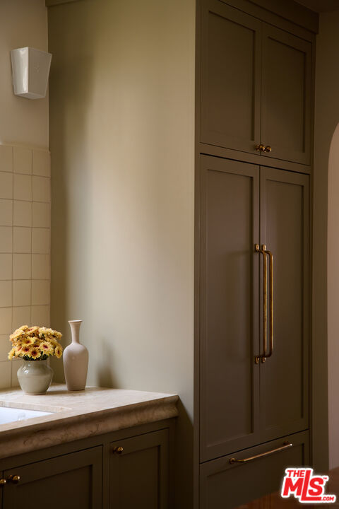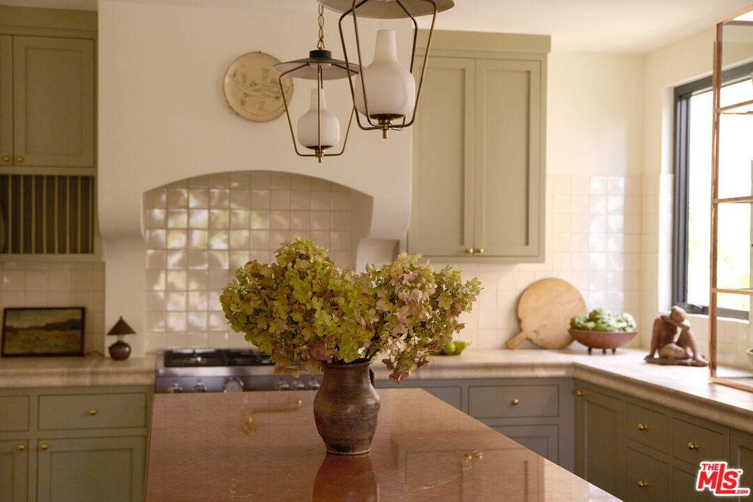 Timeless design meets romantic restoration in this 1920s Spanish, located minutes from Pasadena's character-rich, Bungalow Heaven. Reimagined by Studio Marrant over the course of a year-long renovation, this 3-bed, 2-bath home effortlessly combines old world elegance with modern updates and beautiful workmanship. 1764 E. Orange Grove inspires peace and serenity grounded by original wood details, honed travertine, handmade tiles, bespoke cabinetry, and abundant natural light. A pathway through mature rosemary bushes and native plants usher you into the living room with coved ceilings and newly reconstructed gas fireplace. Carefully restored arched wood windows frame sweeping views of the San Gabriel Mountains in the distance, turning pink at dusk. In the evenings, the home glows with thoughtfully curated vintage and custom light fixtures. Off the dining room, an updated kitchen inspired by European charm, is outfitted with high-end appliances and fixtures, including Bertazzoni oven, Fisher/Paykel refrigerator, Rohl brass faucets, custom cabinetry, luxe marble countertops and graciously sized center island. From the hallway, two bedrooms with generous closet space, lead to a Pinky's iron Dutch door looking out on the private, flat yard. The ensuite primary evokes feelings of a Mediterranean retreat, with a vintage Barvoier & Toso glass pendant hanging over the deep soaking tub, surrounded by oak custom cabinetry and concretta plaster walls. A second set of Pinky's iron doors open to a patio with ORCA tiles and custom metal work, ready for morning lounging and an evening apertivo. Wander outside, through citrus and pomegranate trees, following a stone pathway to garden boxes and a garage with alley access. Located in one of Pasadena's most desirable neighborhoods, moments from local cafes (Woon, Millie's, Deluxe 1717), parks, and the charm of Old Town. This home is a rare opportunity to experience historic character, considered design, and quality craftsmanship.