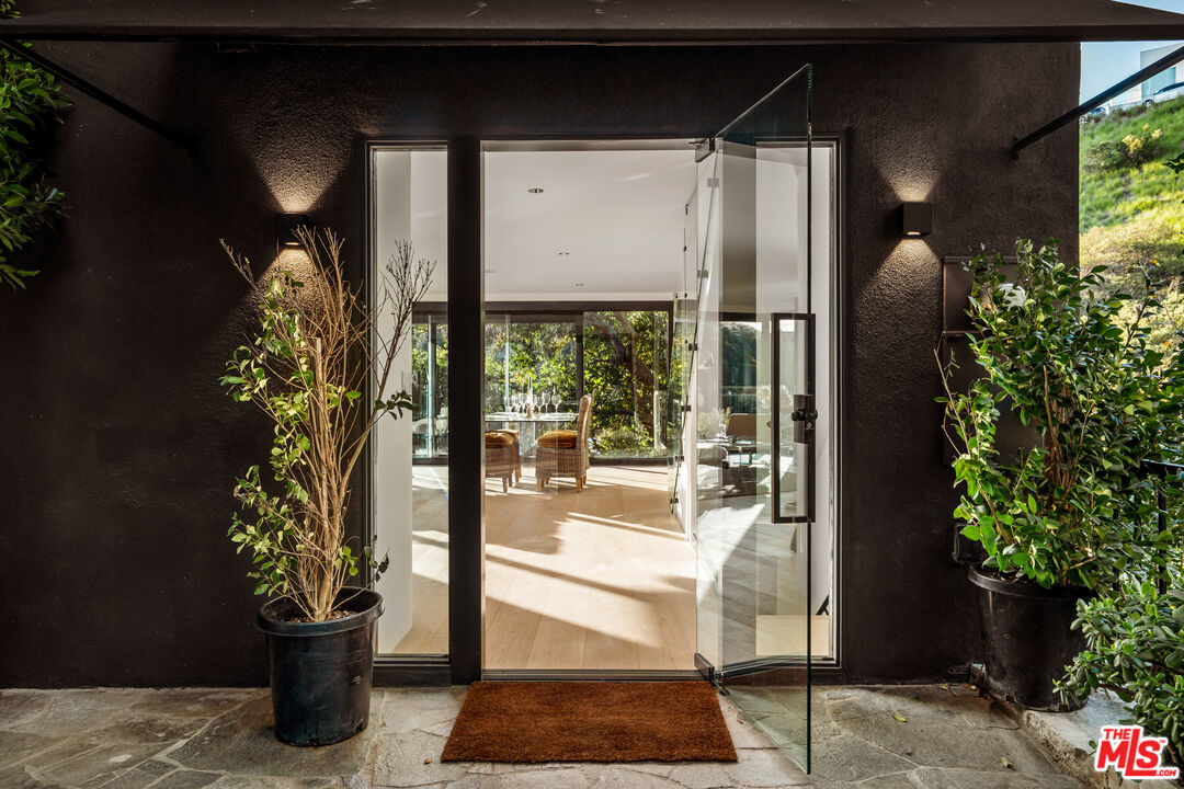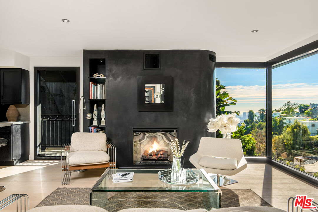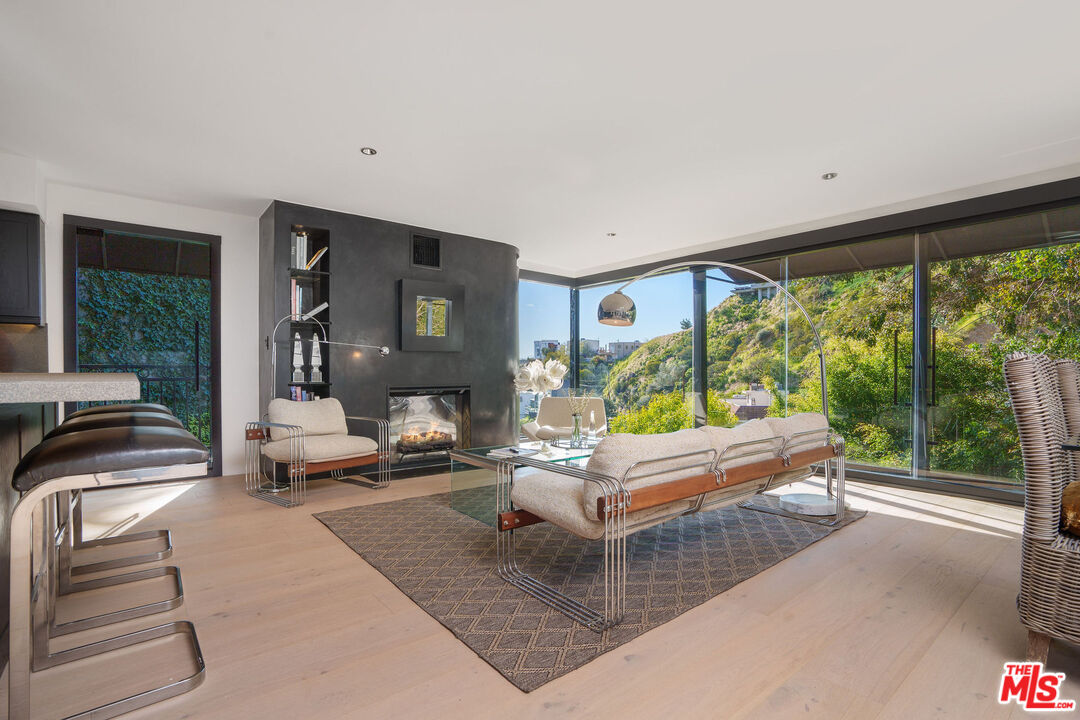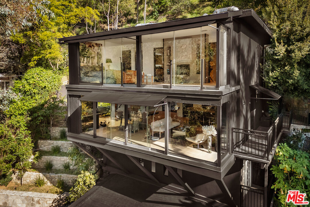 Gated, Floor to Ceiling, Glass-Wrapped Architectural Sanctuary with City and Ocean Views, Rare Outdoor Living Above Sunset Plaza! Floating high above Sunset Plaza, this newly reimagined, iconic architectural, 2 primary suite, 4 bath, plus permitted Junior ADU, residence by Roger Davis is a rare expression of glass, light, and elevated living in the Hollywood Hills. Privately gated, with 2+ parking and set beyond a dramatic arrival, inside, the architecture unfolds with intention. Wide-plank floors guide you through expansive living spaces wrapped in floor to ceiling glass, capturing breathtaking city lights and ocean views that shift beautifully from sunlit days to glittering nights. A striking glass staircase serves as a sculptural centerpiece, allowing natural light to flow effortlessly between levels and enhancing the home's airy, gallery-like feel. The newly remodeled open kitchen blends refined design with modern functionality, perfectly positioned for elevated entertaining and everyday living. The main residence features two full, large primary suites, each conceived as a private sanctuary with walk-in closets, spa-inspired baths, and dramatic walls of glass framing the skyline. Washer/dryer hookups on every level add an uncommon layer of comfort and convenience. What truly distinguishes this home is its exceptional outdoor living, a rarity in the Hollywood Hills. A large, grassy, flat yard, with additional outdoor seating areas, and a private balcony create a resort-like setting ideal for entertaining, lounging, or quiet moments above the city. An attached junior ADU with its own private entrance, bedroom, and bathroom offers remarkable flexibility for guests, creative use, or income potential, all while remaining seamlessly integrated into the architecture. Bold, refined, and unmistakably iconic, this Roger Davis creation is more than a home, it is a statement of design, privacy, and elevated Los Angeles living. A must see!