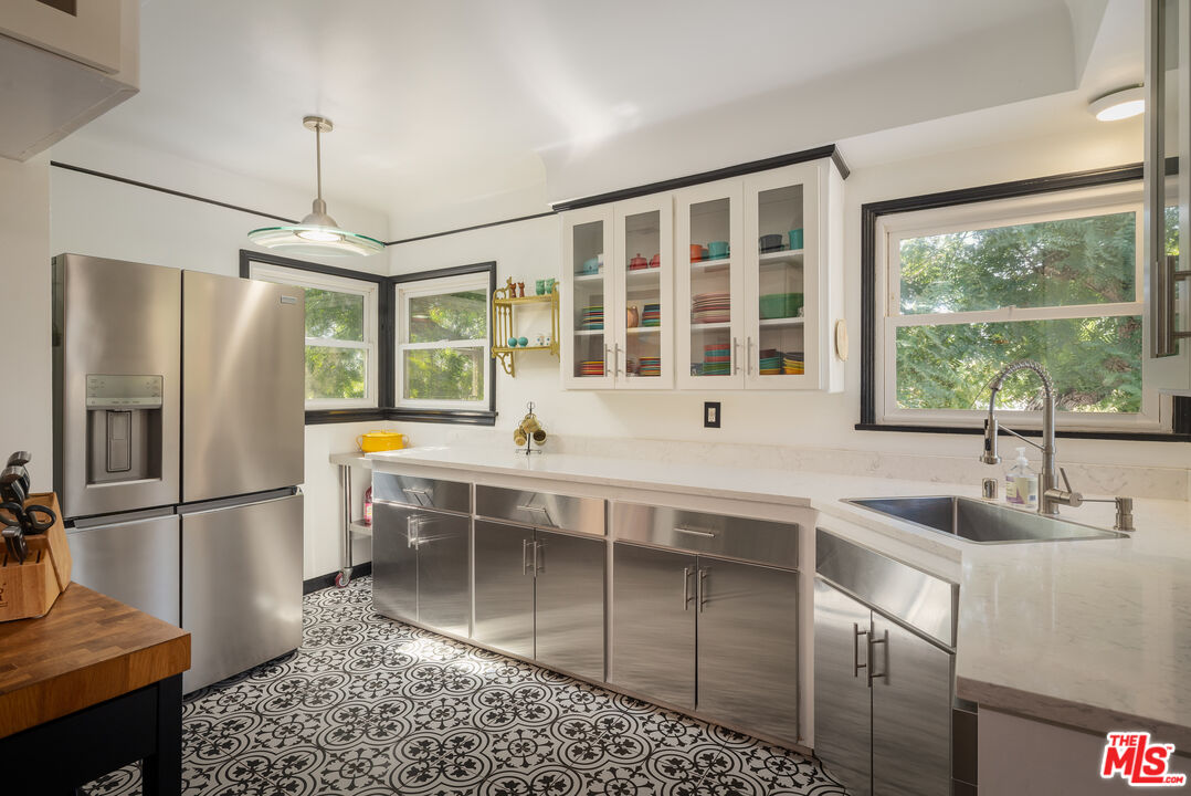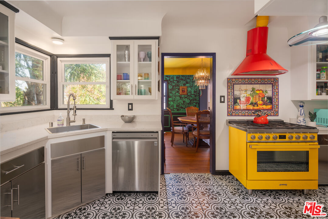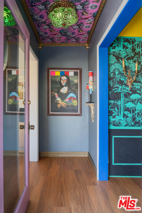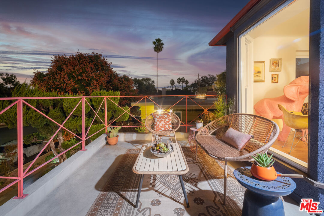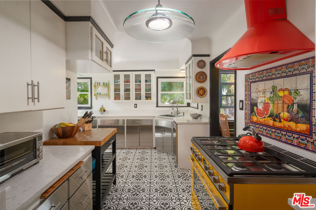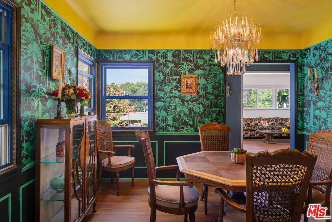 Hidden at the end of a quiet Mid-City cul-de-sac, 1812 S. Dunsmuir feels like an artist's retreat in the middle of Los Angeles. This cobalt-blue sanctuary offers 3 bedrooms, 4 baths, and over 2,300 square feet of effortlessly eclectic living where creativity, comfort, and design converge. Natural light fills the main level's airy living room, complete with high ceilings, fireplace, and city views that stretch into the distance. The eclectic dining room radiates sophistication, flowing into a remodeled kitchen with stainless steel cabinetry, new Smeg 5 burner Range with modern appliances and thoughtful details showcasing a love for cooking. Completing the upper floor are two en-suite bedrooms each framed with Shoji closet doors which provide serene symmetry, joined by a moody powder room with vintage inspired clawfoot tub and beautiful art deco wall paper. Downstairs, the expansive primary suite feels like your own hideaway, bold, bohemian, and tranquil with Moroccan-inspired textures and direct access from the garage. Outdoors, the property truly shines: dine beneath string lights on the private patio, unwind in the new jacuzzi under the stars, harvest herbs from your garden, or work in the most charming bonus office/workout space you'll ever see. And yes, on a clear night, you can even spot the Hollywood sign. Complete with new roof, flooring, jacuzzi, tankless water heater, HVAC and more, this home offers both style and substance. Located minutes from Culver City, the Westside, DTLA, and the beach, this home delivers the Eastside vibe you love, right in the heart of LA.