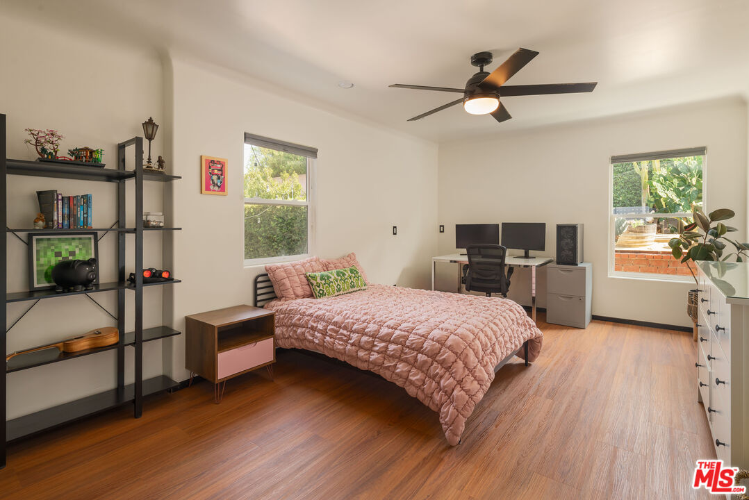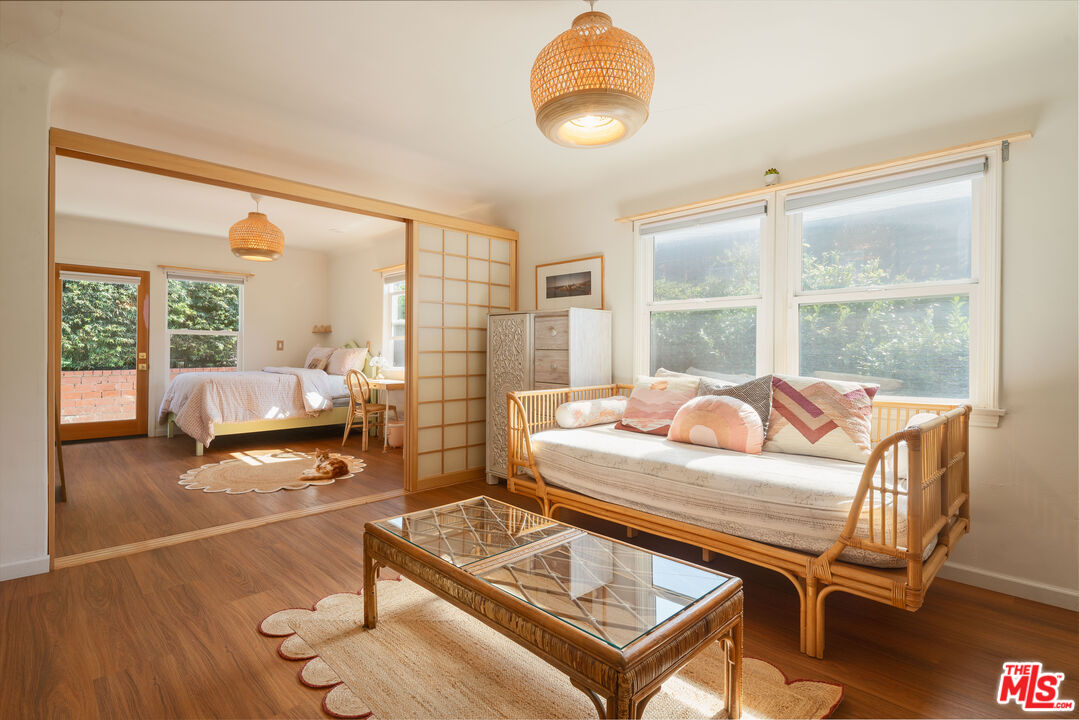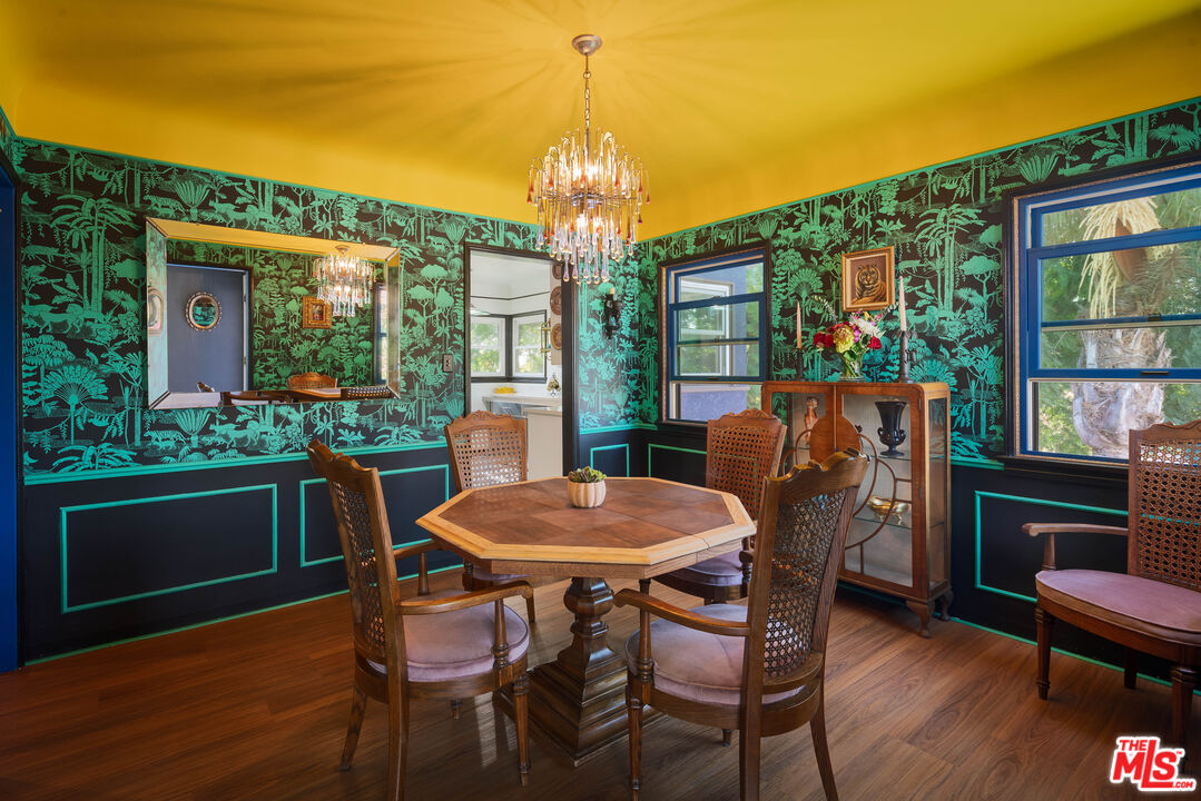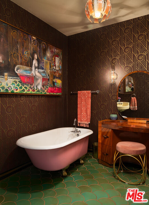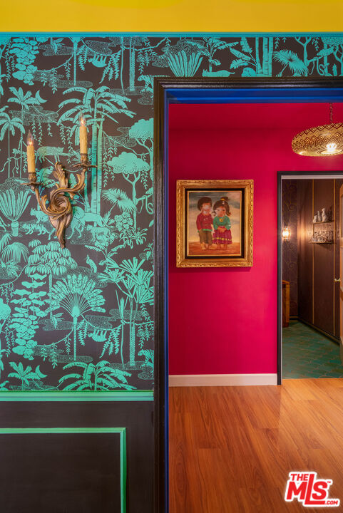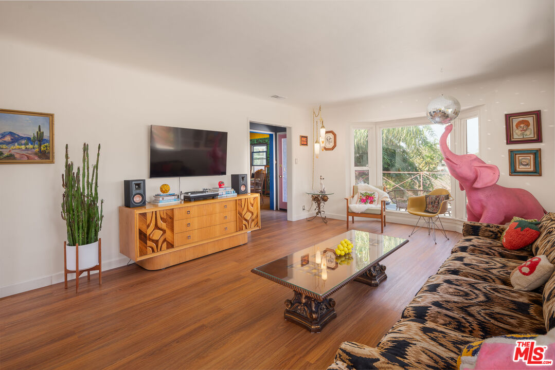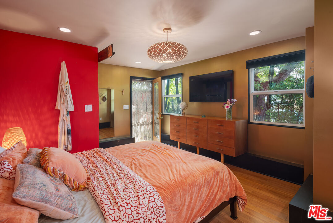 Hidden at the end of a quiet Mid-City cul-de-sac, 1812 S. Dunsmuir feels like an artist's retreat in the middle of Los Angeles. This cobalt-blue sanctuary offers 3 bedrooms, 4 baths, and over 2,300 square feet of effortlessly eclectic living where creativity, comfort, and design converge. Natural light fills the main level's airy living room, complete with high ceilings, fireplace, and city views that stretch into the distance. The eclectic dining room radiates sophistication, flowing into a remodeled kitchen with stainless steel cabinetry, new Smeg 5 burner Range with modern appliances and thoughtful details showcasing a love for cooking. Completing the upper floor are two en-suite bedrooms each framed with Shoji closet doors which provide serene symmetry, joined by a moody powder room with vintage inspired clawfoot tub and beautiful art deco wall paper. Downstairs, the expansive primary suite feels like your own hideaway, bold, bohemian, and tranquil with Moroccan-inspired textures and direct access from the garage. Outdoors, the property truly shines: dine beneath string lights on the private patio, unwind in the new jacuzzi under the stars, harvest herbs from your garden, or work in the most charming bonus office/workout space you'll ever see. And yes, on a clear night, you can even spot the Hollywood sign. Complete with new roof, flooring, jacuzzi, tankless water heater, HVAC and more, this home offers both style and substance. Located minutes from Culver City, the Westside, DTLA, and the beach, this home delivers the Eastside vibe you love, right in the heart of LA.