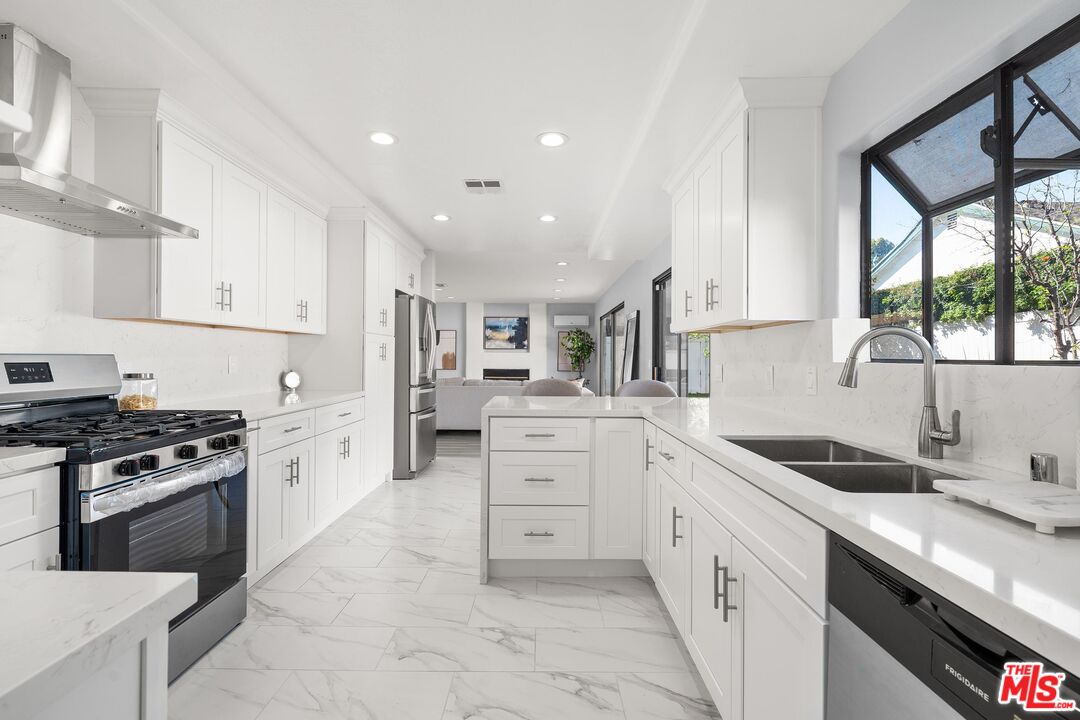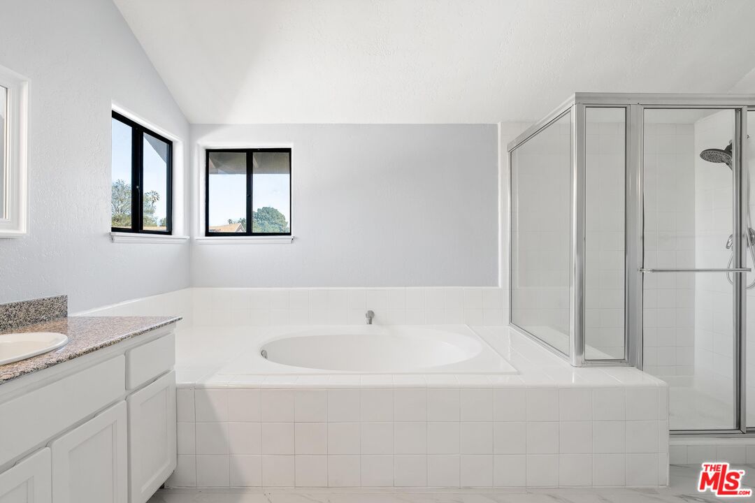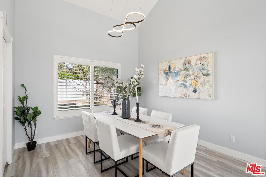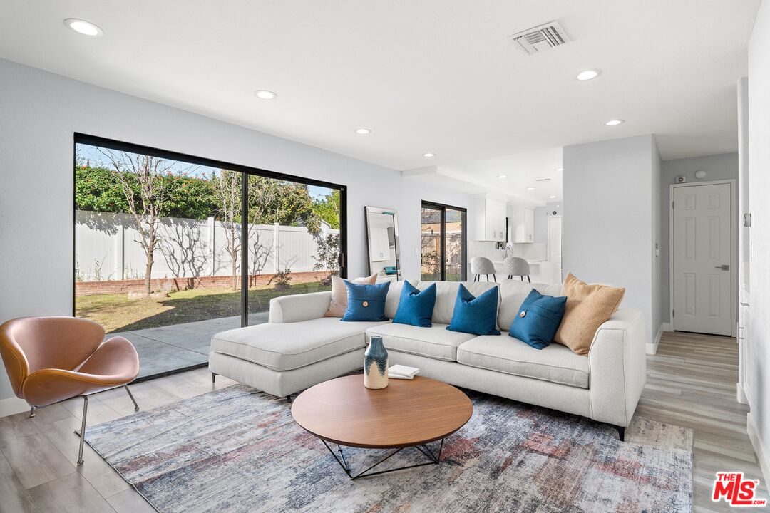 This charming two-story home situated in the heart of Northridge has been thoughtfully remodeled with modern conveniences while retaining its inviting charm. Spanning 4BD/3BA, the home features soaring ceilings, wood-style flooring, and a generous backyard with room for a pool. The spacious living room opens to a formal dining area, creating an ideal setting for gathering with family and friends. The adjacent kitchen is bright and functional, offering stainless steel appliances, sleek countertops, bar seating, and direct access to the backyard. The kitchen flows into an additional living area with sliding glass doors and a charming fireplace, creating a comfortable space for everyday living and entertaining. A bedroom near the entry, well suited as a guest room or home office, sits across from a full bathroom, completing the main level. Upstairs, three additional bedrooms await, including the expansive primary suite with a walk-in closet, additional sliding-door closet space, and an ensuite bath featuring dual vanities, a soaking tub, and a step-in shower. The secondary bedrooms share a full bathroom with dual vanities and a shower-tub combination. Outside, the spacious backyard offers lush landscaping for added privacy and room for a pool. Additional highlights include a gated driveway and a two-car garage with direct access. Conveniently located near the Northridge Fashion Center, California State University, Northridge, dining, public transportation, and major commuter routes, this beautifully updated home offers an ideal combination of space, functionality, and location.