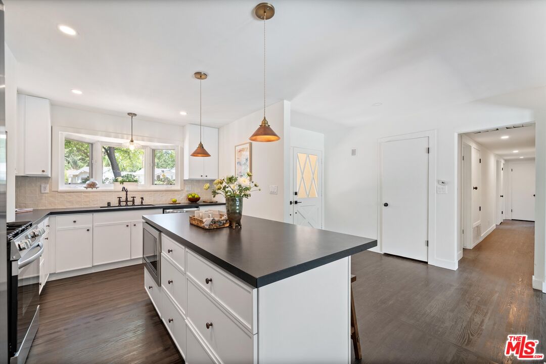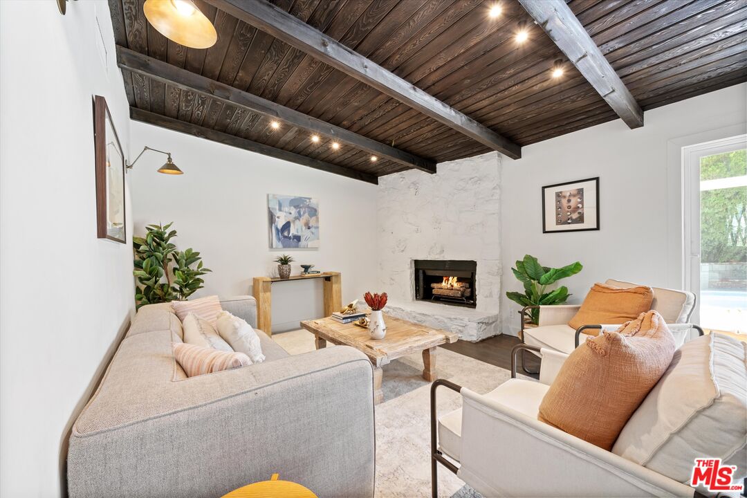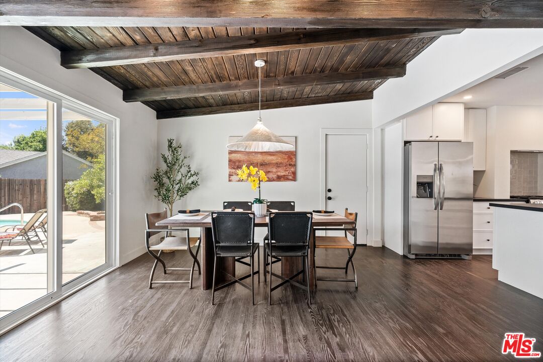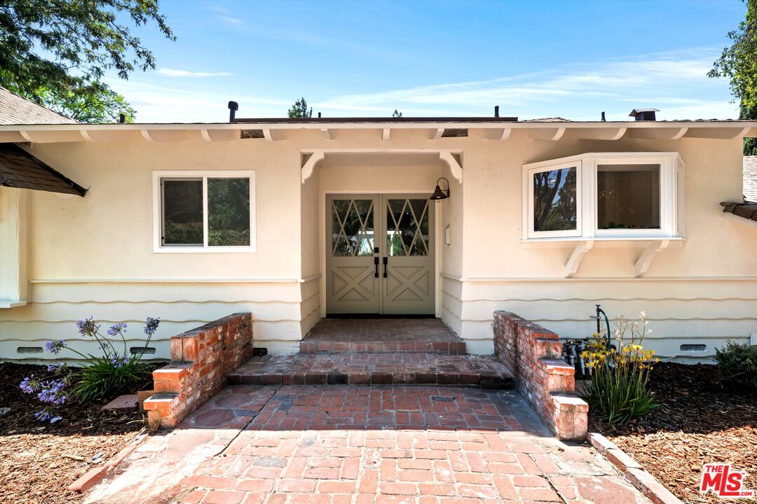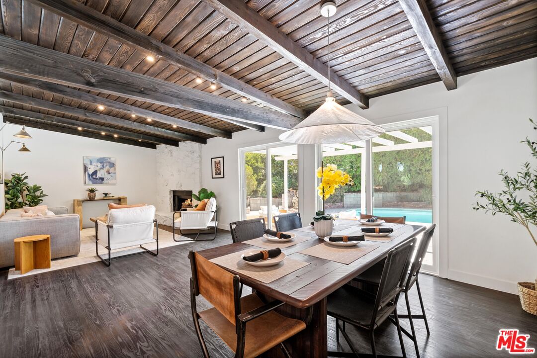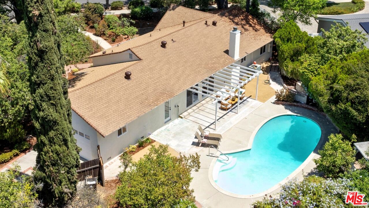 Beautifully remodeled ranch-style pool home on a picturesque corner lot in desirable Porter Ranch. This single-level residence blends timeless curb appeal with fresh, modern updates and an effortless indoor/outdoor flow. Inside, an airy great room showcases dramatic dark tongue-and-groove beamed ceilings, refinished wood flooring, and a whitewashed stone fireplace that anchors the space with character. Wide sliding glass doors usher in natural light and open directly to the backyard retreat. The dining area connects seamlessly to a showpiece, all-new chefs' kitchen crafted with sleek shaker cabinetry, richly hued quartz countertops, hand-set zellige-style backsplash, warm brass pendant lighting, a spacious island with seating and stainless appliances. The serene primary suite enjoys leafy views and a beautifully renovated en-suite bath featuring a double wood vanity, quartz counters, stylish sconces, and a large glass-enclosed shower lined with artisan tile. Two additional bedrooms are bright and generous, with ample closet space. Chic hallway bath echoes the home's curated palette with a long double vanity, matte black fixtures, and designer tile. Backyard features a sun-drenched sparkling pool, expansive patio for lounging and dining beneath an elegant white pergola, raised brick planters, mature landscaping, and tall hedges for exceptional privacy. All set on an expansive 11,000+ sq ft corner lot with multiple zones for play, gardening, and gatherings. A side decked gazebo adds another shaded nook, and the attached two-car garage plus driveway parking provide everyday convenience. Moments from parks, hiking trails, shopping, dining, this turnkey home delivers style, comfort, and charm in a prime location. THIS IS A MUST SEE!