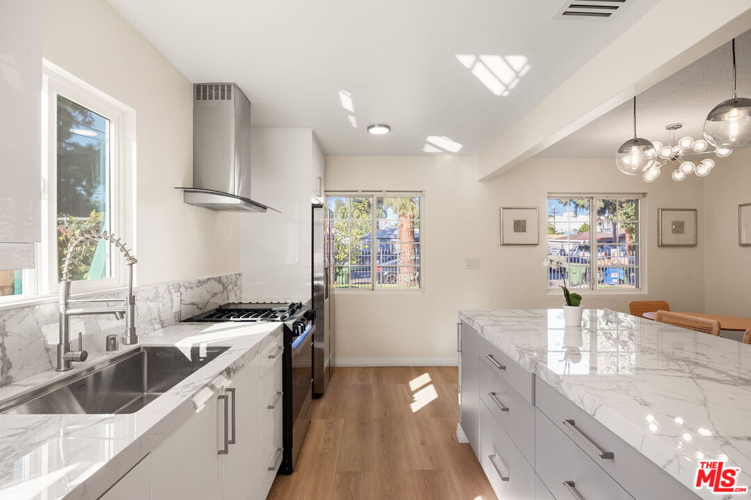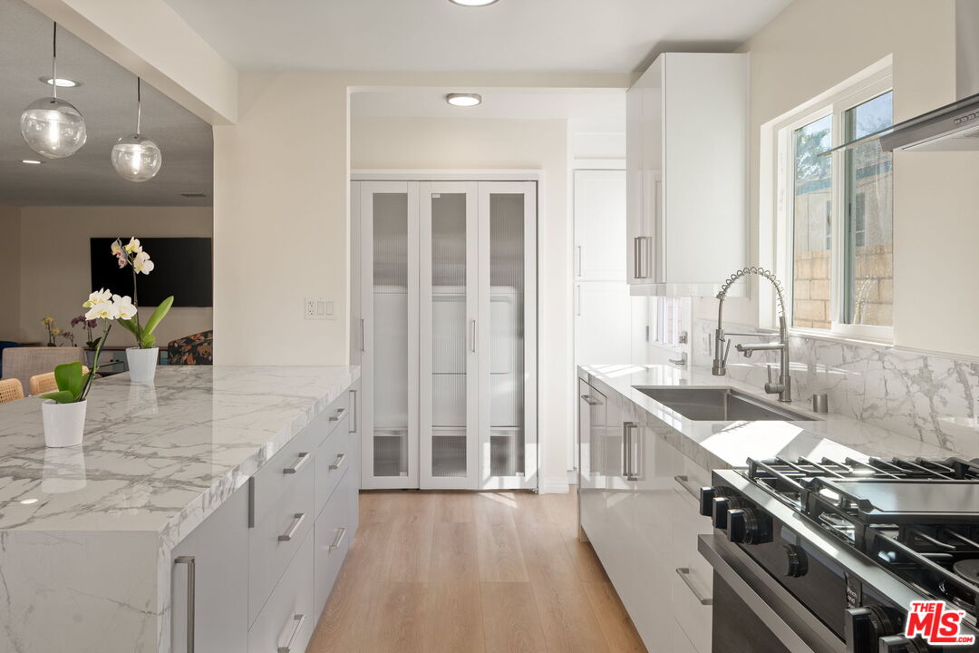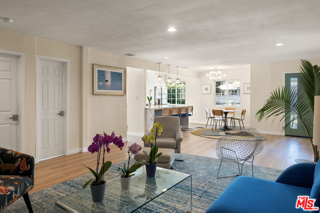 Experience the blend of privacy, modern design, and effortless California living in this beautifully updated single-story residence in the heart of Northridge. Behind a sleek gated entry and lush mature hedges, this renovated 3 bed, 2 bath home offers privacy and style. Step in to a Palm Springs state of mind as you enter through the statement sea-foam green front door, accented with vertical fluted glass panel that filters in natural light and sets the tone for this mid-century modern retreat. Inside, a bright open floor plan with new wide-plank flooring, designer mid-century modern light fixtures, and windows that fill the home with light. Enjoy brand-new kitchen cabinets, new countertops, and a full suite of never-been-used stainless-steel appliances including refrigerator, range, hood, and integrated dishwasher. Both bathrooms are refreshed with new vanities, modern LED-lit mirrors, and sleek new fixtures. The laundry area includes a new washer and dryer tucked away behind chic fluted glass doors. Outside, new turf and xeriscape landscaping for easy low-maintenance living, with mature trees and a spacious covered patio. Equipped with smart home technology, including a Ring doorbell, front and rear security cameras, and a smart entry lock, this home offers peace of mind and everyday modern convenience. Updated, stylish, private, and turnkey, this is southern California living at its best.
