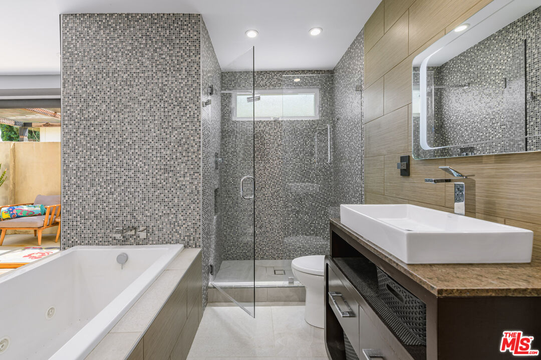 Beautifully renovated with designer details, this 3 bed / 2 bath home blends high-end finishes and thoughtful upgrades in a charming Valley locale. Featuring custom concrete walkways, serene water fountain, lush drought-tolerant landscaping and garden, Mexican river rock accents, and curated decking. The exterior includes smooth Santa Barbara stucco, an outdoor pool shower, custom accordion doors and pergola, iron gates, and Brazilian Ipe wood privacy fencing. Inside, enjoy real oak floors, South American porcelain tile, abundant natural light evoking an indoor-outdoor flow, and custom automatic blinds. The epicurean kitchen offers island seating, modern appliances, and open access to the formal dining room, with seamless transitions to al fresco dining by the pool. The primary suite boasts a spa-like bath with a Roman Jacuzzi tub, custom vanity, private outdoor seating, and stunning Missoni garden wallpaper. The backyard features a remodeled pool with Pentair system and an adjacent outdoor fire pit for relaxed evenings. The detached 2+ car garage, with epoxy floors and dual doors, offers ideal flex space for a gym, office, or creative studio. A true gem with exceptional private outdoor living, this home is a perfect combination of original architectural integrity and resort-style design. Close to The Vineyards at Porter Ranch, Fashion Center shopping, dining, entertainment, fitness, and local award-winning schools! Welcome home.