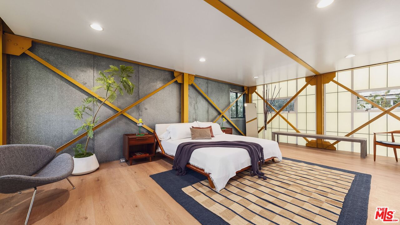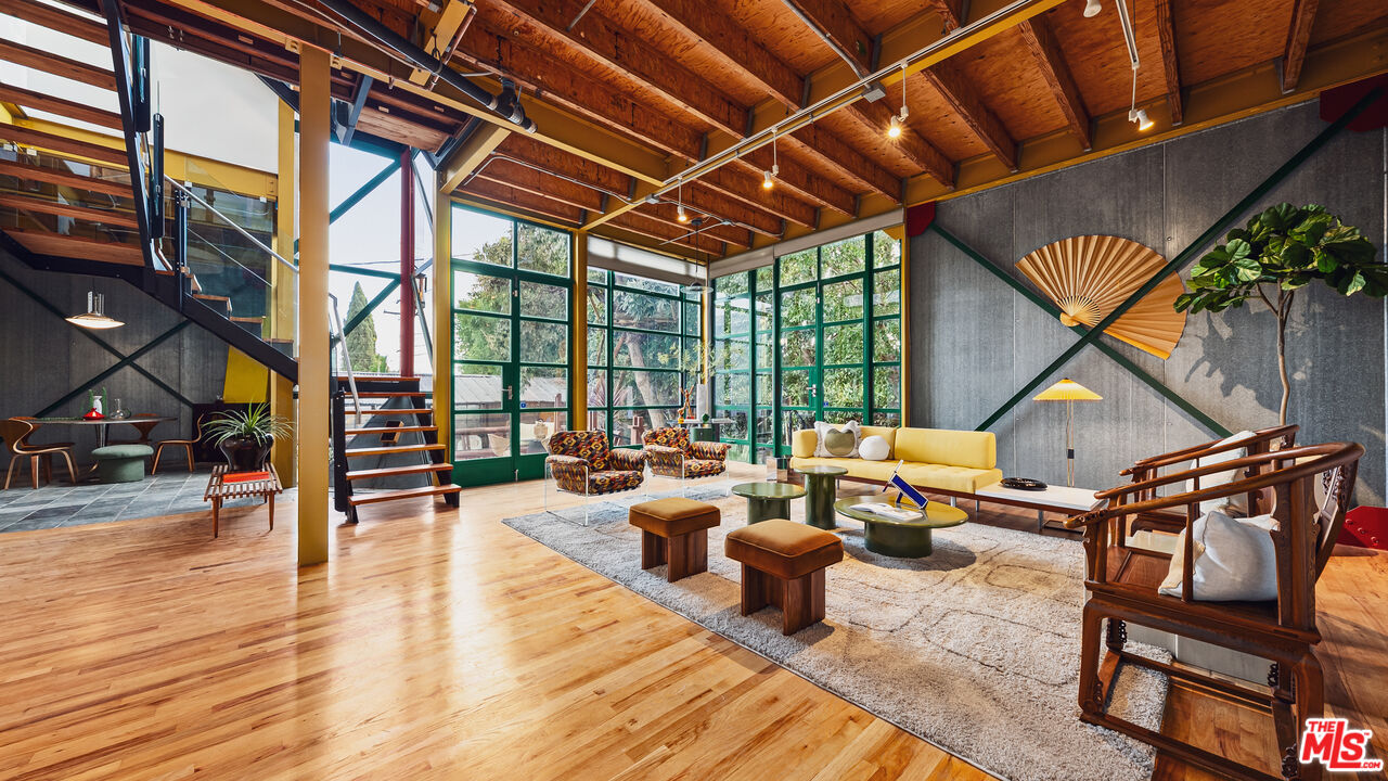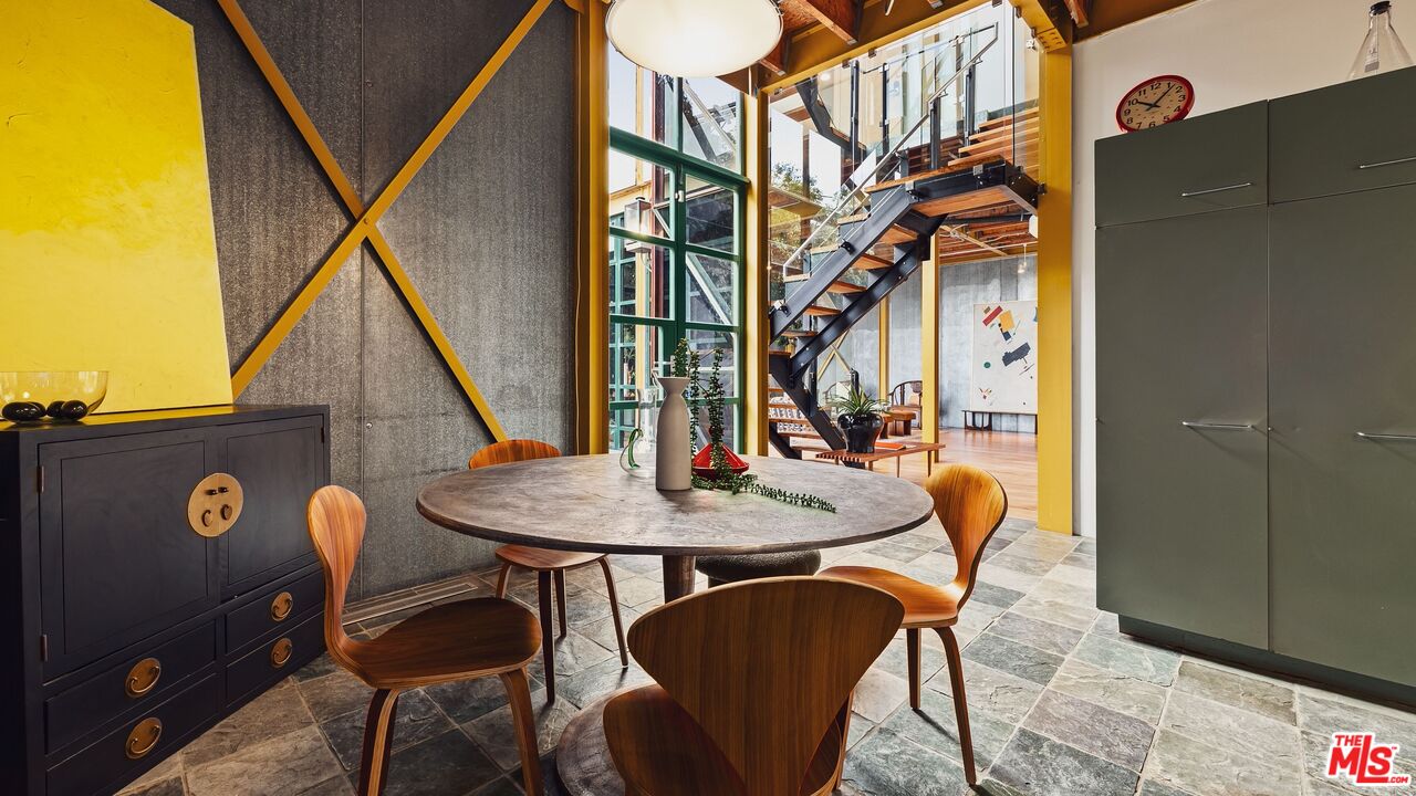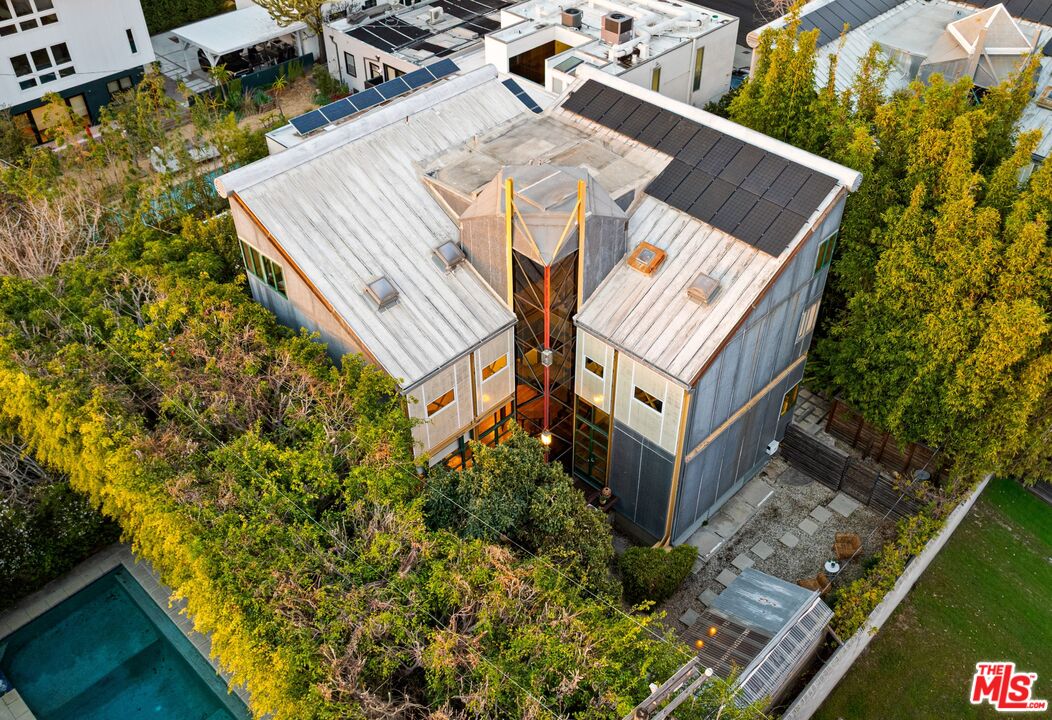Located in the heart of West LA, the Earthquake House is a modern industrial loft-style residence by award-winning architect David Ming Li. Named for its innovative structural system, the home is supported on visco-damper base isolators designed to protect it from earthquakes, making it both an architectural masterpiece and a rare find. Upon entering, soaring ceilings, walls of glass, and open-concept living fill the space with natural light and inspiration, complemented by steel as the primary structural framework. The home also incorporates distinctive materials, including galvanized sheet-metal refrigeration panels and translucent Kalwall sheeting. The three-story residence offers a light-filled, private, and highly creative living environment. The kitchen and dining area feature ample storage, stainless steel appliances, and a Sub-Zero refrigerator. The spacious primary suite showcases wood beams, exposed ironwork, and a meticulously designed bathroom with a floating dual vanity and large frameless glass shower, along with a massive walk-in closet with extensive built-ins. Two additional bedrooms with en suite bathrooms reflect the same industrial character carried throughout the home. An additional upstairs living area provides flexible space for intimate gatherings, an office, or art studio, and includes a dedicated office nook. The private yard features a wooden deck and teahouse, while the home itself is set back from the street for added privacy. Additional highlights include a two-car garage with 14-foot ceilings and an industrial roll-up door, a basement, solar panels, and generous storage. A truly one-of-a-kind property, the Earthquake House is a creative's dream, ideally located near Sawtelle, the beach, and everything the city has to offer.