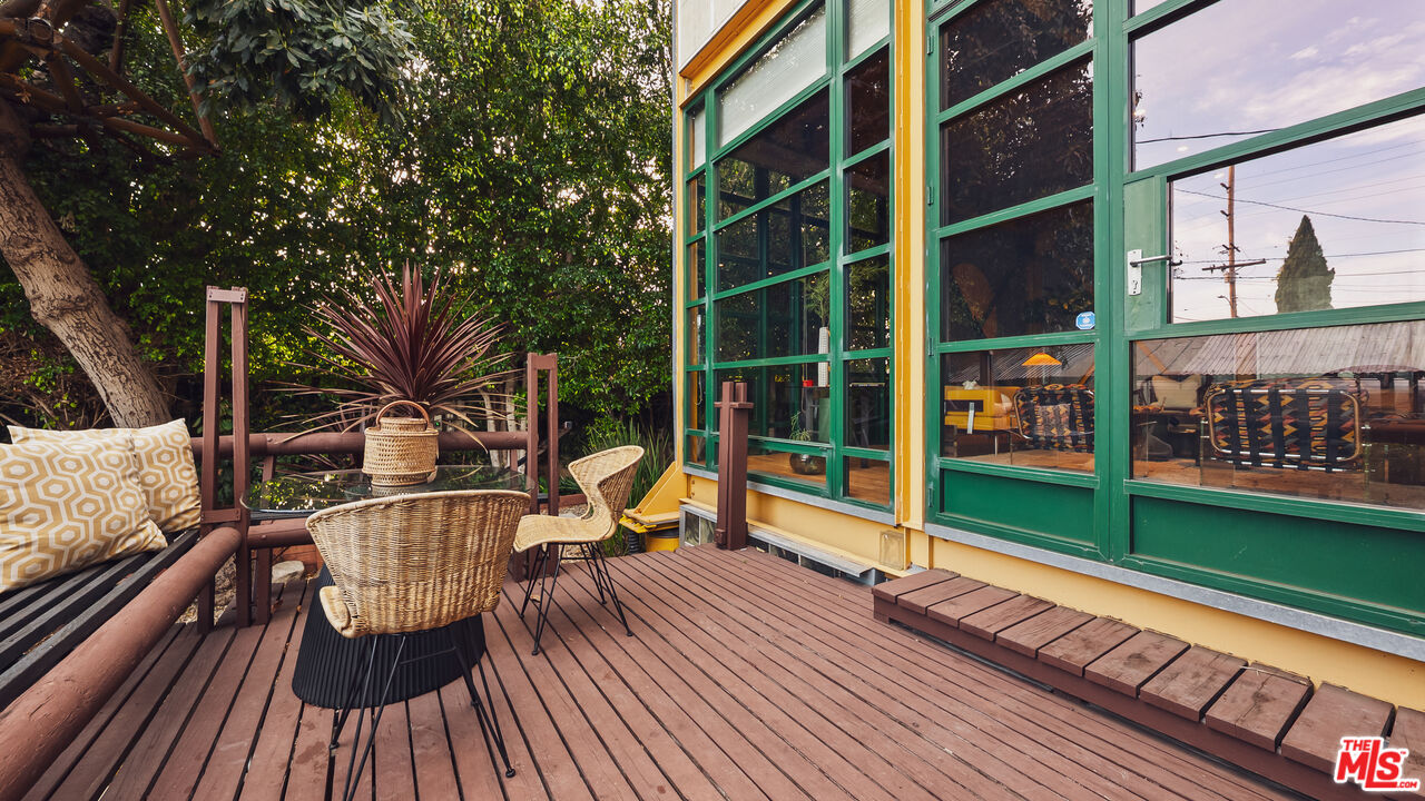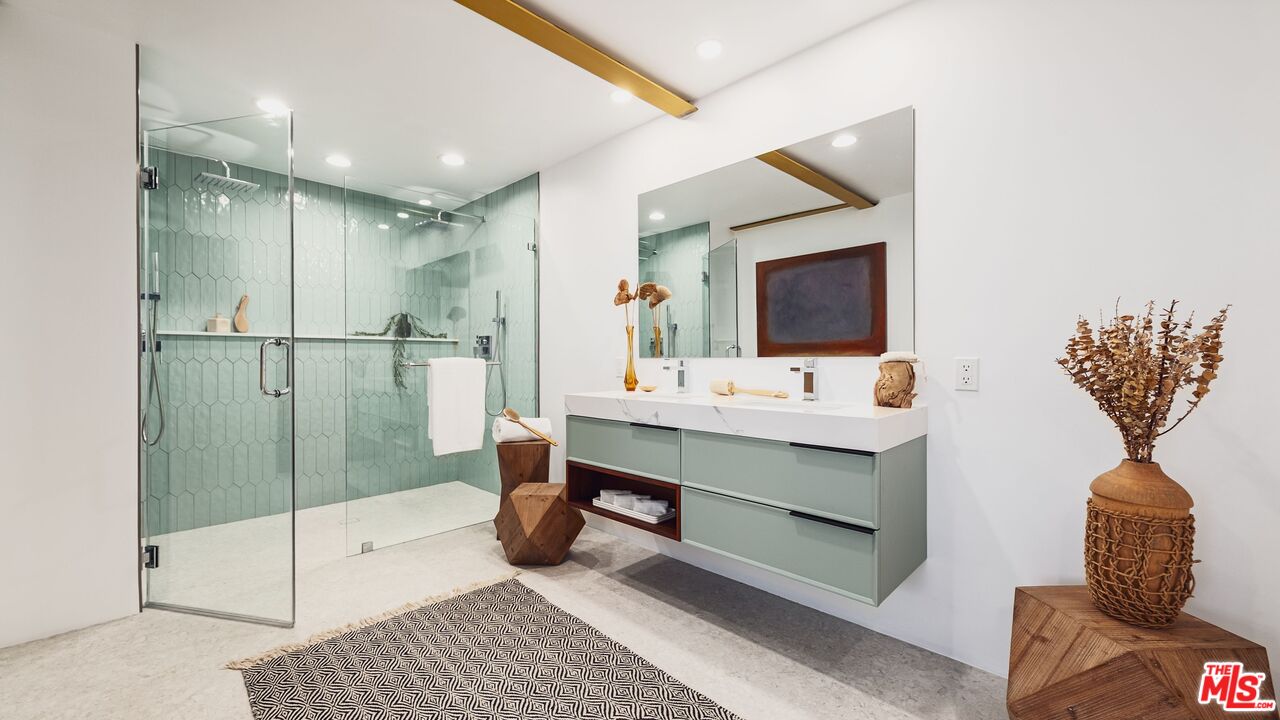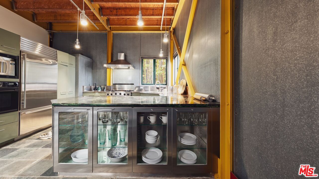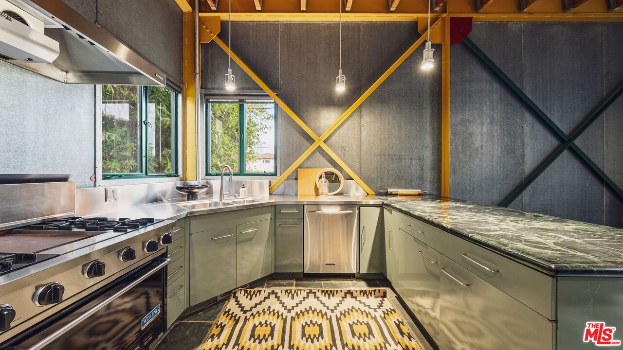 Located in the heart of West LA, the Earthquake House is a modern industrial loft-style residence by award-winning architect David Ming Li. Named for its innovative structural system, the home is supported on visco-damper base isolators designed to protect it from earthquakes, making it both an architectural masterpiece and a rare find. Upon entering, soaring ceilings, walls of glass, and open-concept living fill the space with natural light and inspiration, complemented by steel as the primary structural framework. The home also incorporates distinctive materials, including galvanized sheet-metal refrigeration panels and translucent Kalwall sheeting. The three-story residence offers a light-filled, private, and highly creative living environment. The kitchen and dining area feature ample storage, stainless steel appliances, and a Sub-Zero refrigerator. The spacious primary suite showcases wood beams, exposed ironwork, and a meticulously designed bathroom with a floating dual vanity and large frameless glass shower, along with a massive walk-in closet with extensive built-ins. Two additional bedrooms with en suite bathrooms reflect the same industrial character carried throughout the home. An additional upstairs living area provides flexible space for intimate gatherings, an office, or art studio, and includes a dedicated office nook. The private yard features a wooden deck and teahouse, while the home itself is set back from the street for added privacy. Additional highlights include a two-car garage with 14-foot ceilings and an industrial roll-up door, a basement, solar panels, and generous storage. A truly one-of-a-kind property, the Earthquake House is a creative's dream, ideally located near Sawtelle, the beach, and everything the city has to offer.
