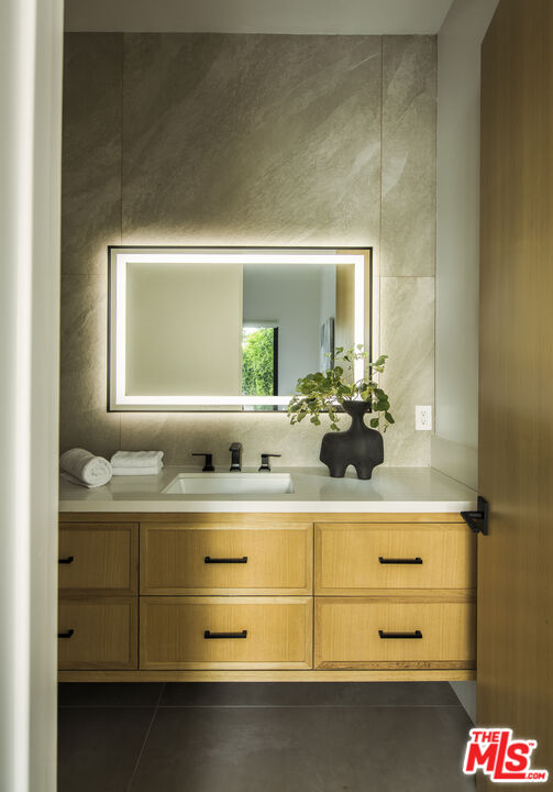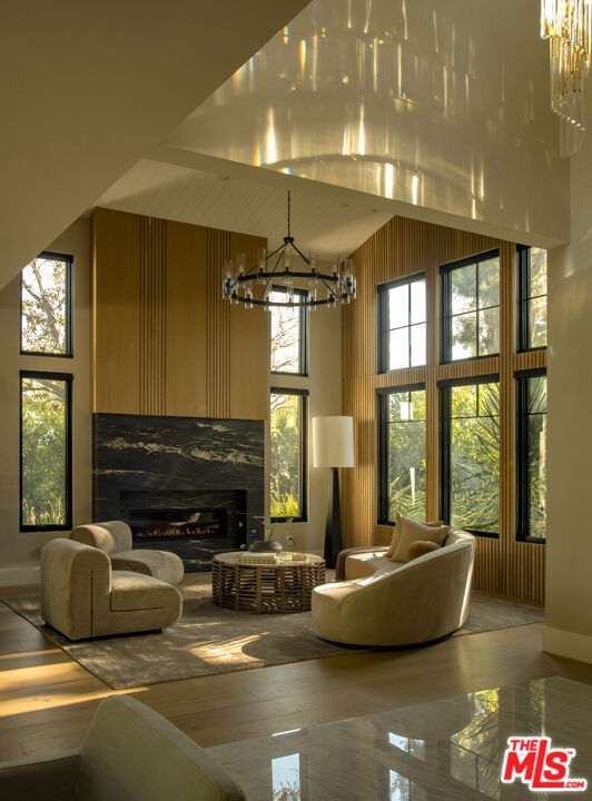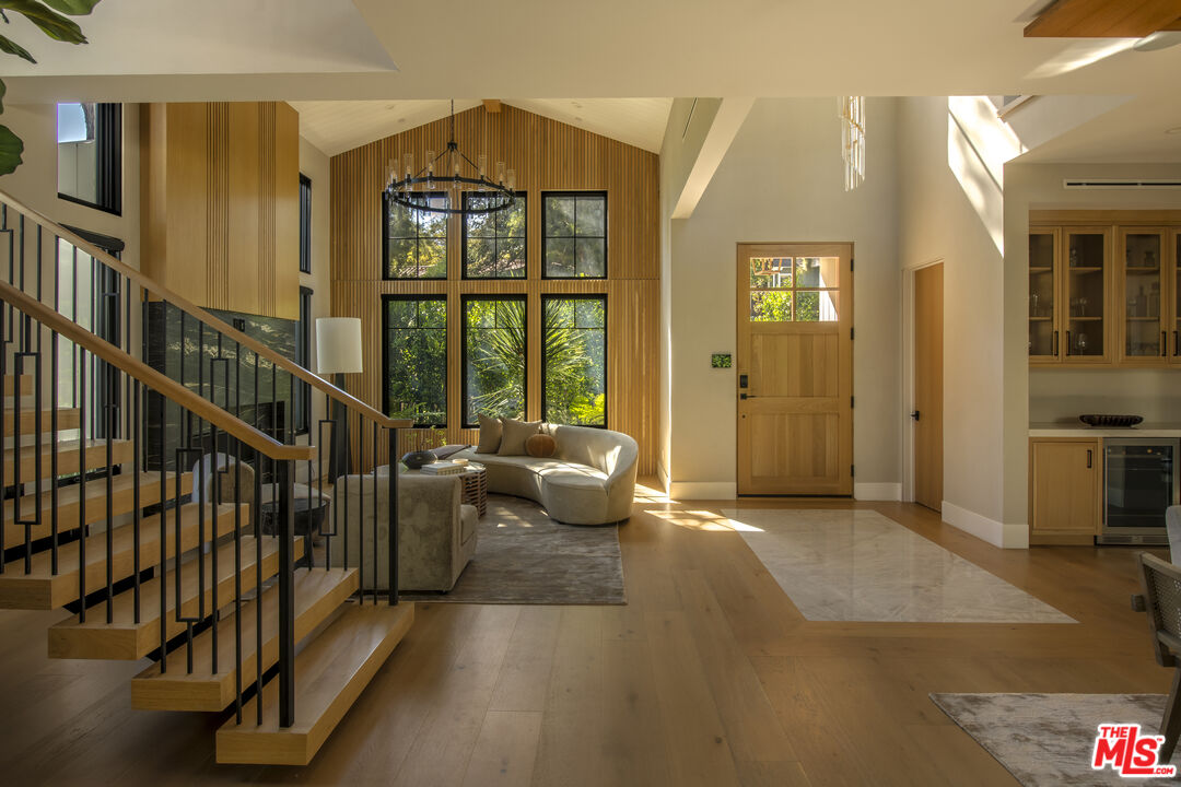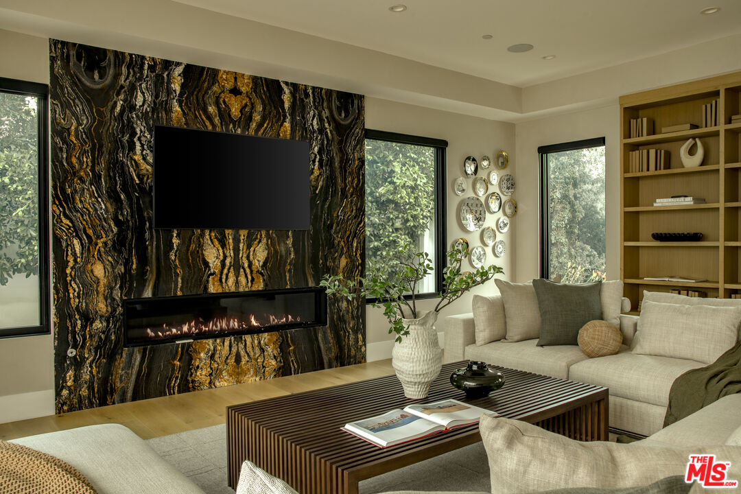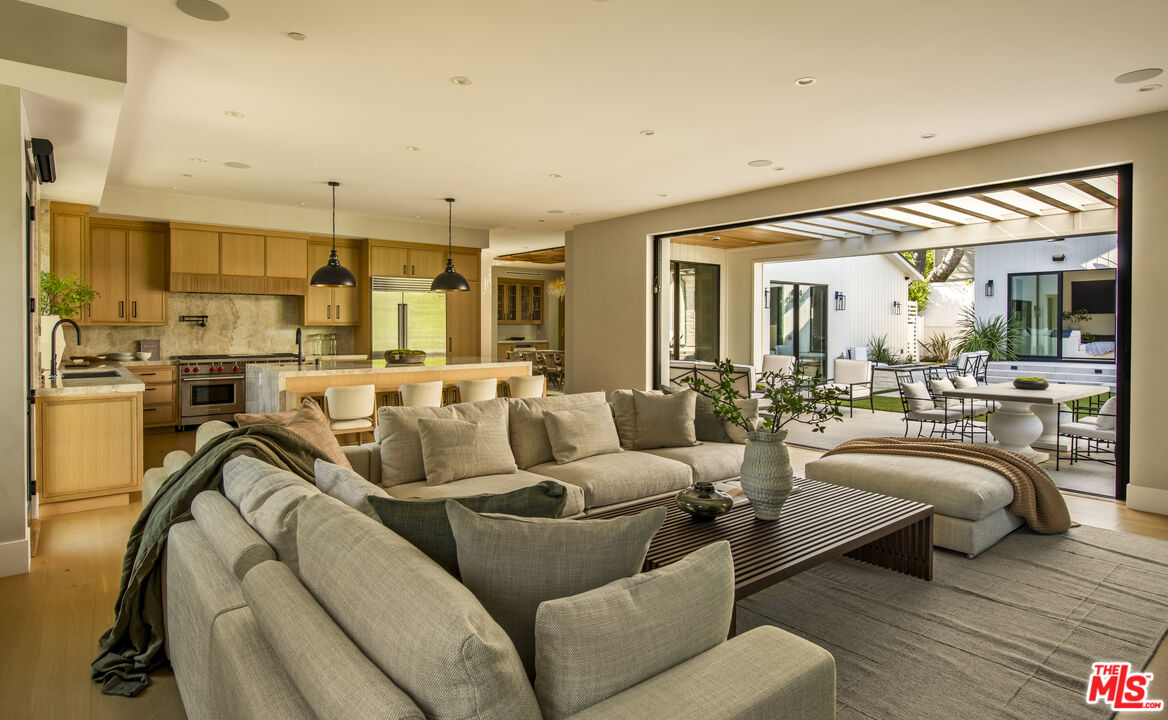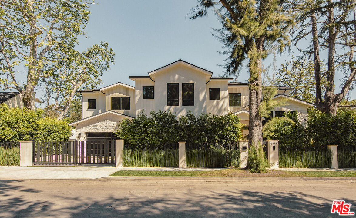 Completed in 2024, this gated compound welcomes you into a contemporary retreat in the heart of Westwood. Delineated by soaring high ceilings and the rich finishes of wood, stone, and metal, an immediate sense of warmth is felt upon arrival. The main living space offers a seamless connection from the kitchen and living room to the expansive backyard, where a sparkling saltwater pool, fire pit, and built-in barbecue area invite opportunities to entertain guests or relax in privacy. Back inside, the chef's kitchen showcases white oak cabinetry, Wolf and Sub-Zero appliances, and a Taj Mahal stone island. Off the kitchen is the spacious living room, centered around a striking leathered granite fireplace with generous windows on either side. Also on this floor sits the formal dining area, with additional egress to the backyard, a guest bedroom or office, and a designated screening room. Upstairs, there is a family room or flex space just off the landing, leading to the additional guest bedrooms, each with an en-suite bath, and a serene primary wing overlooking the backyard. The primary suite continues the calming, organic motif of the first level, with walnut wood accents, a large balcony, and a luxurious bathroom with a generously-sized shower, soaking tub, and double vanities. A spacious ADU mirrors the detailed level of craftsmanship of the main residence, with an additional living room, kitchen, and bedroom plus en-suite bath. The entire home is enhanced by a Control4 smart home system throughout. It is ideally located near UCLA and Westwood Village, with proximity to the 405 freeway.