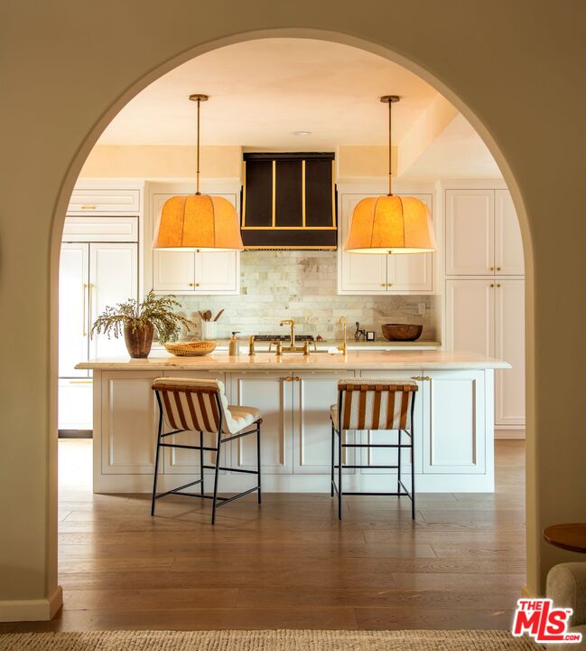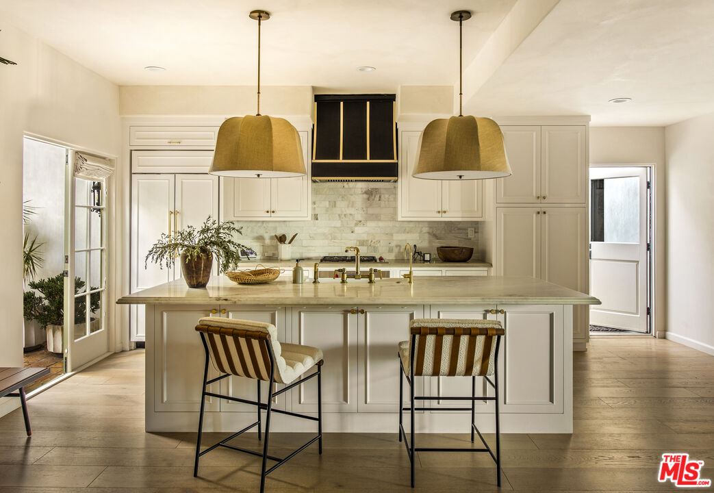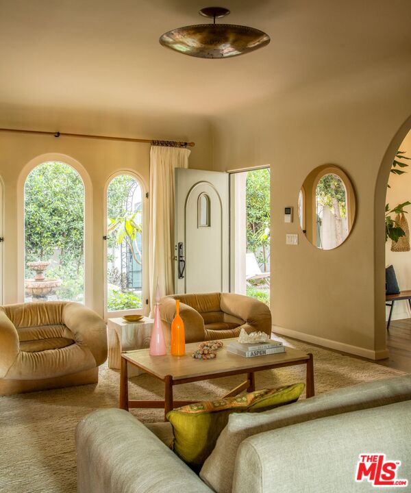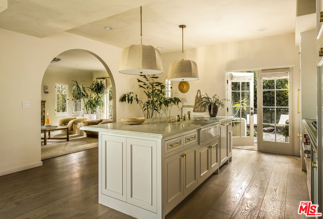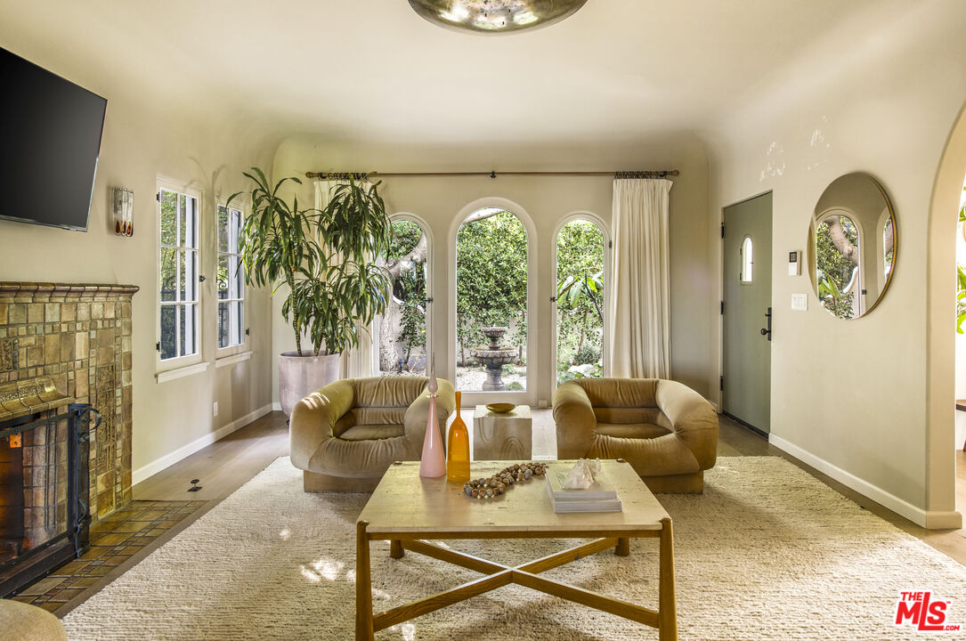 Set along a quiet rise in Los Feliz, this 1926 Spanish Colonial balances historic character with thoughtful, material-driven updates. Lime-washed walls by Portola and soft tones from Farrow & Ball create a sense of calm continuity throughout, while quartzite and limestone surfaces, paired with Waterworks fixtures, bring depth and quiet durability to the kitchen and bathrooms. The interior unfolds naturally from one space to the next. An arched living room opens to a light-filled dining area overlooking the garden and distant skyline, while upstairs suites connect to private marble-tiled terraces finished in Zia stone, with views stretching toward Griffith Observatory and the surrounding hills. On the lower level, a screening room, guest quarters, and sauna offer a more relaxed retreat for evenings in or hosting. Outside, landscapes by Terremoto shape the grounds into a series of usable moments. Redwood decking, native plantings, edible gardens, and a cedar soaking tub are nestled into the hillside. Moments from Los Feliz Village, The Greek Theatre, and Griffith Park, the setting delivers a rare balance of neighborhood intimacy and access to Los Angeles' most enduring natural and cultural landmarks. Extensive system upgrades include a restored clay tile roof, tankless hot water, air purification, dual-pane wood windows, and fully integrated smart home infrastructure.
