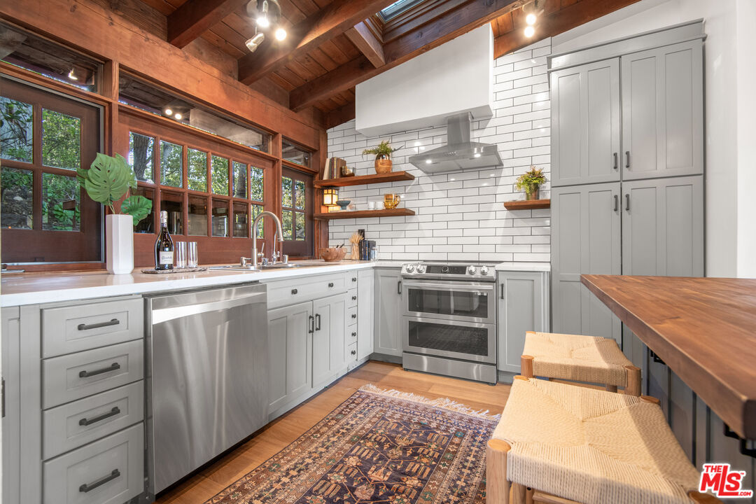 - Interior Features: Beamed Ceiling(s), High Ceilings (9 Feet+), Living Room Deck Attached, Open Floor Plan