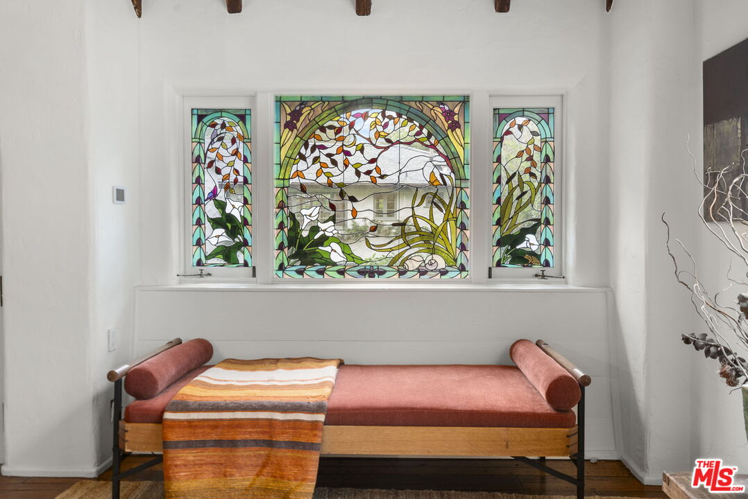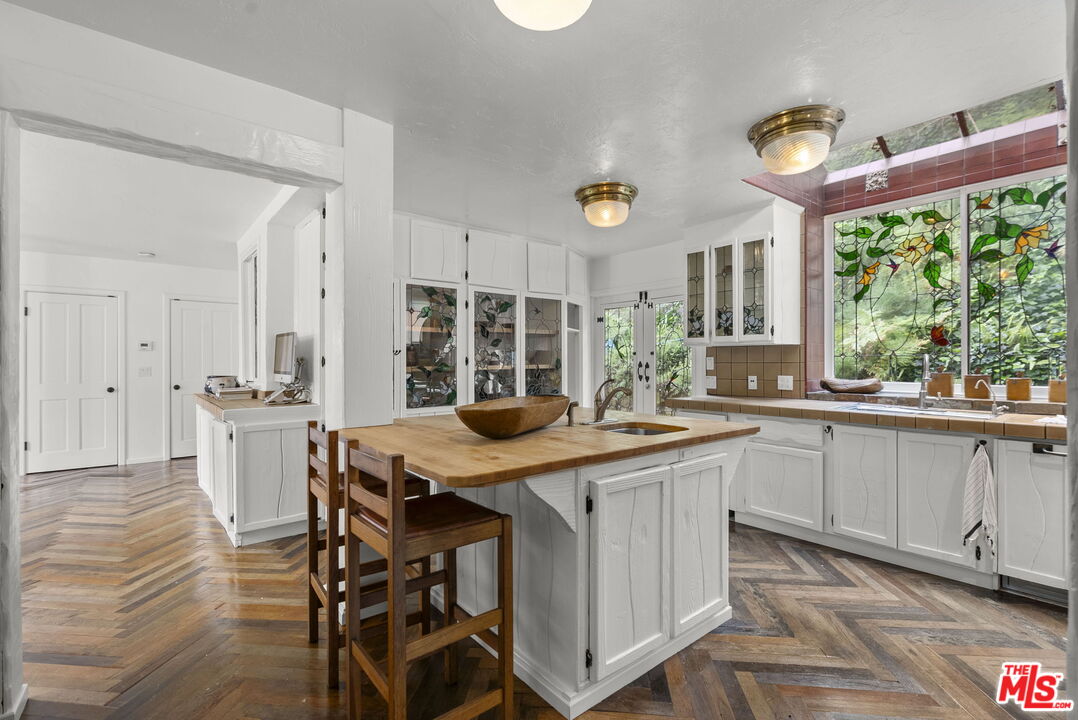 Nearly a century in the making, this enchanting 1928 retreat rests quietly within the storybook landscape of Rustic Canyon. The property has evolved with grace into a timeless English Tudor where every detail feels considered, a blend of craftsmanship, history, and warmth. Inside, soaring beamed cathedral ceilings create a sense of openness and light, while custom herringbone wood floors ground the space in quiet sophistication. Sunlight filters gently through colorful stained-glass windows, casting shifting patterns across the rooms throughout the day. Restored vintage lighting glows softly in the evenings, enhancing the home's intimate, almost cinematic ambiance. Each of the five en suite bedrooms offers its own distinct rhythm and personality, private & peaceful. At the very top, the primary suite feels like a retreat unto itself, bathed in natural light and surrounded by treetop views that stretch across the lush canyon landscape. On the lower level, the home reveals one of its most captivating chapters. Published as part of the original 1920s cabin, this space carries the spirit of another era. A dramatic refurbished screening lounge unfolds, leading to a hidden Prohibition-era speakeasy tucked behind secret doors- a playful and storied nod to the home's past as a gathering place for the Uplifters community. Outside, the grounds feel equally transportive. Mature greenery surrounds the home, creating a sense of privacy and calm, while the 54-foot saline pool and spa stretch elegantly across the landscape designed for long afternoons in the sun and quiet evenings under a verdant canopy. Incredible creative studio over 3-car garage. Gardening shed. Set within one of Los Angeles' most cherished and storied enclaves, this is more than a home... it's a rare and soulful retreat where history, artistry, and nature exist in effortless harmony.