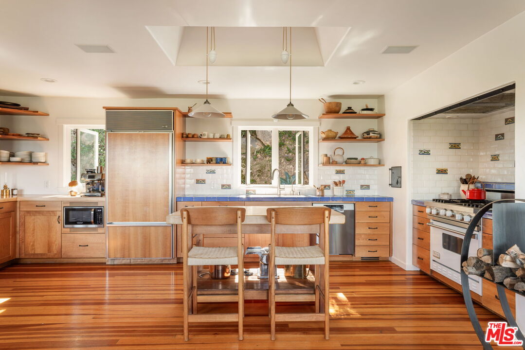 Perched high above the canyon on sought-after Observation Drive, this inviting Topanga residence offers expansive mountain views, privacy, and a relaxed indoor-outdoor lifestyle that defines canyon living at its best. Set on approximately 1.4 acres, the property is framed by mature oaks and open sky, creating a rare sense of space and serenity. The home features 3 bedrooms and 4 bathrooms, with light-filled interiors and a natural, flowing layout designed for both everyday living and intimate gatherings. An open chef's kitchen and generous living spaces extend seamlessly to outdoor patios and terraces, blurring the line between inside and out. Updated finishes and warm architectural details provide understated sophistication throughout. The elevated setting enjoys a cooler microclimate, exceptional privacy, and ample parking, an uncommon convenience in Topanga. Ideally located near hiking trails, beaches, and the heart of the canyon community, this is a rare opportunity to own a turnkey home with land, views, and privacy in one of Topanga's most desirable locations.