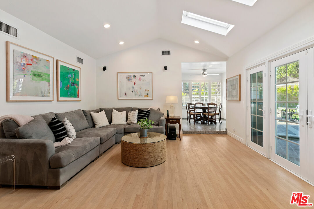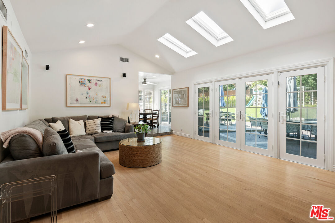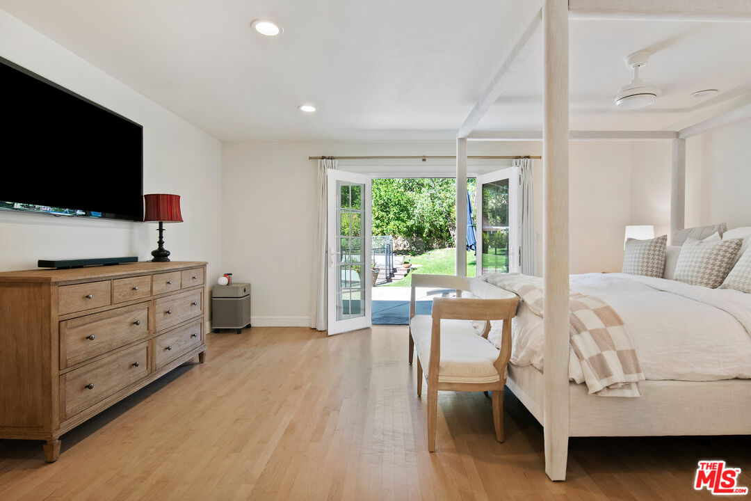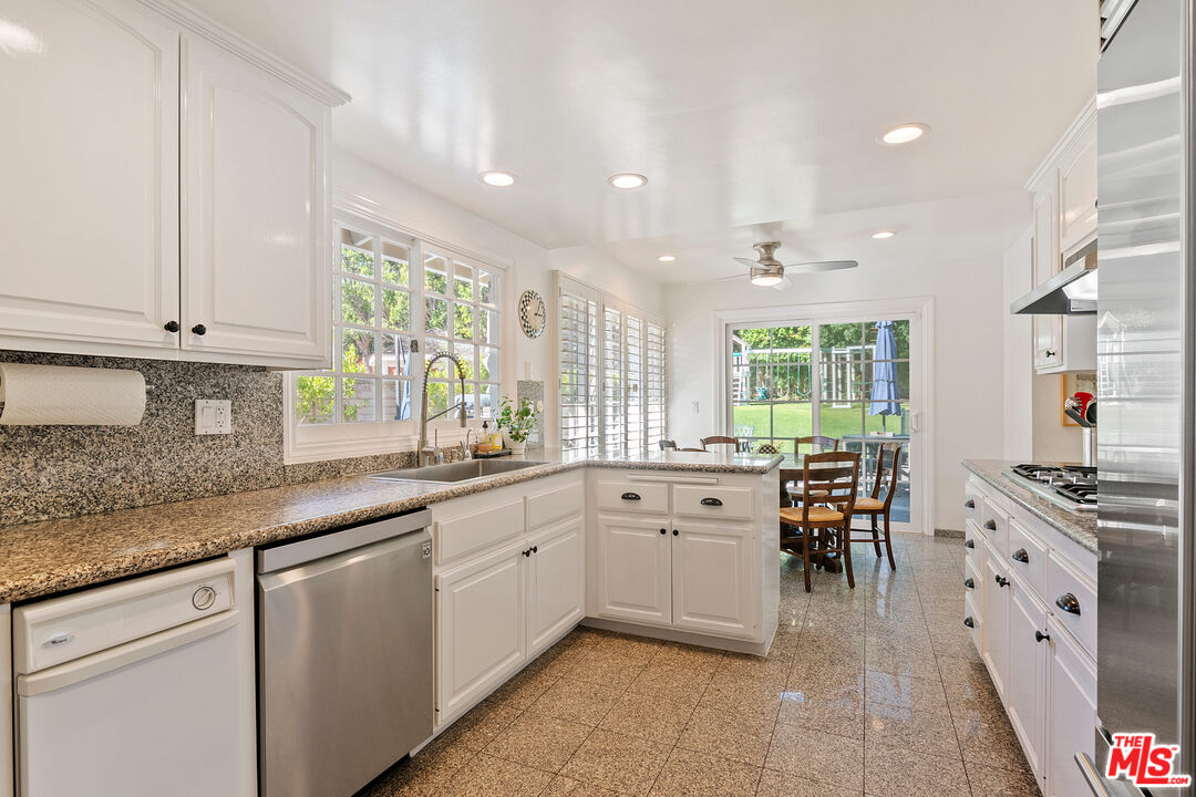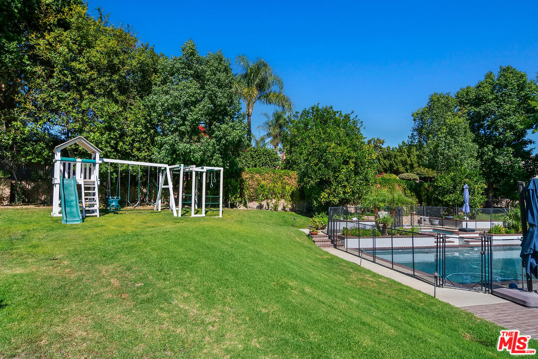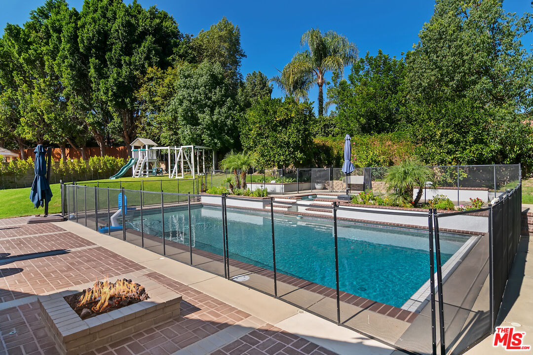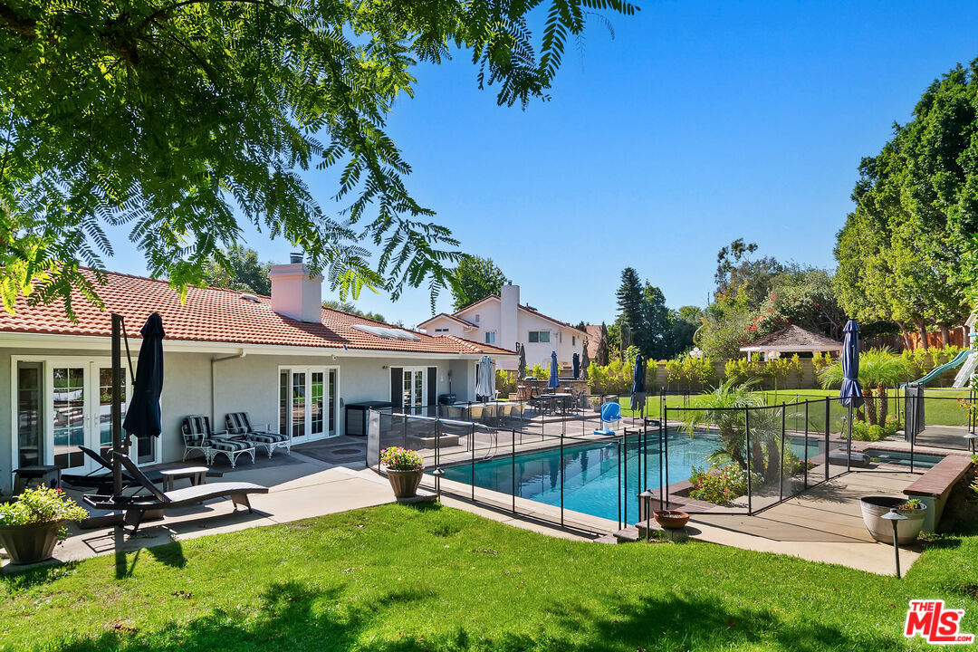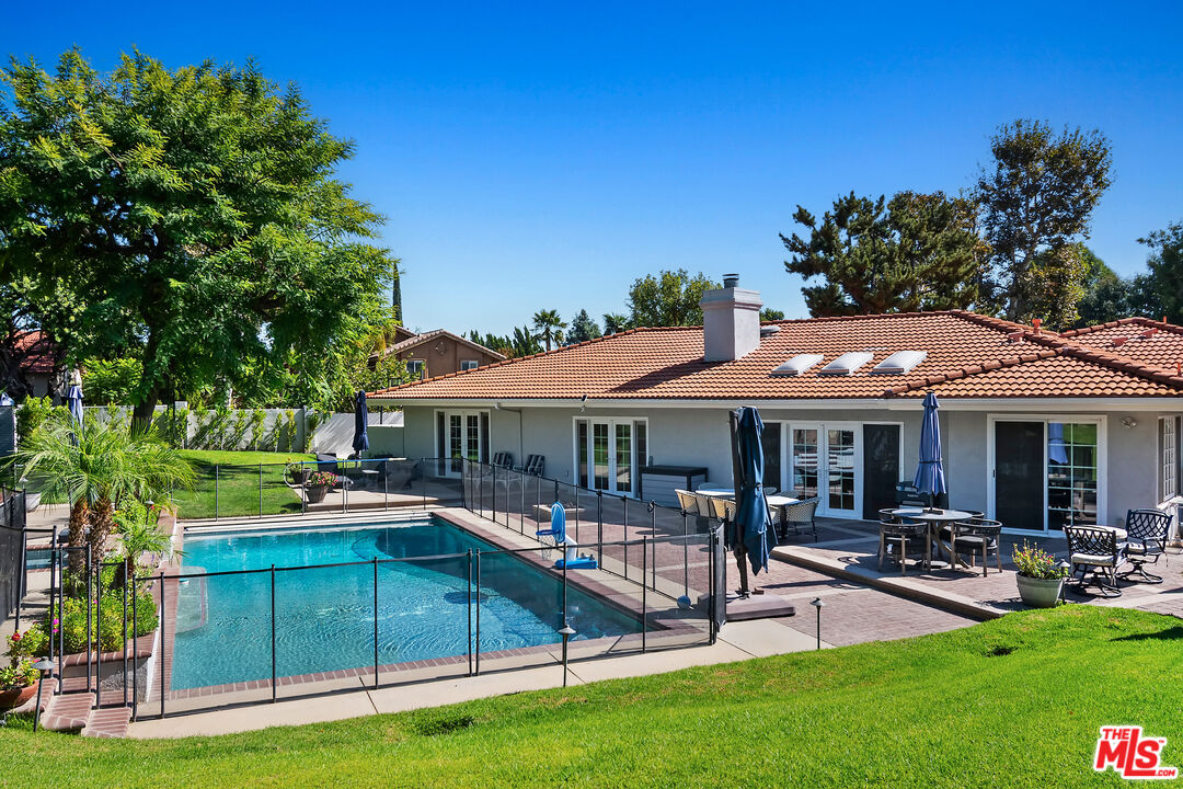 Welcome to this gorgeous single-story home on nearly half an acre, ideally situated on a corner lot in the highly sought-after Rancho de Caballeros community of Chatsworth. A true entertainer's dream, this 5 bedroom residence offers an incredible backyard retreat complete with a sparkling pool, spa, outdoor kitchen, and sport court. Step through double doors into a spacious entryway with light oak wood floors throughout and soaring ceilings that create an open, airy feel. The living spaces include a formal living room, elegant dining room with custom built-ins, and a family room featuring a double-sided fireplace and custom cabinetry with a wine fridge. The primary suite is a serene sanctuary with newer Milgard French doors leading to the backyard and a brand-new designer bathroom boasting ceramic tile, a freestanding tub, frameless glass shower with brass fixtures, and a double vanity. Three additional bedrooms are located down the hall, along with a beautifully renovated bathroom. On the opposite side of the home, the kitchen offers stainless steel appliances and a cozy breakfast area. A spacious laundry room and guest suite with pool access complete this thoughtfully designed layout.Located just a short walk to the community tennis courts, this home also enjoys proximity to premiere private schools including Sierra Canyon and Chaminade. Commuting is easy with quick access to the 118 Freeway and Topanga Canyon. The neighborhood is enriched by scenic open-space amenities explore the Santa Susana Pass State Historic Park, Chatsworth Trails Park, Stoney Point, Chatsworth Oaks Park, and nearby equestrian and hiking areas. This rare gem in Rancho de Caballeros delivers the lifestyle, location, and luxury you've been waiting for.