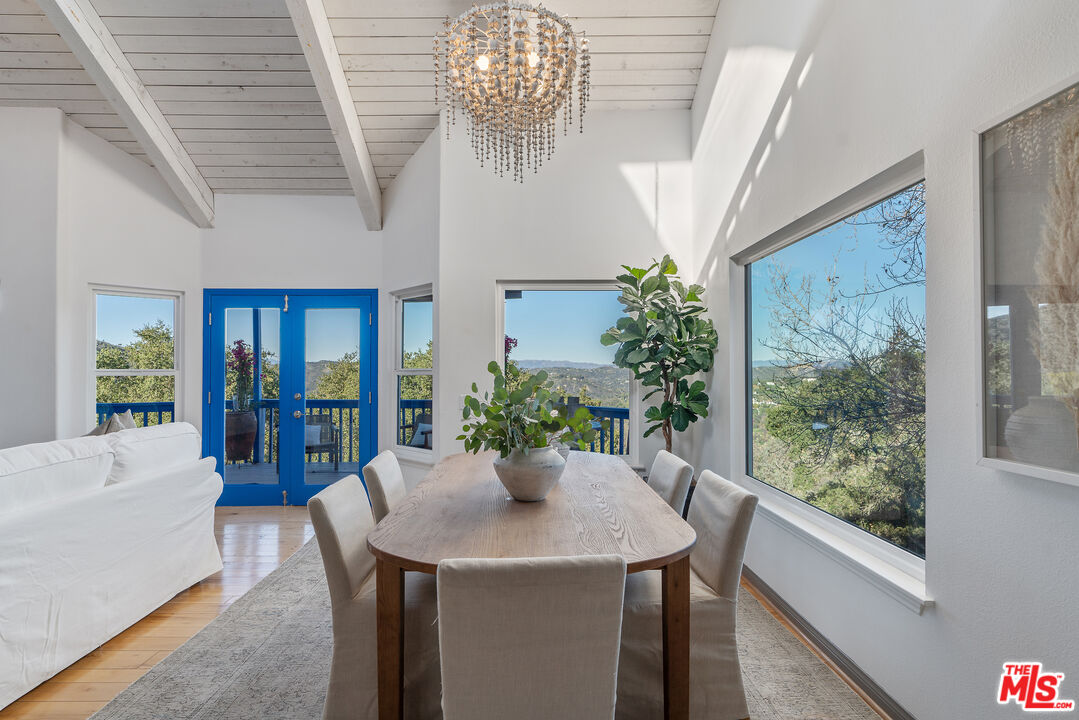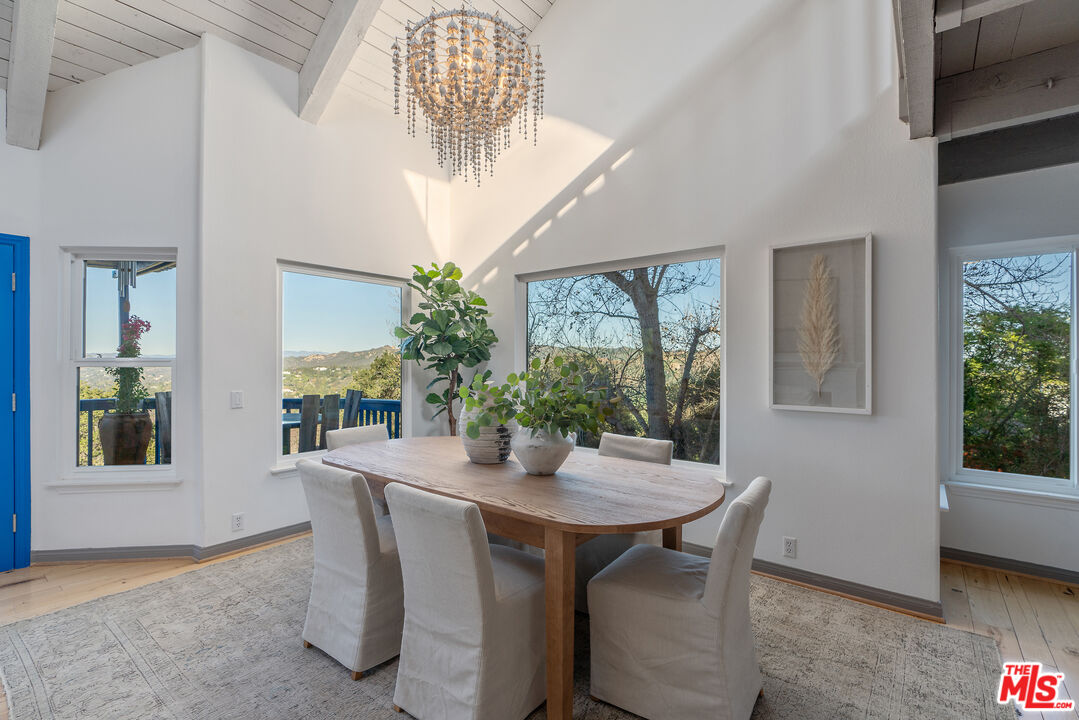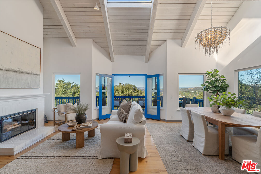A Rare Topanga Jewel with Sweeping Canyon Views, Income Potential & Spa-Like Amenities. This turn-key Topanga retreat truly has it all. Extensively remodeled and set in one of the canyon's most coveted microclimates, this exceptional home captures breathtaking cross-canyon mountain views and offers a rare blend of serenity, flexibility, and rental income potential. Surrounded by lush gardens, ancient oak trees, gentle boulders, and tranquil water featuresincluding a cascading waterfallthe property feels like a private sanctuary, yet is just 10 minutes from the Pacific Ocean and the Malibu border. The main residence features 5 bedrooms, 4 bathrooms, 2 kitchens, multiple living spaces, a flexible studio or studyeach enhanced by soaring vaulted ceilings and an adaptable split-level floor plan ideal for multi-generational living, creative workspaces, or hosting guests. Rich wood floors, slate tile, new appliances, and thoughtful upgrades elevate the home throughout. Enter through double doors into a light-filled living room with dramatic vaulted ceilings, a wood/gas fireplace, expansive windows, and French doors framing the spectacular canyon views. A loft above provides the perfect space for an office, studio, or playroom. Expansive decks on both levels run the length of the home, inviting you to relax, entertain, and take in the ever-changing scenery. The lower level offers a large, high-ceilinged rooms ideal for an art studio or movement space, a cozy family room with fireplace, two bedrooms, and a bathroomcreating a private and versatile retreat within the home. Adding to the property's appeal is a charming detached tiny home, complete with an outdoor bathroom, shower, claw-foot tub, and yoga deck. This peaceful nature escape is ideal for short- or long-term guests, creative retreats, or rental income. Spa-like amenities include an on-site sauna and covered outdoor gym, allowing you to unwind or recharge without ever leaving home. Additional features include solar panels, an oversized two-car garage, and ample storage. Perfectly positioned for a thriving life-work balance, this rare Topanga oasis is minutes from Topanga Village, iconic hiking trails, beaches and more!