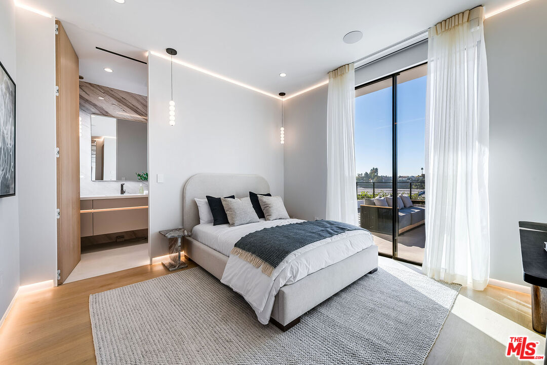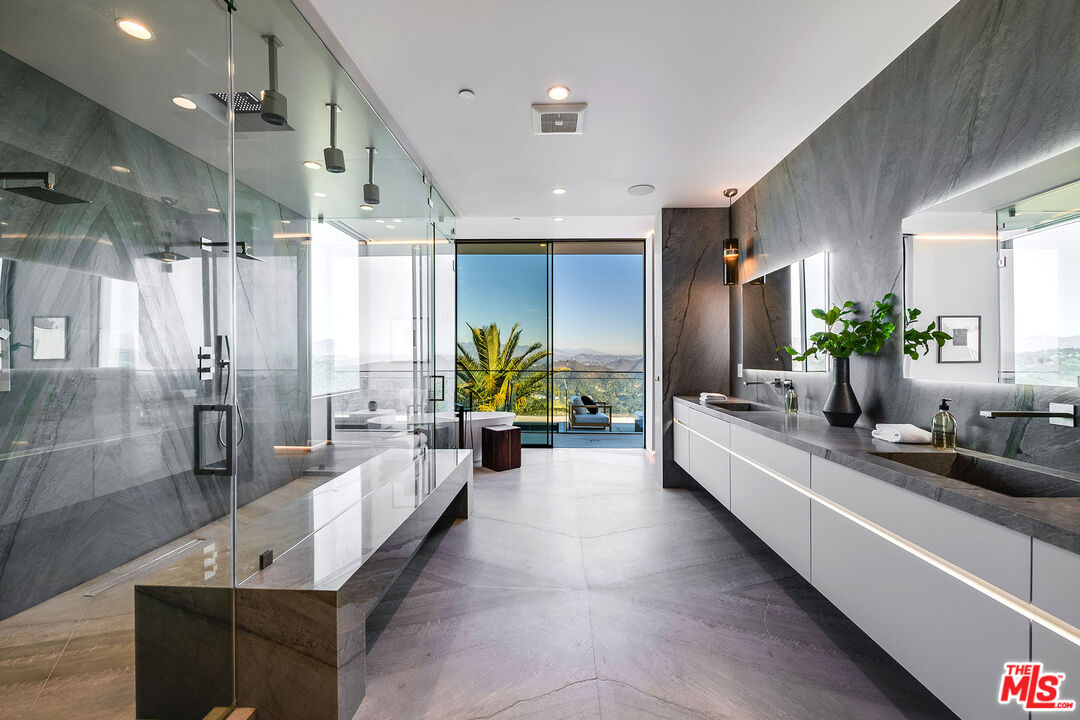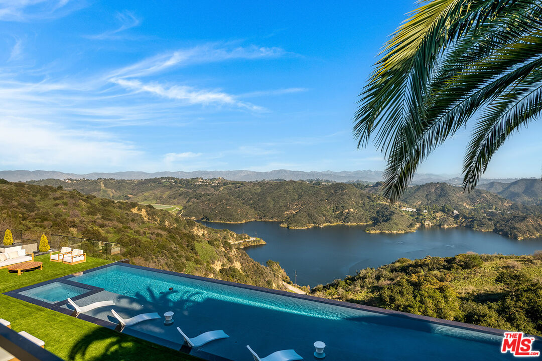 Poised above Bel Air with sweeping city, canyon, and reservoir views, this contemporary architectural estate is defined by luminous design, sculptural form, and a refined connection to nature. Approached through a double-gated entry and expansive motor court, the residence reveals a striking facade enhanced by custom illumination and serene reflecting water features anchored by mature olive trees. Backlit onyx columns frame the entrance, setting a tone of quiet sophistication.The main living pavilion offers an open, radiant flow for dining and relaxation, surrounded by full-height automatic glass doors, refined stone surfaces, warm wood tones, and breathtaking views throughout. A floating green onyx staircase connects each level, thoughtfully designed to inspire and maximize light across the home.A chef's culinary haven, the residence features four kitchens designed for entertaining, professional preparation, and seamless service. The main level kitchen is equipped with dual oversized islands, a full suite of Gaggenau appliances, European cabinetry, and a walk-in industrial stainless-steel refrigeration room. A separate restaurant-grade chef's kitchen with stainless-steel finishes and Miele appliances supports large-scale culinary preparation, complemented by a dedicated butler's kitchen and an outdoor kitchen with pizza oven for catered events at scale.The entertainment level is a world unto itself, featuring a private two-lane bowling alley, cinema-grade theater, sophisticated lounge and bar, and a temperature-controlled wine cellar. A full private wellness retreat includes a Turkish hammam with dry sauna, steam room, cold plunge, hot tub, massage tables, hair and nail salon, juice bar, and a glass-enclosed fitness studio oriented toward expansive views.The upper level hosts the primary suite, a private sanctuary with panoramic vistas, dual walk-in closets, and dual bathrooms finished in marble and onyx, each appointed with TOTO smart systems. Three additional ensuite bedrooms feature floor-to-ceiling glass, custom closets, and serene natural finishes.Outdoor living is highlighted by an infinity-edge pool blending into the horizon, expansive stone terraces, fire features, softly illuminated landscaping, and a private hillside vineyard that enhances the home's sense of retreat. A refined contemporary estate, this tour de force embodies elegance, innovation, and tranquility in one of Bel Air's most elevated settings.