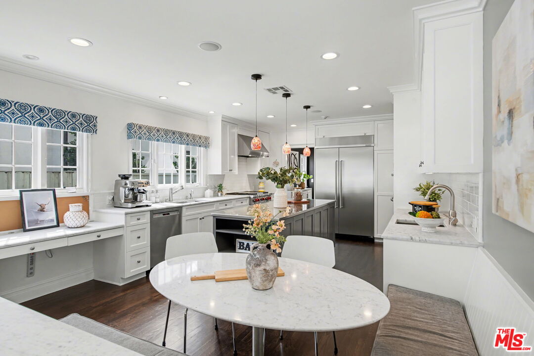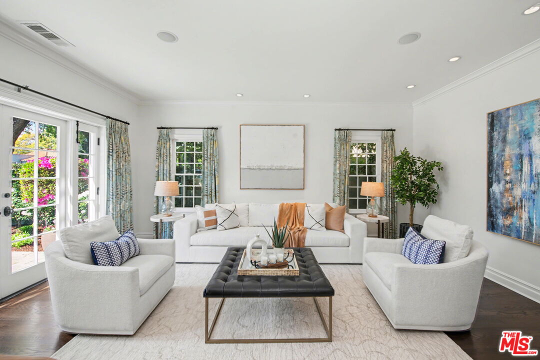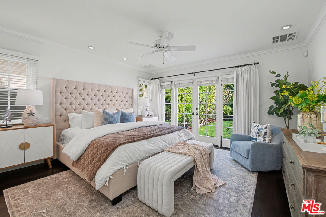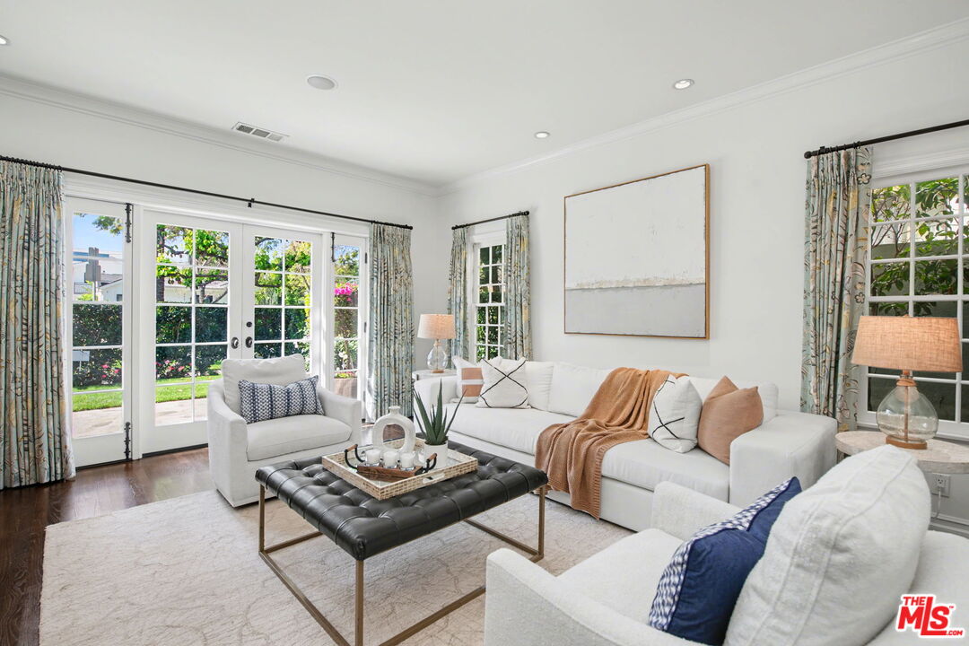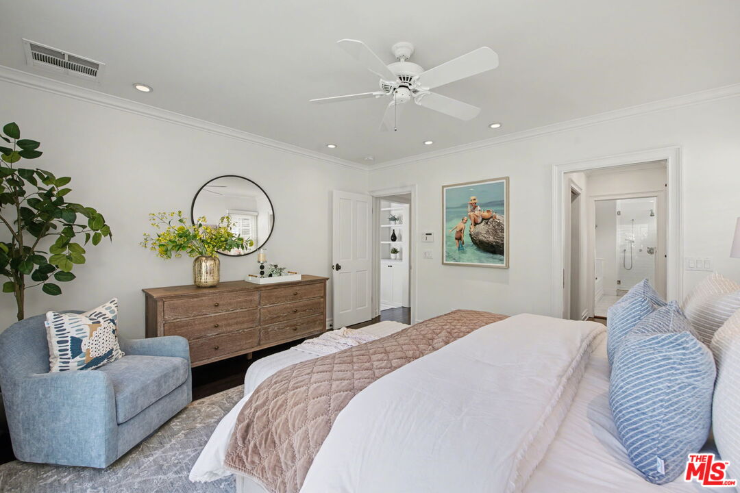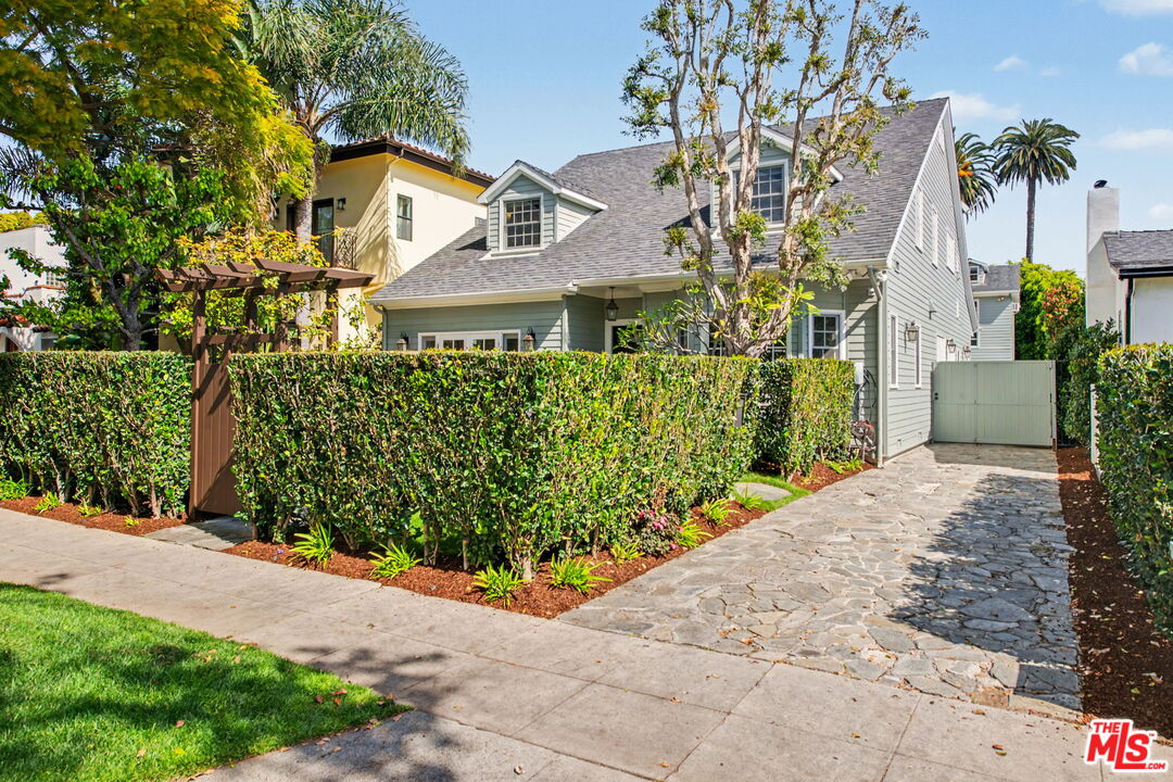 Stunning timeless 2-story Custom Cape Cod 4 bedroom/3.5 bath that exudes property exudes pride of ownership in every way. An enclosed front yard and charming arbor gate create a welcoming sense of privacy. Inside, rich hardwood floors flow throughout the home, complemented by beautiful wood-framed windows, French doors, crown molding, custom draperies, and abundant natural light. French doors from the living room open seamlessly to a flagstone patio, perfect for indoor-outdoor entertaining. The spacious formal dining room is highlighted by a picturesque bay window. The stunning chef's kitchen features high-end custom cabinetry, stainless steel appliances including wolf range and warming drawer, a generous center island, 2 sinks, built-in breakfast seating, and elegant Carrera countertops, all opening to the large family room with French doors to grassy backyard and flower garden bed with mature lemon tree, and a gated driveway that provides a tranquil setting for relaxation and privacy. The primary suite is conveniently located downstairs and opens to the yard through French doors and includes custom walk-in and wall of closets, and a luxurious Carrara marble finished bathroom with dual basins with separate soaking tub and shower. Upstairs, 3 additional bedrooms (one with en-suite bathroom) each offer built-ins and custom closets, along with a light-filled loft featuring built-ins, a skylight, and a large finished storage closet with shelving. A thoughtfully designed upstairs laundry room includes a sink and custom cabinetry. Adding versatility, a detached bonus suite above the garage with vaulted ceilings is ideal for a private home office, gym, or guest retreat. The finished garage includes coated flooring, built-ins and an automatic door, stone-paved driveway and EV charger. Additional features include dual-zoned A/C and heat, invisible retractable screens on French doors, and thoughtfully integrated storage throughout. Just a few blocks from Westwood Charter School, and just moments from Westfield Century City, UCLA and Beverly Hills. Truly a move-in condition property on every level.