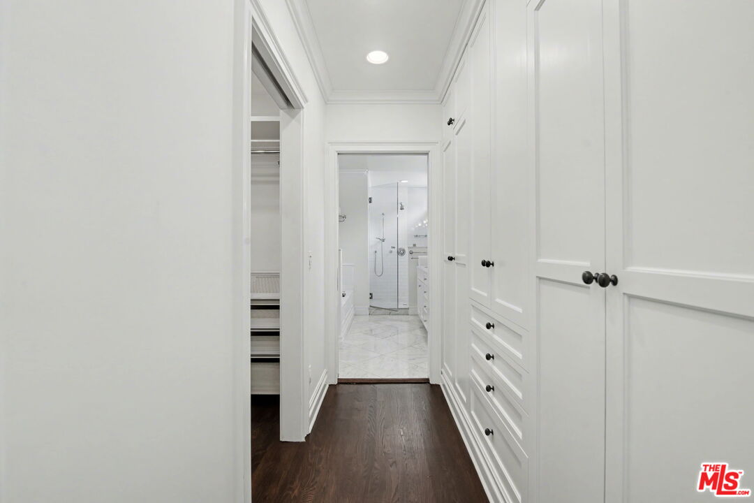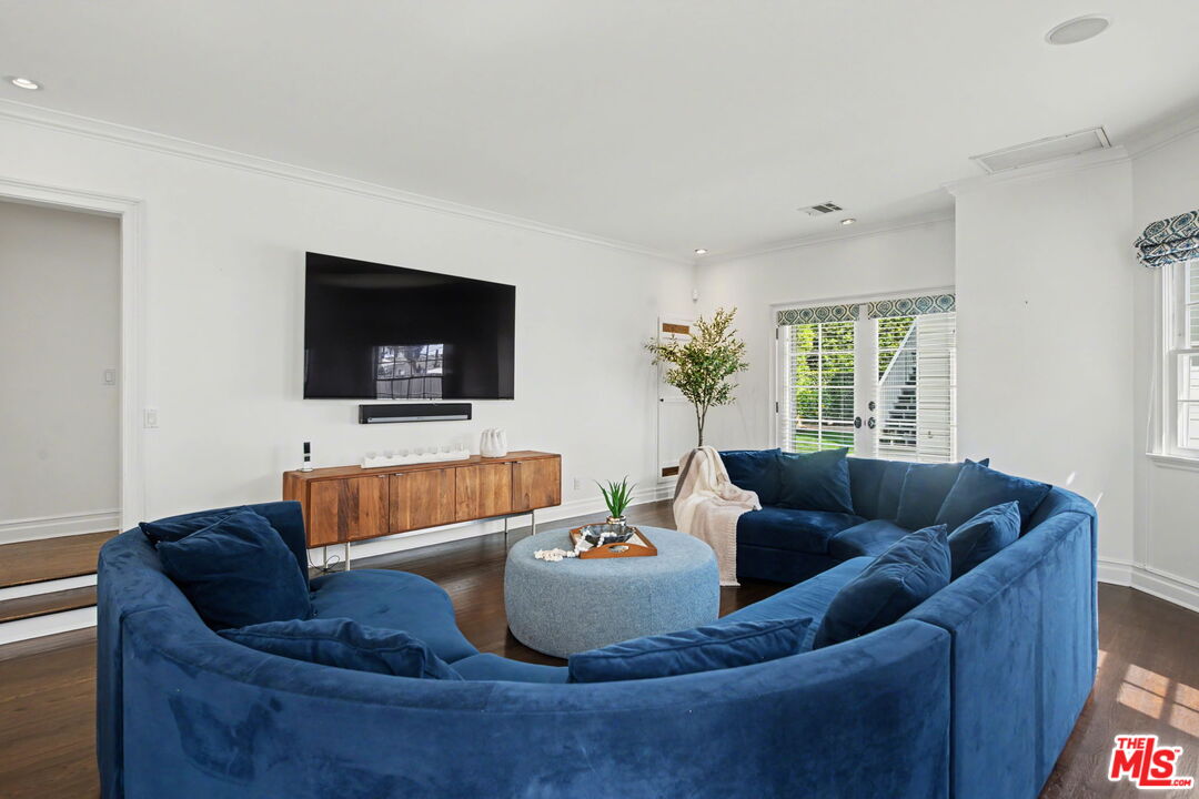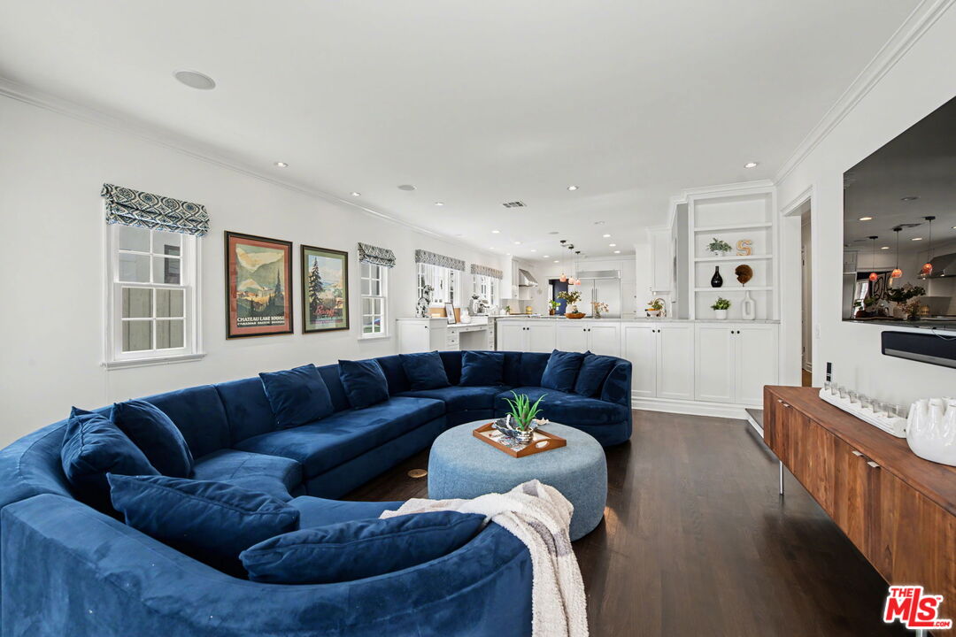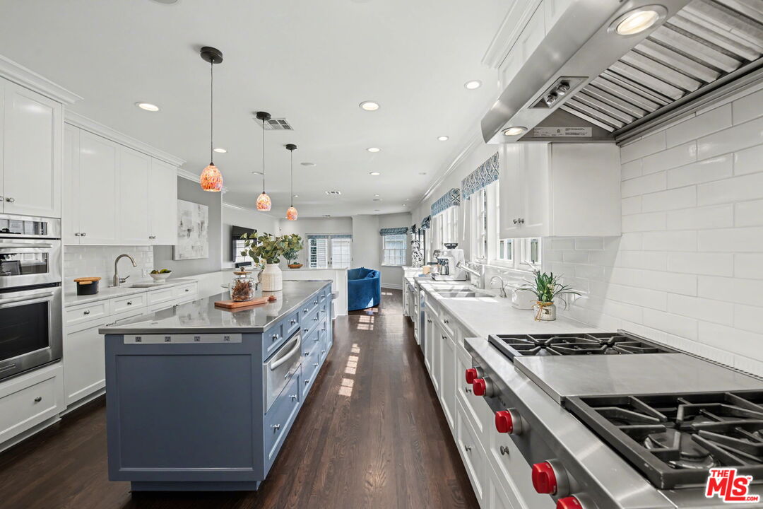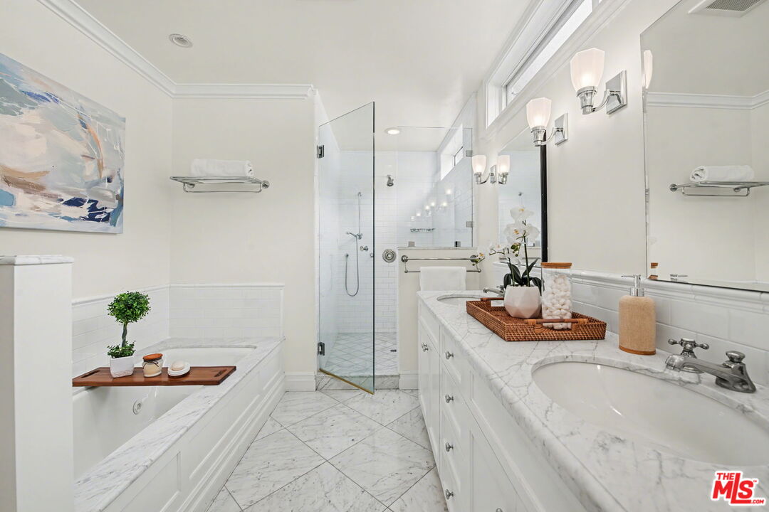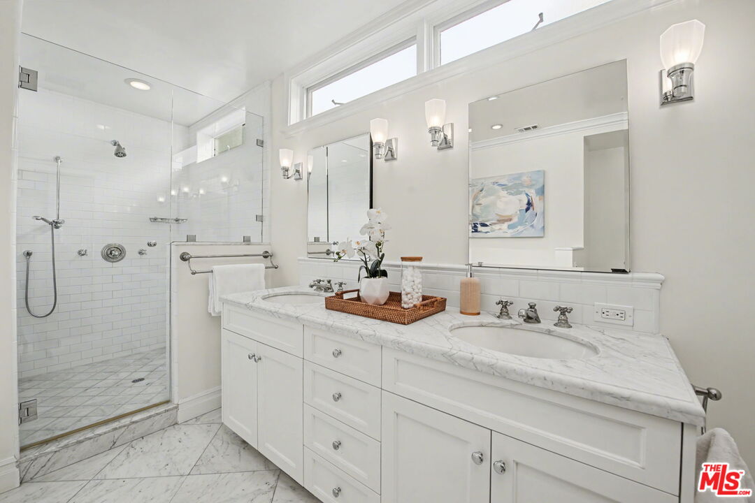 Stunning timeless 2-story Custom Cape Cod 4 bedroom/3.5 bath that exudes property exudes pride of ownership in every way. An enclosed front yard and charming arbor gate create a welcoming sense of privacy. Inside, rich hardwood floors flow throughout the home, complemented by beautiful wood-framed windows, French doors, crown molding, custom draperies, and abundant natural light. French doors from the living room open seamlessly to a flagstone patio, perfect for indoor-outdoor entertaining. The spacious formal dining room is highlighted by a picturesque bay window. The stunning chef's kitchen features high-end custom cabinetry, stainless steel appliances including wolf range and warming drawer, a generous center island, 2 sinks, built-in breakfast seating, and elegant Carrera countertops, all opening to the large family room with French doors to grassy backyard and flower garden bed with mature lemon tree, and a gated driveway that provides a tranquil setting for relaxation and privacy. The primary suite is conveniently located downstairs and opens to the yard through French doors and includes custom walk-in and wall of closets, and a luxurious Carrara marble finished bathroom with dual basins with separate soaking tub and shower. Upstairs, 3 additional bedrooms (one with en-suite bathroom) each offer built-ins and custom closets, along with a light-filled loft featuring built-ins, a skylight, and a large finished storage closet with shelving. A thoughtfully designed upstairs laundry room includes a sink and custom cabinetry. Adding versatility, a detached bonus suite above the garage with vaulted ceilings is ideal for a private home office, gym, or guest retreat. The finished garage includes coated flooring, built-ins and an automatic door, stone-paved driveway and EV charger. Additional features include dual-zoned A/C and heat, invisible retractable screens on French doors, and thoughtfully integrated storage throughout. Just a few blocks from Westwood Charter School, and just moments from Westfield Century City, UCLA and Beverly Hills. Truly a move-in condition property on every level.