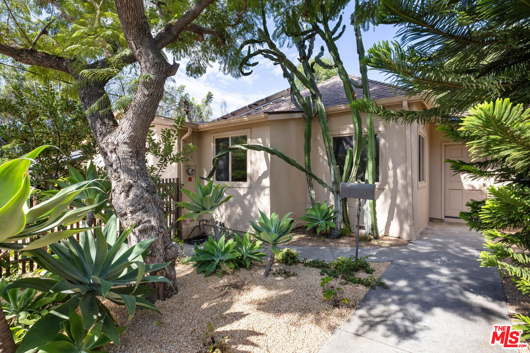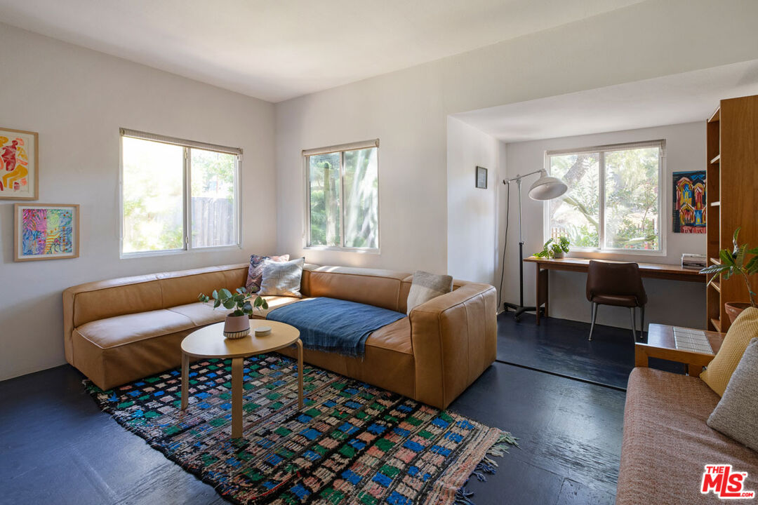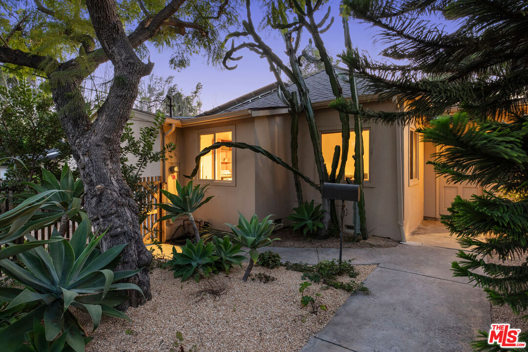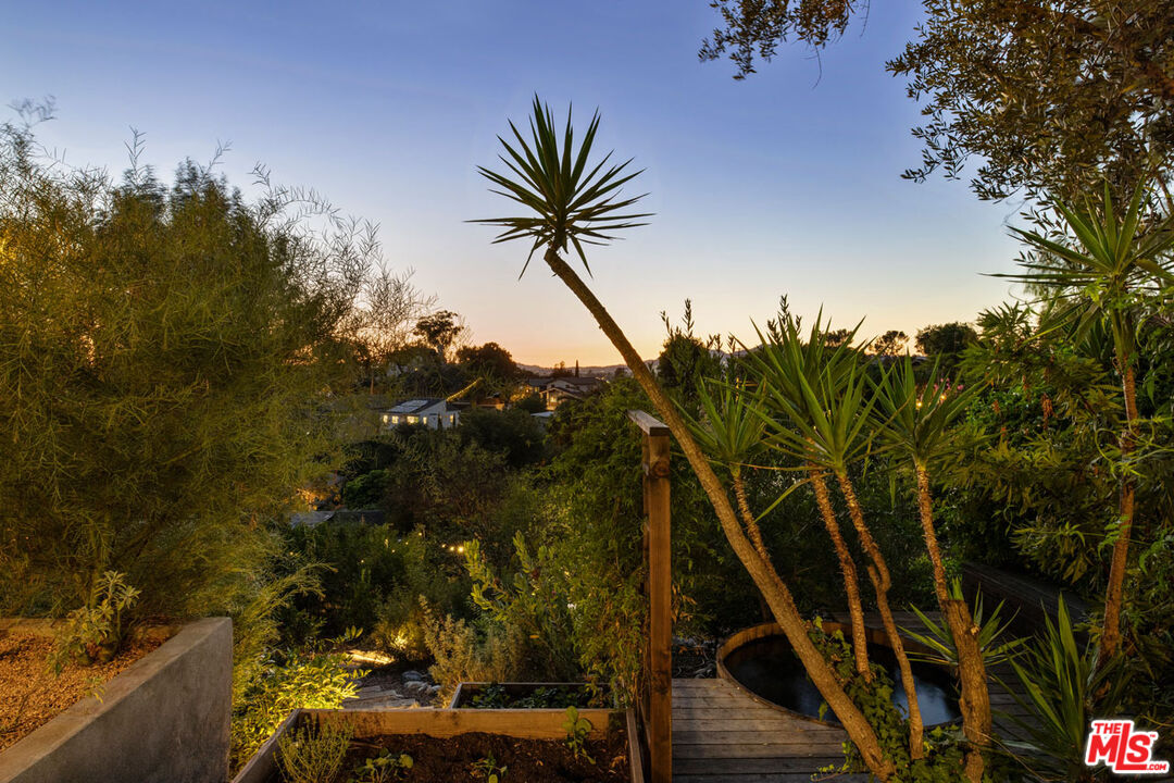 Celebrated in Domino for its artful renovation and magical garden by Terremoto, this 1938 home is a rare find in Echo Park. The light-filled interior features a formal entry with tile floors, an open living and dining area with a picture window and French doors leading to a deck with spectacular Observatory and sunset views; bamboo wood floors run throughout. The skylit chef's kitchen is outfitted with color-block cabinetry and stainless appliances. Bedrooms include a spacious ensuite and a second currently used as a den, along with an additional retreat that has its own entrance, bathroom, and a balcony shaded by a fig tree. The expansive verdant yard is set for gatherings and relaxation with a wood-fired pizza oven, cedar spa, outdoor shower, hammock zone, greenhouse, and a variety of fruit trees. Amenities include solar panels, driveway parking, central AC, and a separate laundry room/office. From this serene compound you're minutes from Elysian Park, Whole Foods, Canyon Coffee, and more.