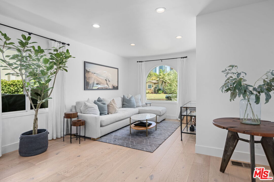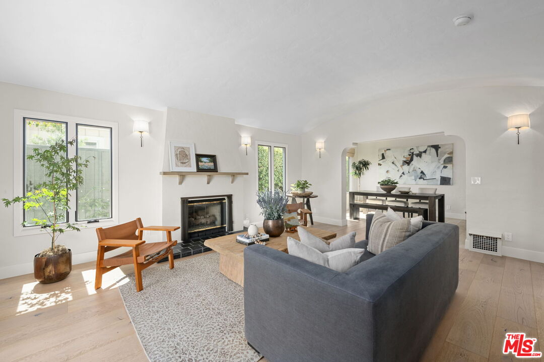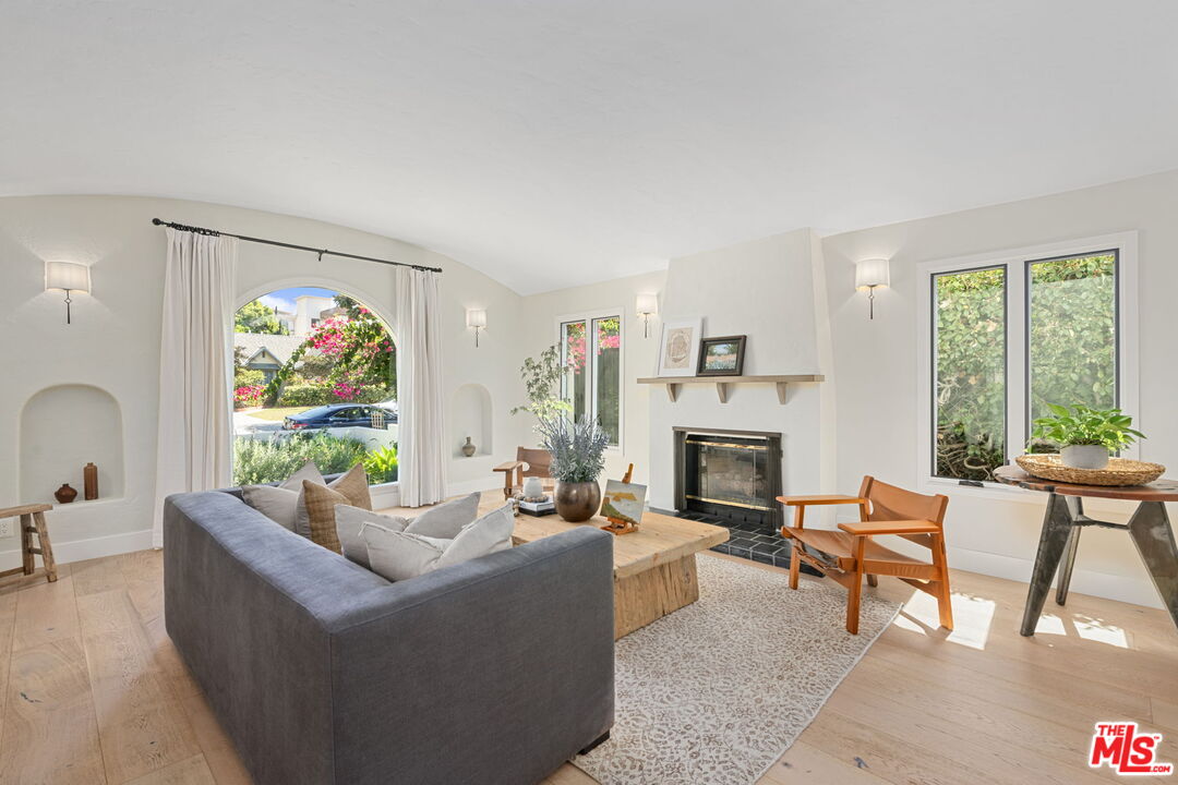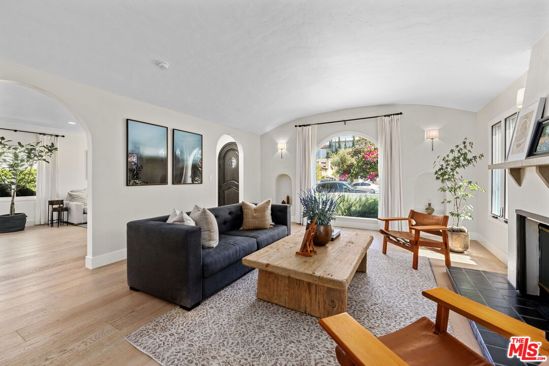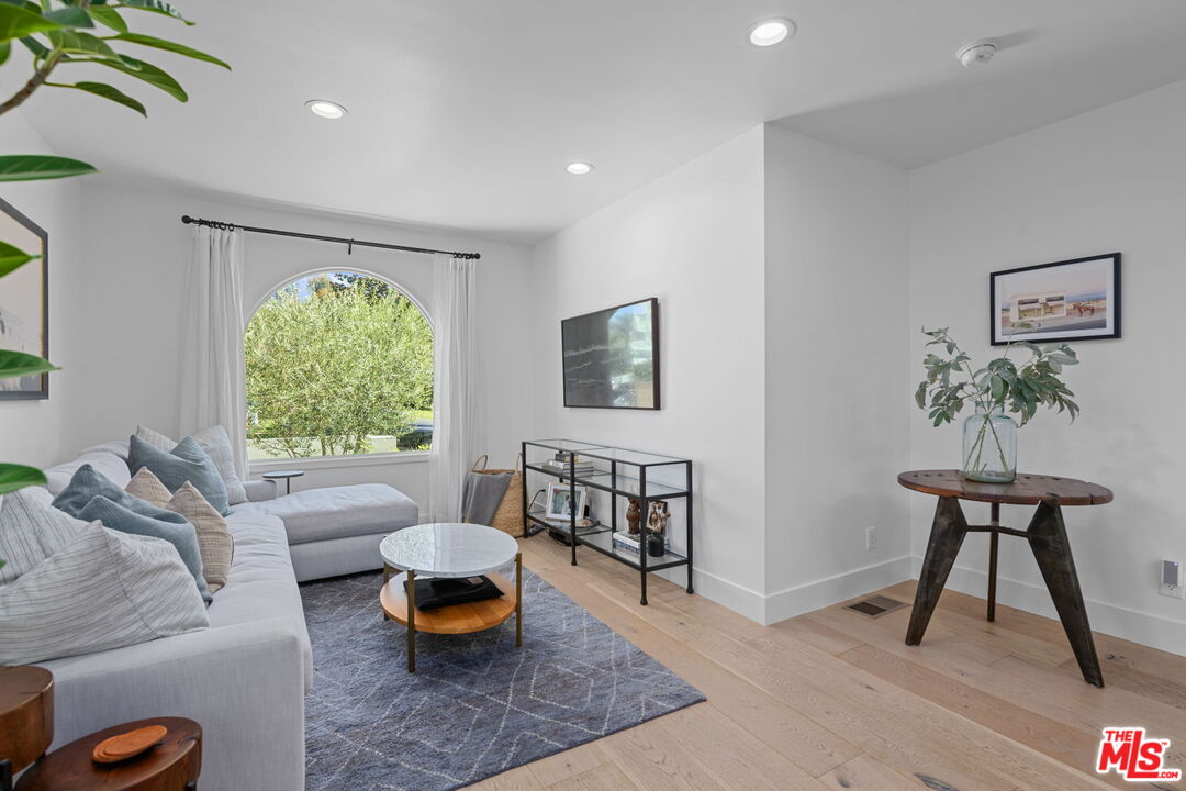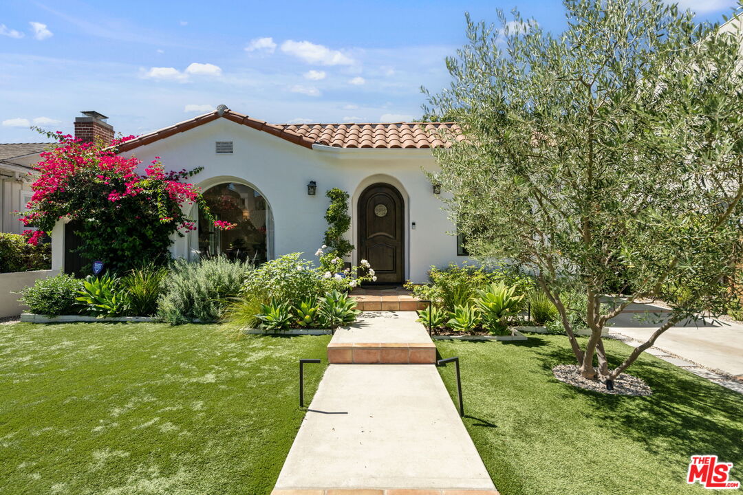 Sophisticated 3 bed/3 bath + family room (2,022 sqft) + 1 bed / 1 bath ADU (525 sqft) Modern Spanish designer-finished to perfection located on a flat lot on the West-side of Linnington. Professionally landscaped and enclosed and gated front yard with walkway to front paver-tiled front door entry with skylight. This home is filled with natural light throughout and beautifully remodeled finishes with the ideal open floor plan. Living room barrel ceiling, tiled gas fireplace, art niches, elegant wall sconce lighting and beautiful arched picture window, and formal dining room with arched entrance, recessed lighting, all opening to spacious front-facing family room opening to stunning contemporary kitchen with quartz countertops, skylight, stainless steel appliances including gas range, newer cabinetry, skylight and breakfast bar. Laundry room with side yard access off kitchen. Sun-filled primary suite with a custom walk-in closet, primary spa-like remodeled full bath with spa tub and separate shower and dual basins. Tranquil primary bedroom with french doors opening to spectacular entertainer's backyard deck, landscaped yard and 2 patio areas with custom built-in fireplace and barbecue, and double gated driveway. Newly finished ADU is an extension of this beautiful home with Fleetwood pocket doors, a serving window opening to outdoor, family room/convertible 4th bedroom with custom built-ins, workspace, wine fridge and bar, full kitchen with electric range and built-in microwave and window opening to backyard with counter for serving and outdoor entertaining. Stunning ADU 3/4 bath with marble and granite finishes. 2 additional bedrooms inside the home, one with an ensuite bathroom. Additional features include dual pane windows, white oak hardwood flooring, 3 completely updated bathrooms, California Closets, central ac/heat, all new interior doors and hardware. Ideal Century City Adjacent location, close to Westfield Century City Mall, UCLA and Beverly Hills. Westwood Charter School. This property shows incredible pride-of-ownership with stunning, thoughtful high-end quality finishes that will appeal to you from the moment you walk in the door.
