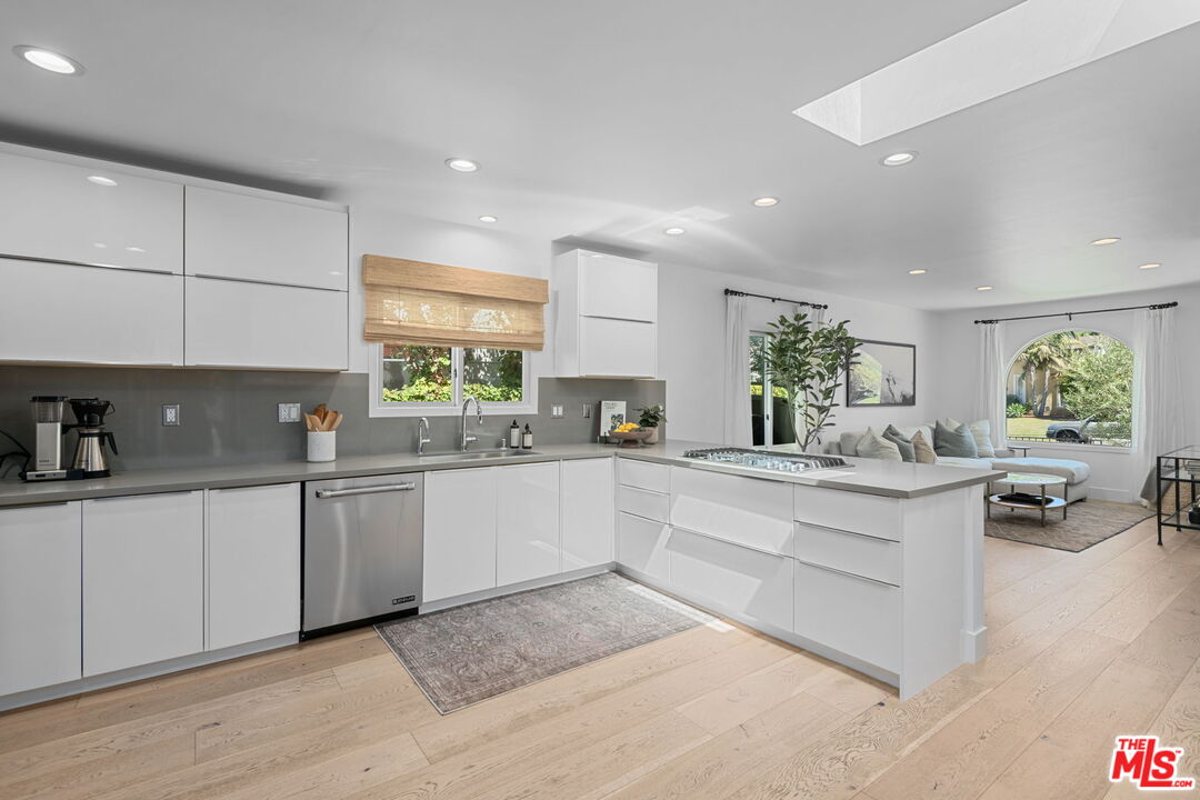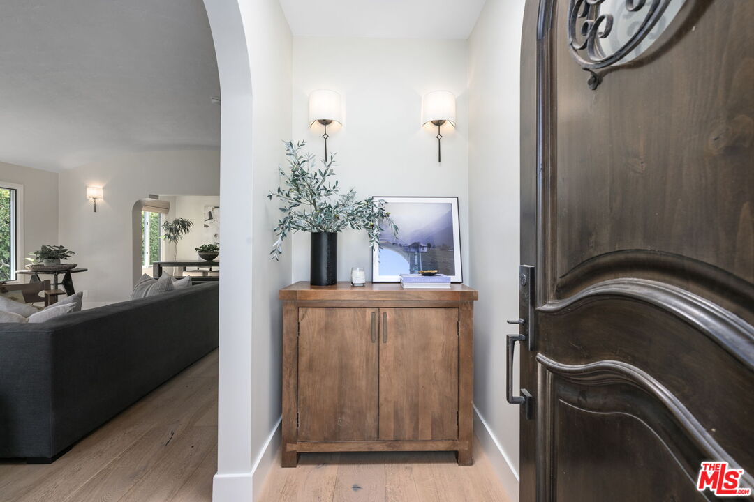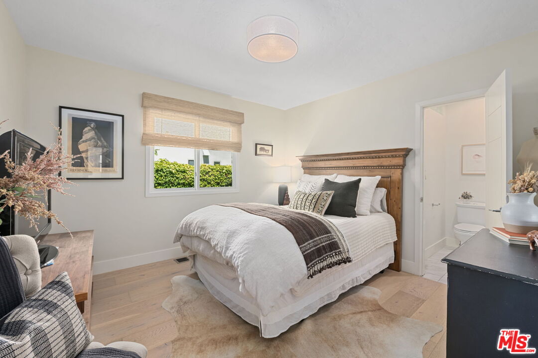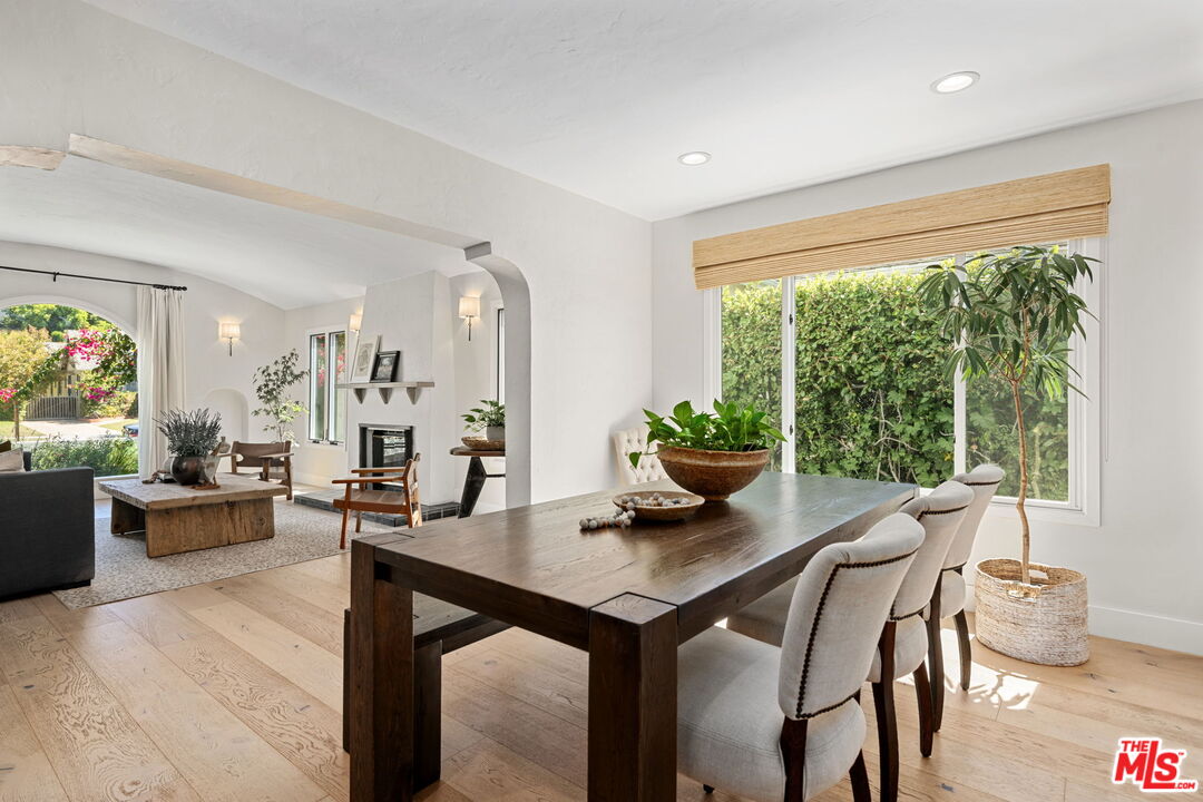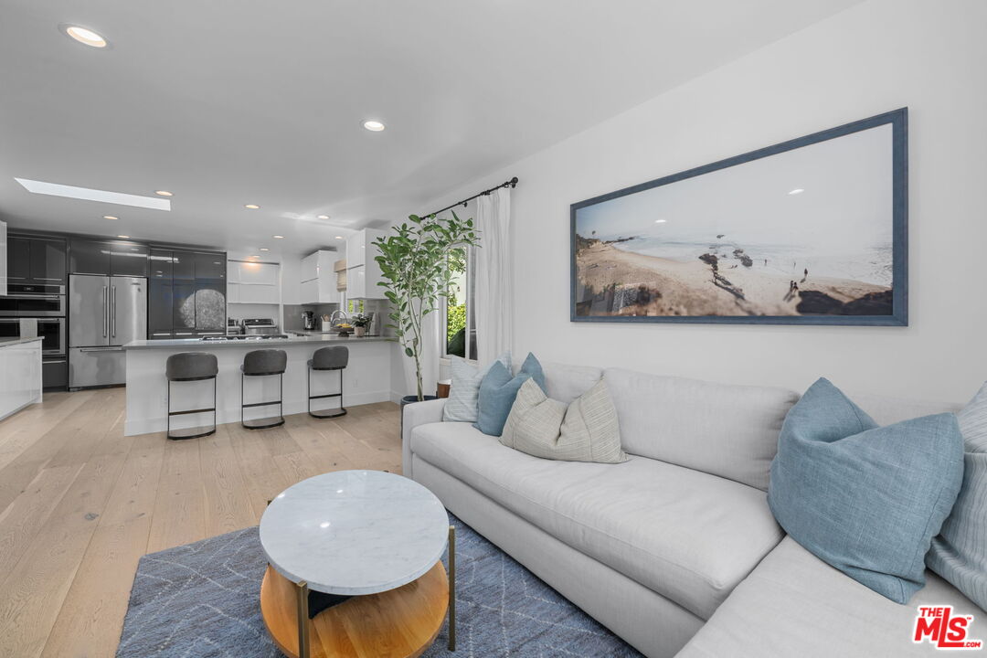 Sophisticated 3 bed/3 bath + family room (2,022 sqft) + 1 bed / 1 bath ADU (525 sqft) Modern Spanish designer-finished to perfection located on a flat lot on the West-side of Linnington. Professionally landscaped and enclosed and gated front yard with walkway to front paver-tiled front door entry with skylight. This home is filled with natural light throughout and beautifully remodeled finishes with the ideal open floor plan. Living room barrel ceiling, tiled gas fireplace, art niches, elegant wall sconce lighting and beautiful arched picture window, and formal dining room with arched entrance, recessed lighting, all opening to spacious front-facing family room opening to stunning contemporary kitchen with quartz countertops, skylight, stainless steel appliances including gas range, newer cabinetry, skylight and breakfast bar. Laundry room with side yard access off kitchen. Sun-filled primary suite with a custom walk-in closet, primary spa-like remodeled full bath with spa tub and separate shower and dual basins. Tranquil primary bedroom with french doors opening to spectacular entertainer's backyard deck, landscaped yard and 2 patio areas with custom built-in fireplace and barbecue, and double gated driveway. Newly finished ADU is an extension of this beautiful home with Fleetwood pocket doors, a serving window opening to outdoor, family room/convertible 4th bedroom with custom built-ins, workspace, wine fridge and bar, full kitchen with electric range and built-in microwave and window opening to backyard with counter for serving and outdoor entertaining. Stunning ADU 3/4 bath with marble and granite finishes. 2 additional bedrooms inside the home, one with an ensuite bathroom. Additional features include dual pane windows, white oak hardwood flooring, 3 completely updated bathrooms, California Closets, central ac/heat, all new interior doors and hardware. Ideal Century City Adjacent location, close to Westfield Century City Mall, UCLA and Beverly Hills. Westwood Charter School. This property shows incredible pride-of-ownership with stunning, thoughtful high-end quality finishes that will appeal to you from the moment you walk in the door.