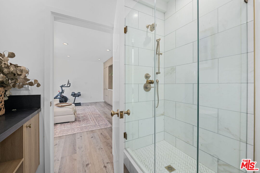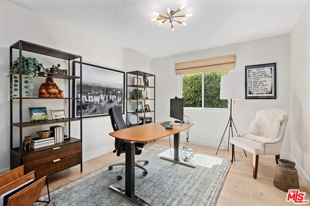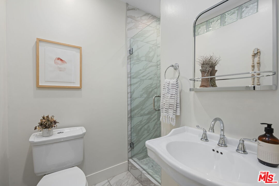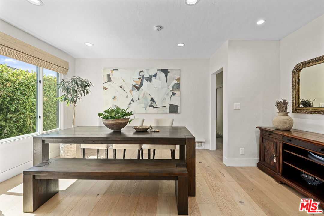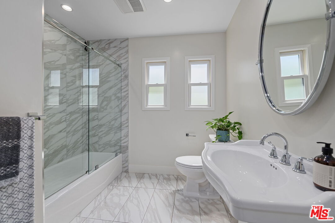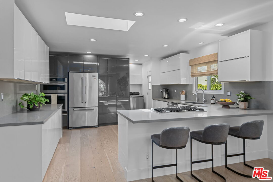 Sophisticated 3 bed/3 bath + family room (2,022 sqft) + 1 bed / 1 bath ADU (525 sqft) Modern Spanish designer-finished to perfection located on a flat lot on the West-side of Linnington. Professionally landscaped and enclosed and gated front yard with walkway to front paver-tiled front door entry with skylight. This home is filled with natural light throughout and beautifully remodeled finishes with the ideal open floor plan. Living room barrel ceiling, tiled gas fireplace, art niches, elegant wall sconce lighting and beautiful arched picture window, and formal dining room with arched entrance, recessed lighting, all opening to spacious front-facing family room opening to stunning contemporary kitchen with quartz countertops, skylight, stainless steel appliances including gas range, newer cabinetry, skylight and breakfast bar. Laundry room with side yard access off kitchen. Sun-filled primary suite with a custom walk-in closet, primary spa-like remodeled full bath with spa tub and separate shower and dual basins. Tranquil primary bedroom with french doors opening to spectacular entertainer's backyard deck, landscaped yard and 2 patio areas with custom built-in fireplace and barbecue, and double gated driveway. Newly finished ADU is an extension of this beautiful home with Fleetwood pocket doors, a serving window opening to outdoor, family room/convertible 4th bedroom with custom built-ins, workspace, wine fridge and bar, full kitchen with electric range and built-in microwave and window opening to backyard with counter for serving and outdoor entertaining. Stunning ADU 3/4 bath with marble and granite finishes. 2 additional bedrooms inside the home, one with an ensuite bathroom. Additional features include dual pane windows, white oak hardwood flooring, 3 completely updated bathrooms, California Closets, central ac/heat, all new interior doors and hardware. Ideal Century City Adjacent location, close to Westfield Century City Mall, UCLA and Beverly Hills. Westwood Charter School. This property shows incredible pride-of-ownership with stunning, thoughtful high-end quality finishes that will appeal to you from the moment you walk in the door.