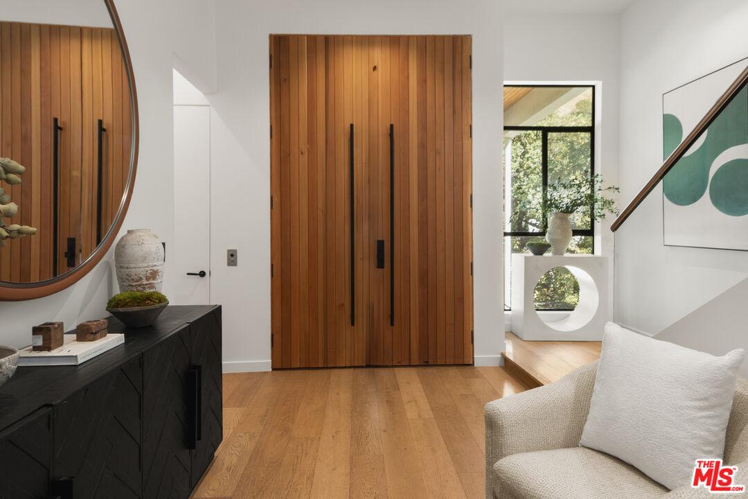 Meticulously renovated and masterfully reimagined, this exceptional modern residence in coveted Outpost Estates captures the essence of elevated Hollywood Hills living. Bathed in natural light, the main level features an expansive open-concept layout anchored by soaring 12-foot ceilings, seamlessly connecting the kitchen, dining, and living spaces--perfect for both refined entertaining and effortless everyday living. The chef's kitchen is a true showpiece, appointed with designer appliances, bespoke cabinetry, and striking Cosentino Dekton countertops. A chic powder room and a private guest suite with its own entrance complete the main floor, offering both versatility and comfort for visitors or extended stays. Upstairs, the stunning primary suite serves as a serene retreat, complete with direct access to one of two outdoor living spaces. Two additional en-suite bedrooms and a well-appointed laundry room complete the second level. At the pinnacle of the home, an expansive rooftop deck showcases sweeping canyon vistas and dazzling city-light views--an unforgettable backdrop for sunset gatherings or quiet evenings under the stars. A rare offering that seamlessly blends modern design, luxury finishes, and an unbeatable location.