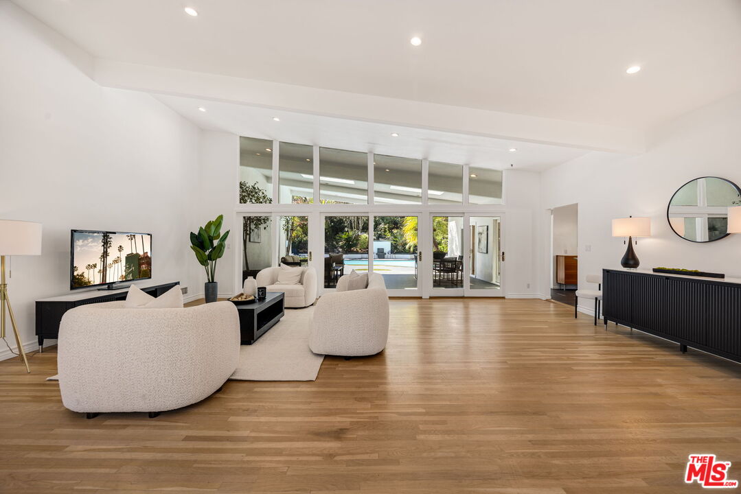 Unique Single-Story Contemporary luxury living home. 4 Bedroom, 3 baths plus an office in the most desirable location. Live amongst celebrities just minutes from the gated Beverly Park Estates & near the iconic Beverly Hills Hotel. Renovated w/ the finest materials. Welcome entry, magnificent high ceiling w/ barn beams, exquisite open dining & family room lead to walls of glass that open up to a covered patio, very spacious & private flat paradise backyard w/ sparkling pool, built-in wood burning barbecue & pizza oven. Perfect indoor/outdoor living & great for entertaining. Stunning new chef's kitchen w/ Viking stainless-steel appliances & top-of-the-line imported Italian cabinets. Laundry room w/ sink & lots of cabinets. Grand primary suite w/ two separate dual walk-in closets and private office. Primary bath w/ jetted spa tub & separate large shower w/ double sink. Three additional spacious bedrooms & baths. Warner Avenue Elementary school district!