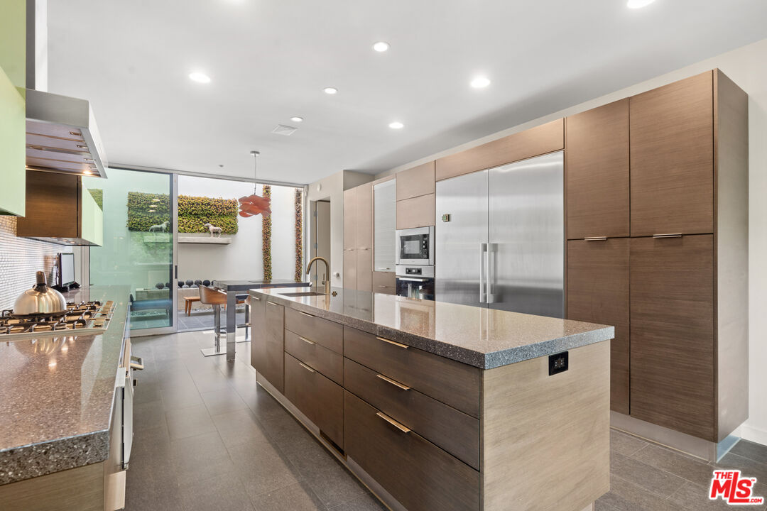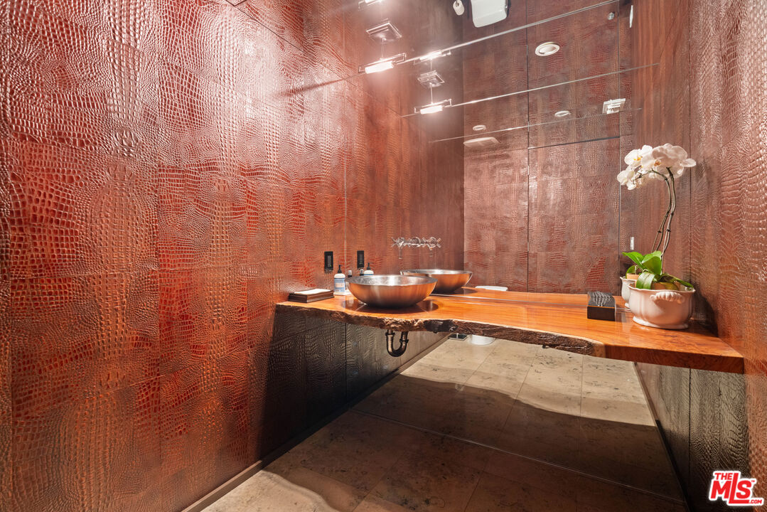 This secluded modern residence, crafted by renowned architect Steven Ehrlich after time spent in Africa with interiors by Mark Brunetz, offers unparalleled privacy at the end of a gated long driveway while surrounded by lush greenery. Floor-to-ceiling windows flood the living spaces with natural light and treetop views of the surrounding hills. The main level features a grand living room with a magnificent Murano glass chandelier, a functional fireplace, a massive family room with an adjacent crocodile leather imprint walled powder room, and a formal dining room. The custom kitchen boasts top-of-the-line Miele stainless steel appliances, Gaggenau and Fisher & Paykel, and an oversized island for casual dining. Additionally, the residence features a motorcourt for convenient parking and easy access to the home. Upstairs, the primary suite offers automatic shades along with blackout curtains, a TV that elegantly descends from the ceiling, as well as a walk-in closet with built-in walls. A spa-like en-suite bathroom adjoins with exquisite Bisazza tilework which cascades from light to dark as you walk through the room, plus a spa bathtub, steam shower and an in-wall Ariston espresso maker. The outdoor space includes a heated spa and pool with outdoor entertaining areas and a viewing deck that offers panoramic views from the top of the hill behind the home connected by a charming staircase. Three guest bedrooms, one with an en-suite bath, provide ample accommodation, while the additional guest bedrooms share a bathroom complete with both a shower and a bathtub. Underneath, a versatile space awaits, with a room equipped with a bathroom and shower which has easy access to the pool and can serve as a workout room or workplace. With meticulous attention to detail and modern conveniences throughout, this exceptional residence epitomizes luxury living in a serene oasis.