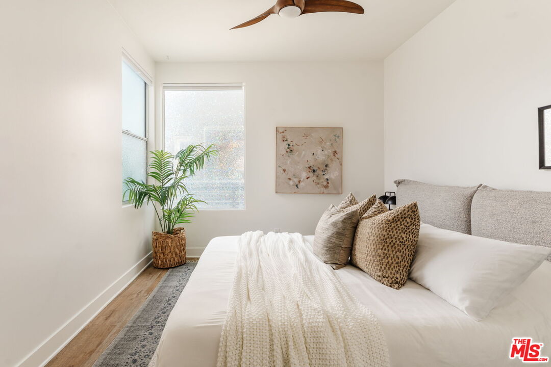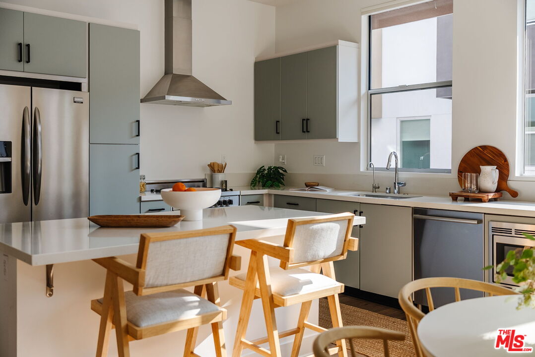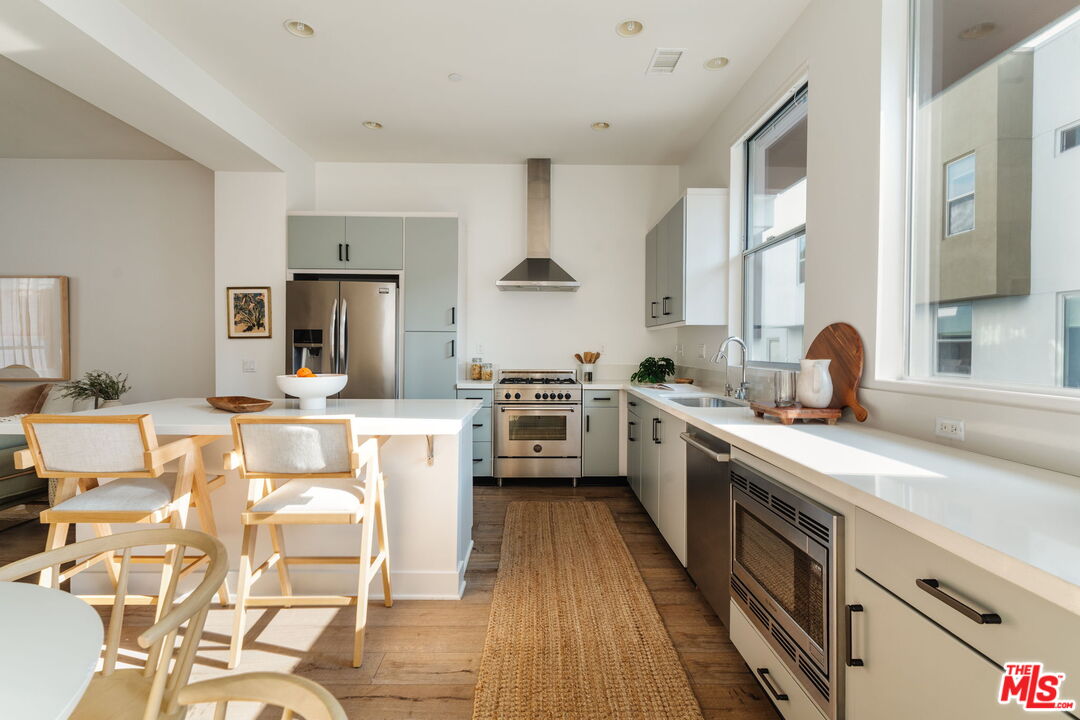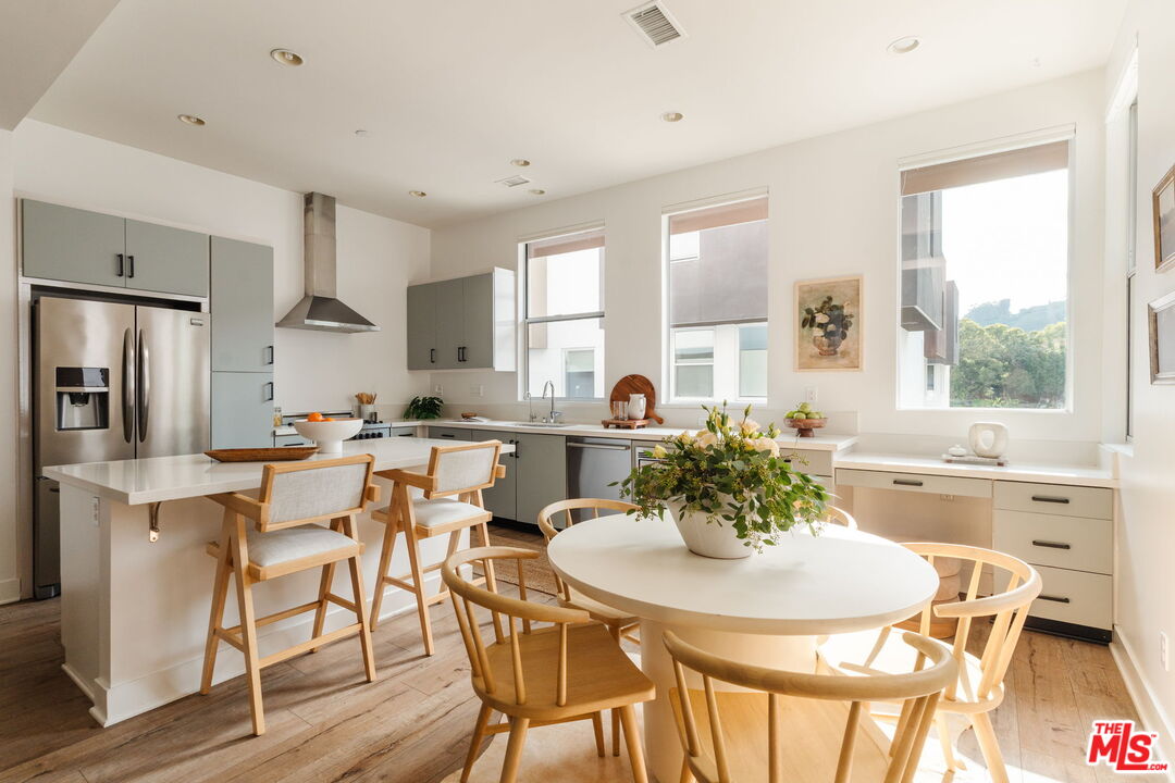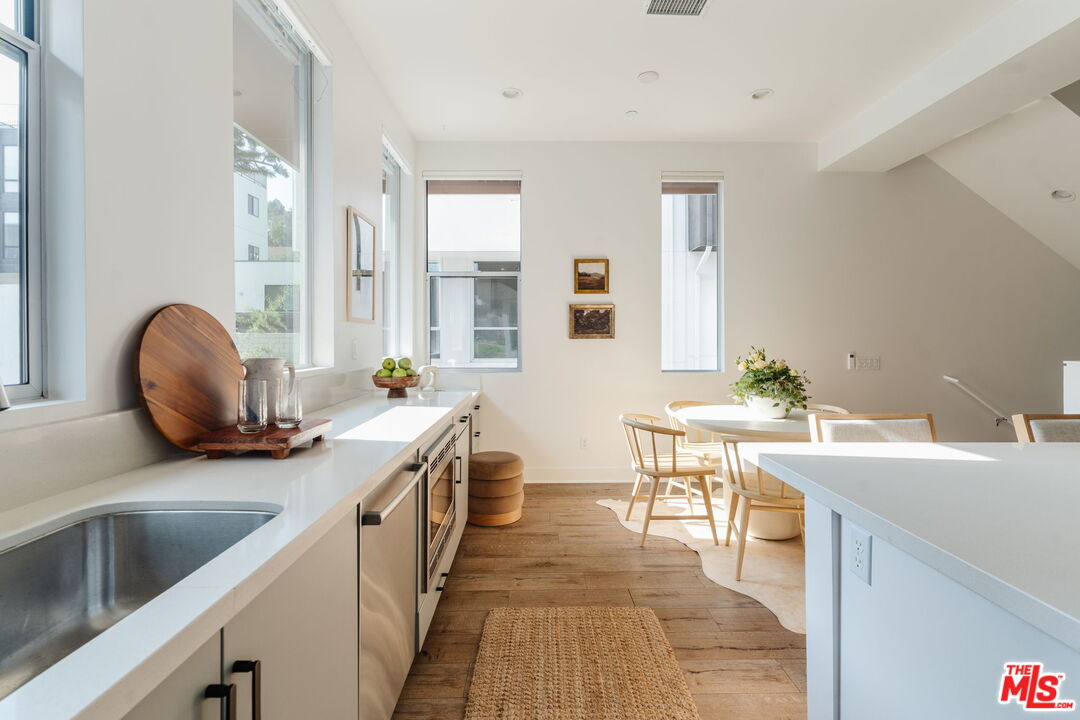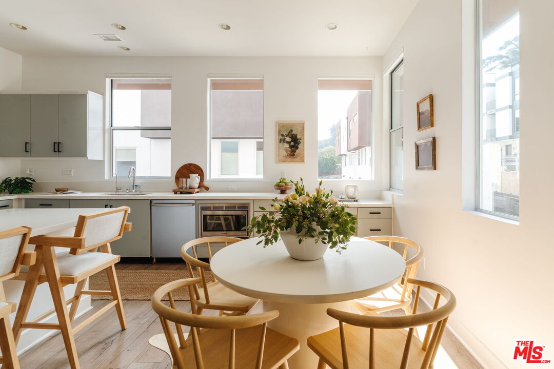 Set within one of Silver Lake's most sought-after enclaves, this fully detached contemporary home blends privacy, light-filled interiors, and a thoughtfully designed floor plan for modern living. Positioned as a desirable corner unit with no shared walls and no HOA dues, the home feels peaceful and removed while remaining moments from the heart of the neighborhood. Thoughtfully updated throughout, the residence features wide-plank flooring in a warm oak tone throughout, 10-foot ceilings, automated window blinds, and a bright, airy layout that enhances everyday living. The open living and dining areas flow seamlessly and are filled with natural light, creating an inviting space for both entertaining and quiet moments at home. The kitchen balances function and style with European stainless steel appliances, a Bertazzoni gas range, sleek quartz countertops, and generous cabinetry. Upstairs, three well-appointed bedrooms offer comfort and flexibility, including a serene primary suite with an ensuite bath and custom closet systems by Lif in Jeneral, along with two additional bedrooms ideal for guests, family, or a dedicated home office. One of the home's standout features is the private rooftop deck, a tranquil outdoor retreat with sweeping hillside views, perfect for morning coffee, sunset gatherings, or relaxed weekends at home. With direct-access parking, in-unit laundry, and move-in-ready interiors, the home offers the ease and privacy of single-family living within a well-loved community. Located in the heart of Silver Lake, just moments from LaMill, Botanica, Bar Siesta, the Reservoir, and so much more, this is design-conscious living in a truly special setting.