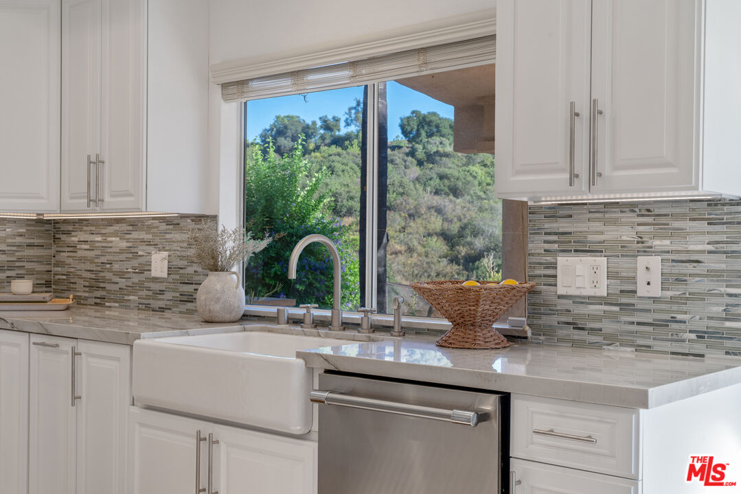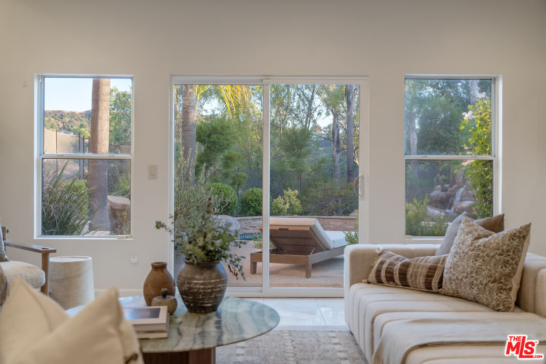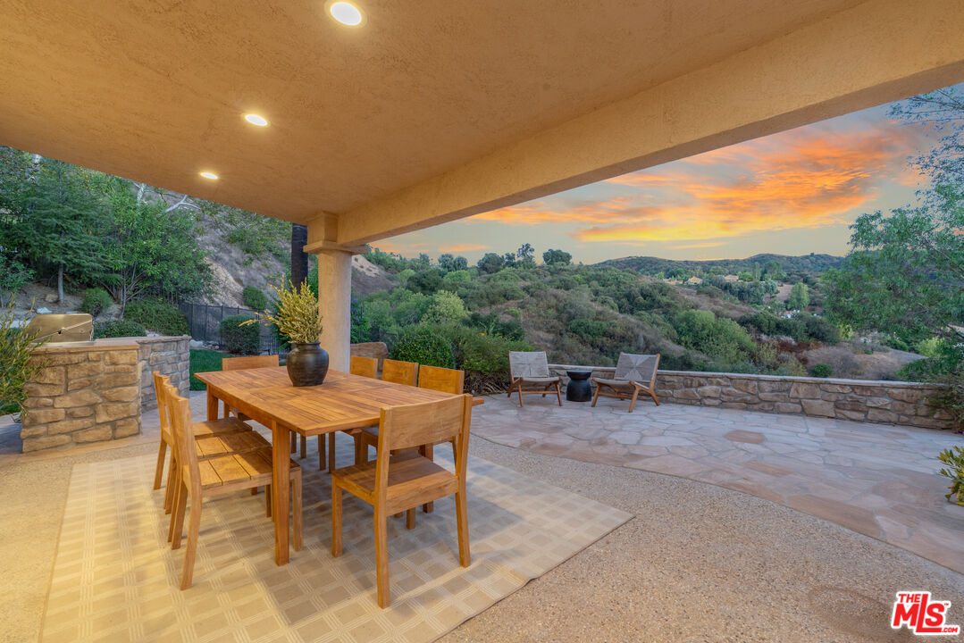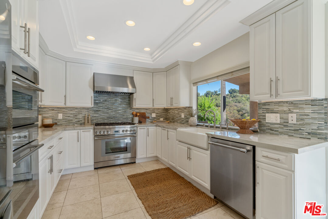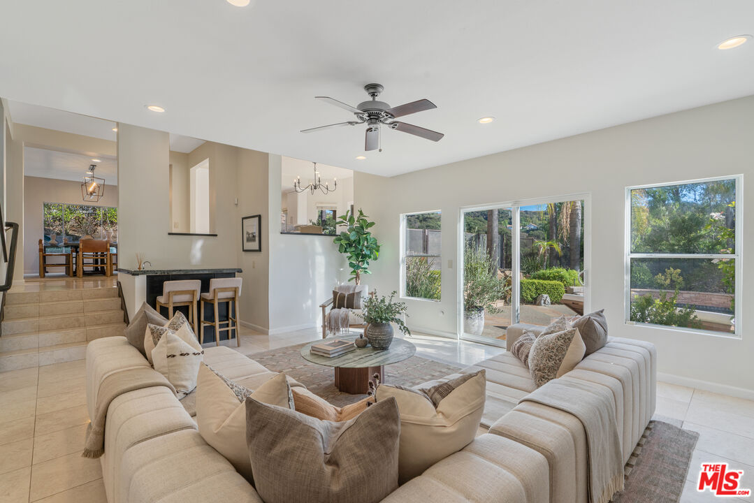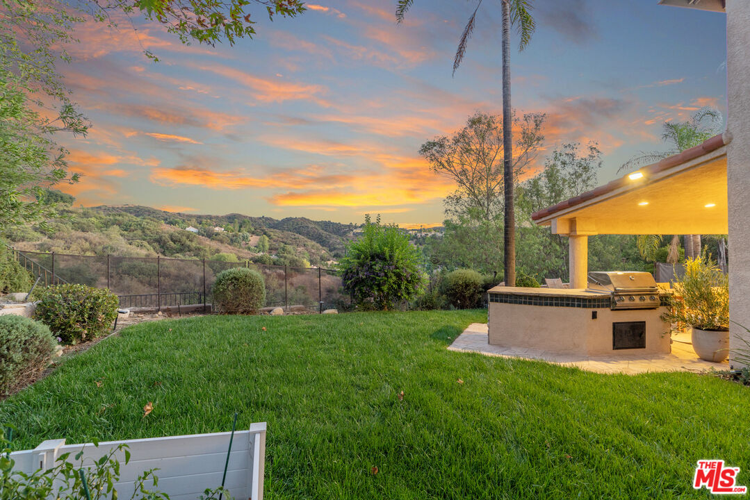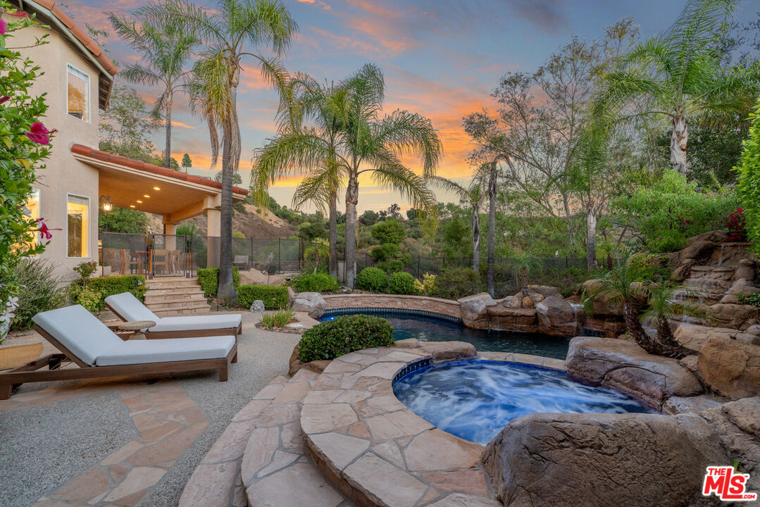 Serene upgraded Mulholland Heights Retreat with Panoramic Views and resort style back yard at end of cul-de-sac. Tucked away at the end of a quiet cul-de-sac, this upgraded Mulholland Heights residence showcases sweeping canyon views, unparalleled privacy and expansive backyard. Designed for both relaxation and entertaining, the outdoor oasis features cascading waterfalls, tranquil water features a pool, spa, and lush tropical landscaping. Inside, the spacious and open floor plan is filled with natural light from walls of glass and soaring vaulted ceilings. Multiple living areas provide the perfect blend of comfort and elegance. The chef's kitchen, outfitted with new Thermador appliances, overlooks the backyard, canyon vistas, and a covered outdoor dining terrace with a built-in BBQ. The home offers 4 generously sized bedrooms, including an expansive primary suite with a sitting room, vanity area, large walk-in closet, and a newly remodeled spa-like bath with walk-in shower and pedestal soaking tub. Additional features include state of the art security systems, smart irrigation systems and oversized 3 car garage with built ins and storage racks. Located within the award-winning Las Virgenes School District and just minutes from top-rated schools, this rare offering combines luxury, privacy, and convenience in one of Calabasas' most desirable neighborhoods.