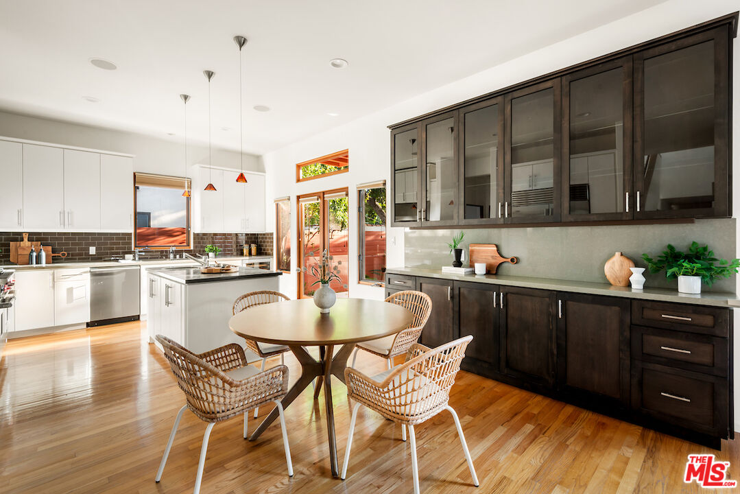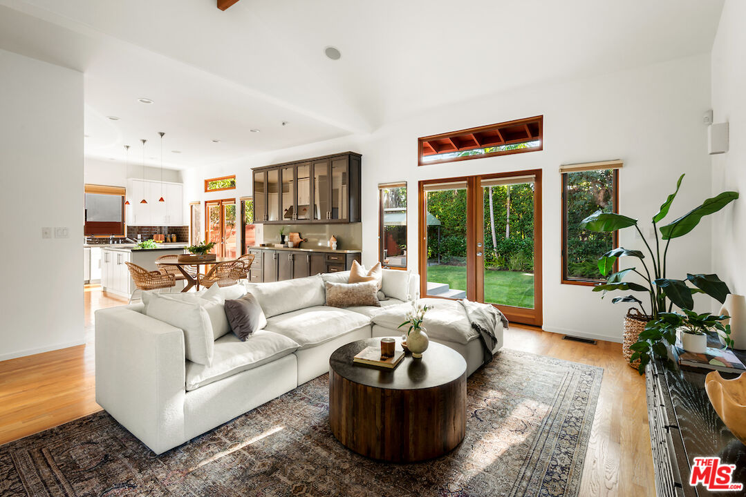 Architecturally designed and custom built contemporary Mediterranean on a large lush lot in a great mid-block location. The residence has an outstanding indoor outdoor flow, high volume vaulted ceilings with Douglas Fir wood beams, skylights, warm wood flooring and walls of stone. The home features an open floor plan, large living room with fireplace, a separate dining room with access through French doors to an outdoor patio, a gourmet kitchen with six-burner Wolf range, Sub-Zero refrigerator, Miele dishwasher and wine fridge, an island, an eating area and built-ins. The kitchen opens to a large family room perfect for media and entertaining. The kitchen-family room has easy access through sets of French doors to a spacious back patio, several seating areas and large grassy enclosed back yard with mature landscaping and room for a pool. There is an office/bedroom plus one and a half baths on the first level. The second level has great light with high vaulted ceilings and enormous windows. The spacious primary bedroom suite has dual walk in closets, a spa-like bathroom and a large balcony. There are two additional large bedrooms with lots of light. The garage is oversized with direct entry into the house.