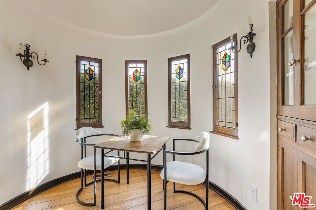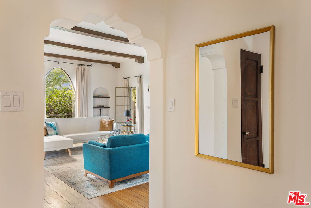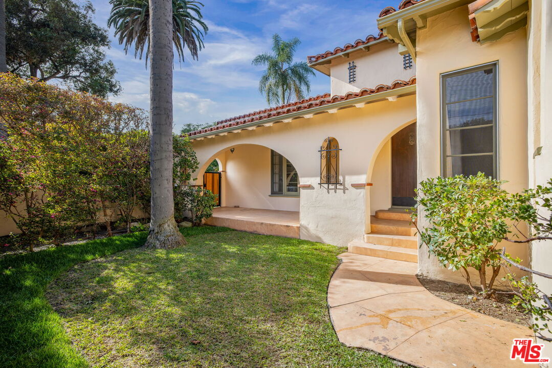 Stunning courtyard Spanish set on a prime corner lot near the coveted Westwood Charter Elementary School. This exceptional residence showcases a gracious formal living room with exposed wood beams, custom built-in shelving, and expansive encasement windows that open to welcome abundant natural light and cooling breezes. A striking central arched window frames serene views of the lush landscaping, enhancing the home's timeless architectural appeal.The thoughtfully designed floor plan offers 4 bedrooms and 3 baths, including a gourmet cook's kitchen, elegant formal dining room, and a charming breakfast nook highlighted by stained glass windows. Warmth and character are found throughout, with decorative archways, hardwood floors, and large windows that flood the interiors with light while maintaining privacy. Outdoors, mature landscaping surrounds the property, creating a peaceful backyard retreat complete with fruit trees ideal for entertaining, gatherings, or relaxed alfresco dining.Ideally located near UCLA, acclaimed schools, shopping, and dining, with convenient access to all parts of Los Angeles. A rare opportunity to own a timeless Spanish-style home defined by light, privacy, and enduring charm.