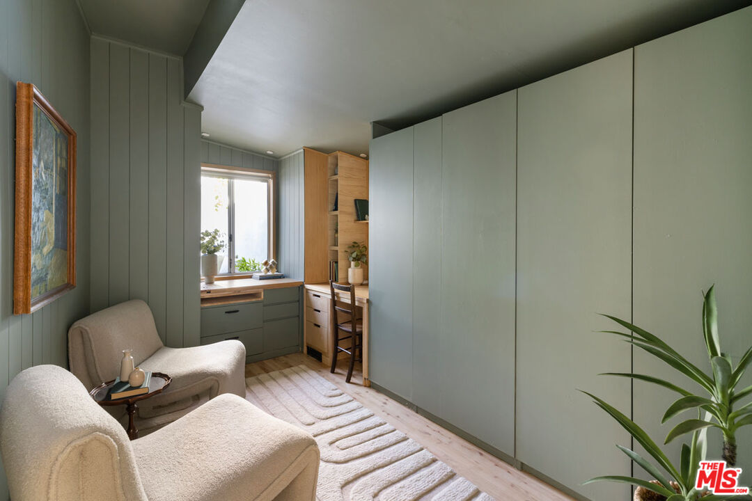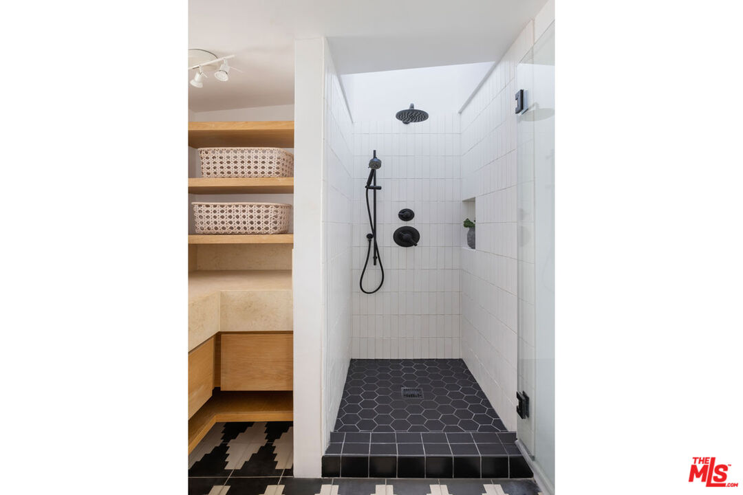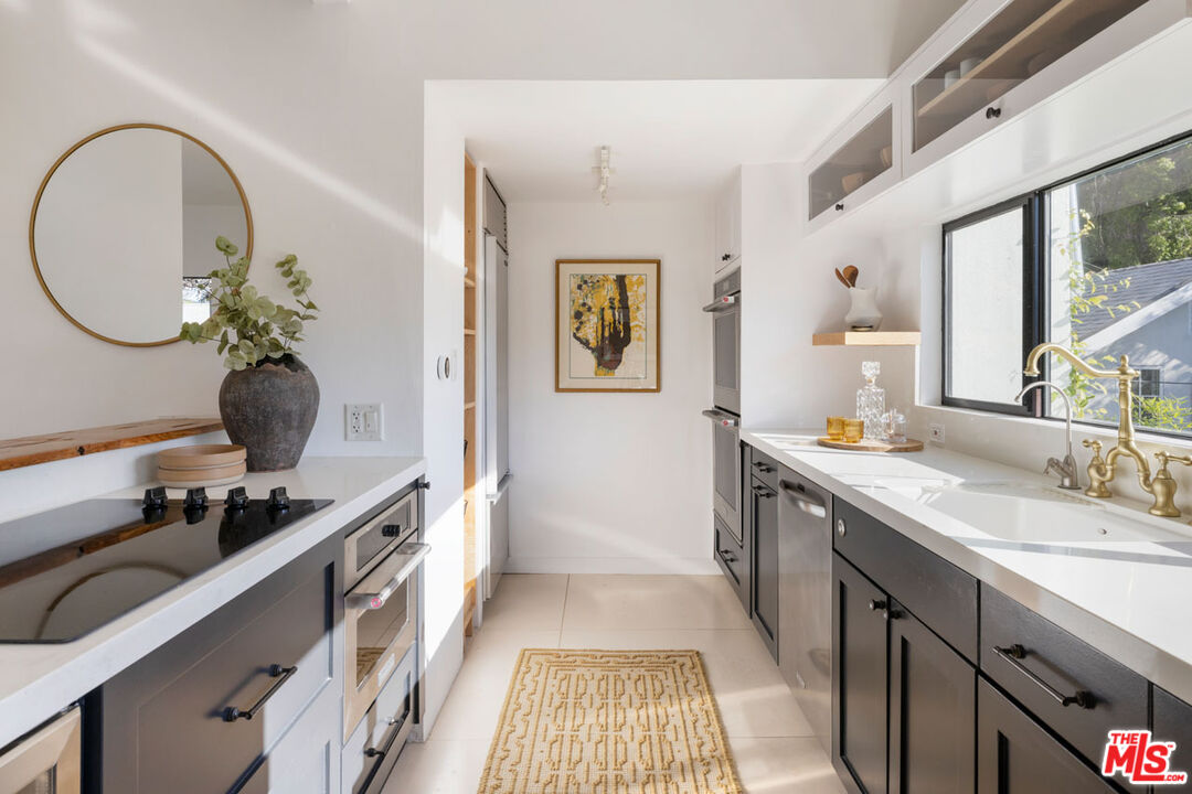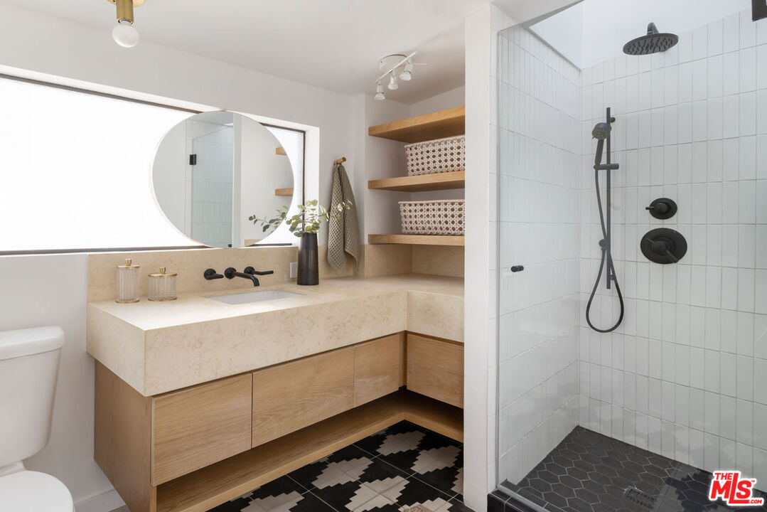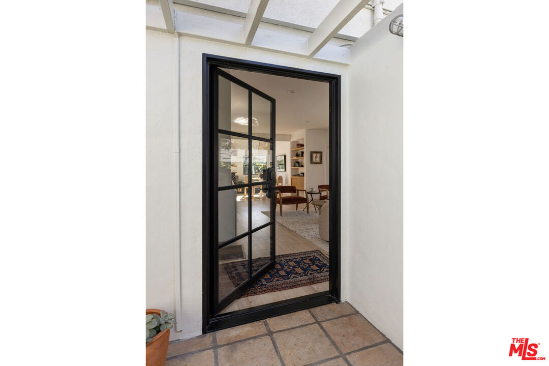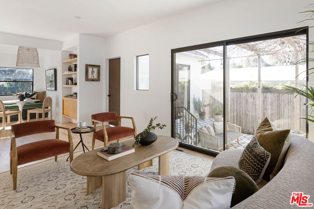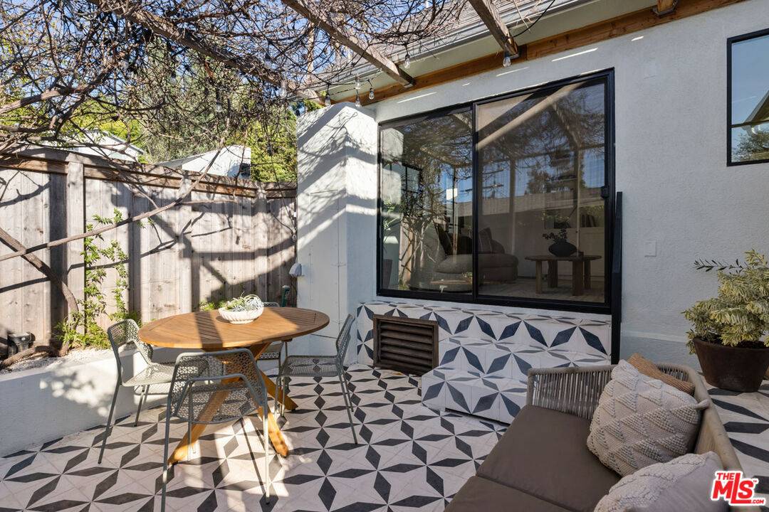 In Silver Lake, this updated bungalow presents stylish indoor-outdoor living with a private garden oasis and spacious work studio. Designed with crisp modern lines, elevated details, and abundant storage, the open floor plan is filled with natural light. Glass sliders connect the generous living space to a sunken patio finished with geometric tile and wrapped by grape vines, olives, and pomegranate trees. The kitchen features stainless appliances, a wine fridge, built-in banquette for morning coffee, and a breakfast island overlooking hillside views. Two bedrooms include a large primary opening to the patio; the spa-like bath has a skylight. The lower-level studio is beautifully rendered with beamed ceilings, wood floors, kitchenette, and full bath, perfect for creative workspace or guests. Amenities include central AC/heat, EV charger, and a carport with electric gate. You're moments from Whole Foods, Botanica, Silver Lake Wine, and more, with a short hop to the Silver Lake Reservoir and Dog Park.