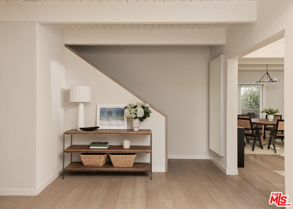 Set on one of the coveted flat streets in the hills of Elysian Heights, this modern A-frame inspired residence offers striking architecture, thoughtful design, and an exceptional sense of space across a light-filled foot floor plan. Soaring ceilings, warm materials, and curated finishes create a seamless balance of rustic charm and modern convenience.Upon arrival, a welcoming entry and oversized mudroom establish a sense of flow and intention. The main living areas unfold into an expansive great room where vaulted tongue-and-groove ceilings, clerestory windows, and a gas fireplace set a warm yet dramatic backdrop. The kitchen is both streamlined and expressive, outfitted with integrated appliances, open shelving, custom lighting, abundant storage, and connects naturally to an intimate den perfect for casual evenings or quiet mornings. Natural light pours throughout the 4-bedroom, 3-bath home via multiple skylights. The main level also includes a bedroom, full bath, and laundry area. Public spaces extend outdoors to an expansive 1,800+ square-foot refinished deck overlooking treetops, rolling hillsides, Downtown Los Angeles views, and a resort-style saltwater pool, spa, and fire pit ideal for entertaining or unwinding in total privacy. Upstairs, the serene primary suite offers dual closets and a beautifully designed bathroom with a soaking tub, walk-in shower, and dual-sink vanity. Two additional bedrooms and a full bathroom complete the second level. A detached office/gym provides a quiet, private space for work or creative pursuits. Meticulously updated interiors showcase designer finishes, custom millwork, and thoughtful details throughout. Updated systems and solar panels complete the offering. Ideally situated in Echo Park, just steps from the outdoors and moments from neighborhood favorites, Sunset Boulevard, and Silver Lake, this home delivers inspired design, effortless indoor-outdoor living, and a true urban hillside escape.