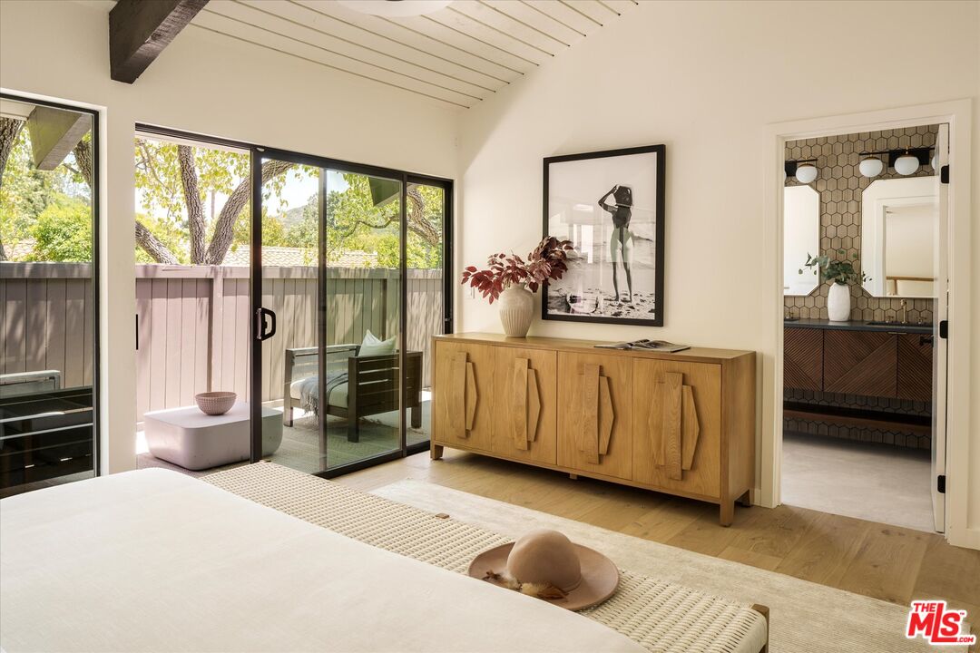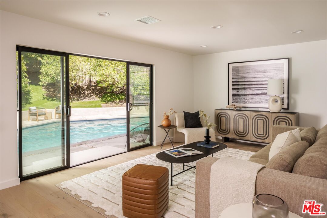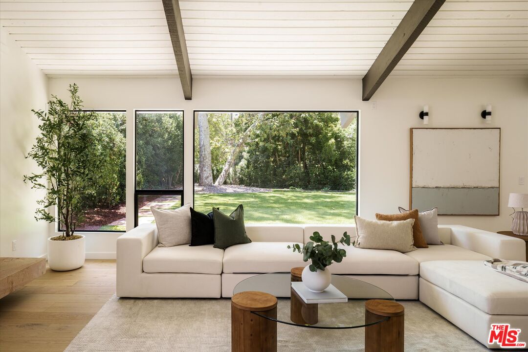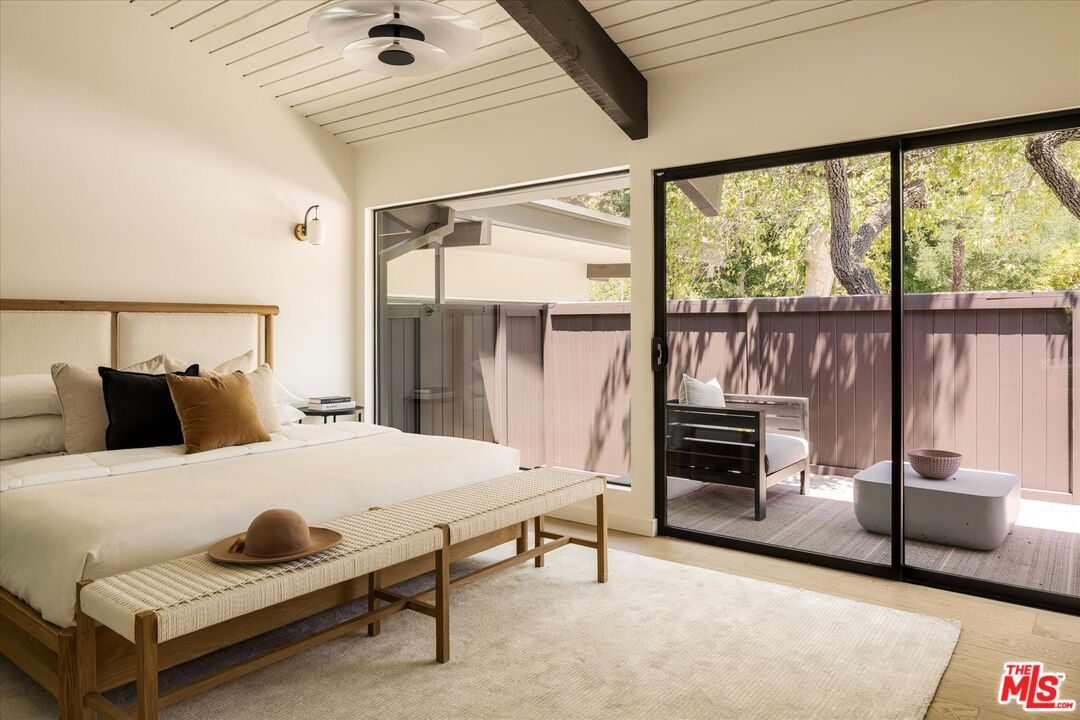 ALSO FOR LEASE AT $16,900 PER MONTH. Quiet and peace is what you'll find tucked at the end of a long, gated drive on a generous flag lot in the Brentwood Hills section of Mandeville Canyon. This down-to-the-studs mid-century modern remodel is a study in quiet luxury and thoughtful living. Surrounded by hedges and flanked by your own private hillside, the property offers a sense of seclusion that's rare especially just minutes from Sunset Blvd. Vaulted ceilings create openness throughout. Two bedrooms are on the main floor, including the primary with luxurious en-suite bath and its own private patio, perfect for a morning coffee. The second features its own en-suite bath, making it an ideal guest suite, home office, or creative studio. Upstairs, three additional bedrooms & 2 full baths, plus a loft-style den create space for work, guests, study, or media. The home's scale is human, but the lot is expansive, allowing indoor and outdoor living to coexist with ease. Two large yard spaces create natural zones for entertaining. On the side, a wide flat lawn opens off the living and dining rooms, perfect for outdoor dinners, a volleyball or soccer game, or just relaxing. In the back, a totally renovated pool and patio connect to the kitchen and den, set against the hillside for added privacy. New systems including three zone HVAC, tankless water heaters, and appliances by Wolf, Cove, and Sub-Zero bring comfort and convenience, while wide-plank European oak floors and clean, classic finishes keep the look grounded and timeless in mid century detail. Designer finishes and thoughtful selections throughout reflect the care that went into crafting the updated version of the home. There's ample parking both behind the gate and curbside on the neighborhood's wide streets, where underground utilities keep sightlines clear and the environment uncluttered. For those who love the outdoors, the nearby Westridge Trailhead offers a local escape with canyon paths and sweeping ocean views, perfect for morning hikes, dog walks, or just clearing your head. Within the boundaries of highly regarded public schools (Kenter Canyon Elementary, Paul Revere Middle and Palisades High School) and close to some of LA's most sought-after private campuses, this location blends the best of quiet canyon living with access to everything the Westside has to offer. Minutes from Amici, Brentwood Country Mart, the farmer's market on Graetna Green as well as the shops on Montana in Santa Monica. Originally built as the model home for the neighborhood in the early 1960s and held by the same family ever since, it's been expanded and reimagined for modern living. Though rooted in history, the home feels brand new. Only the mature trees, original MCM design, and wood-burning fireplace hint at the eras of days gone by. It's truly the best of both worlds: classic mid-century Brentwood with all the comforts and confidence of new construction. Floorplan measured by Cubi Casa. Presumed accurate but not guaranteed.