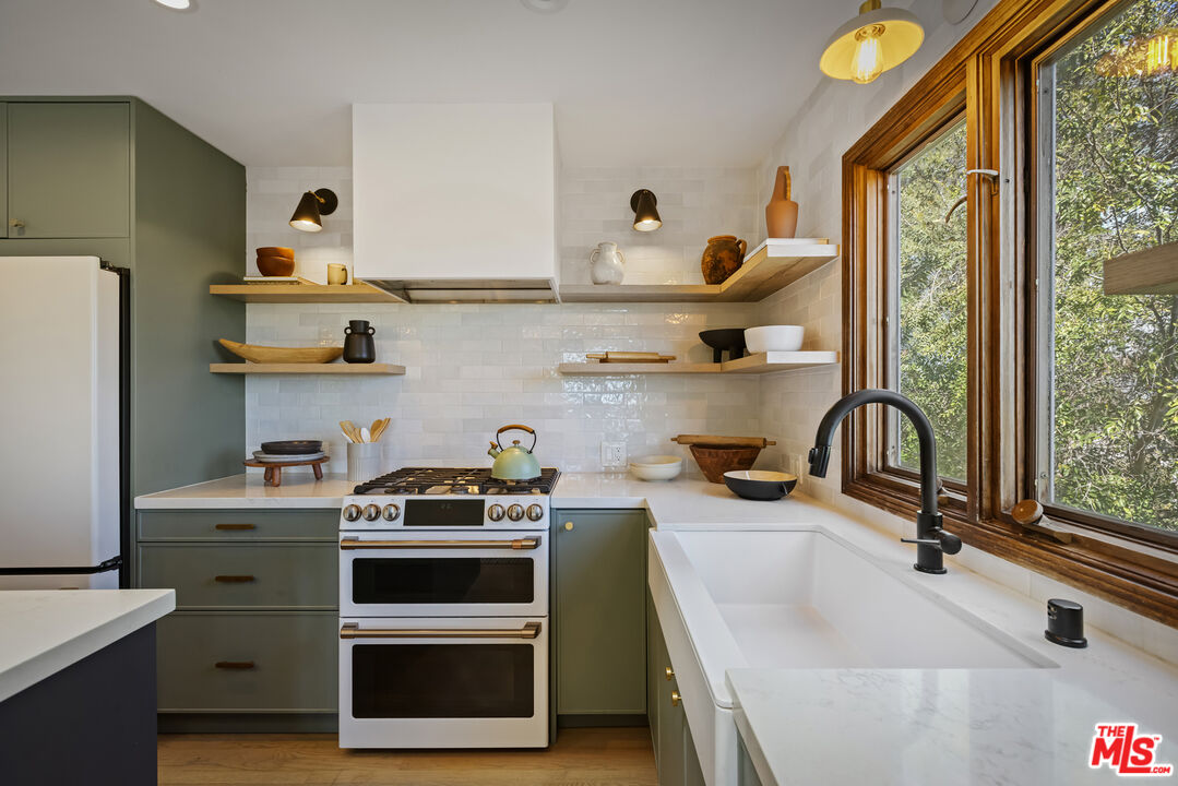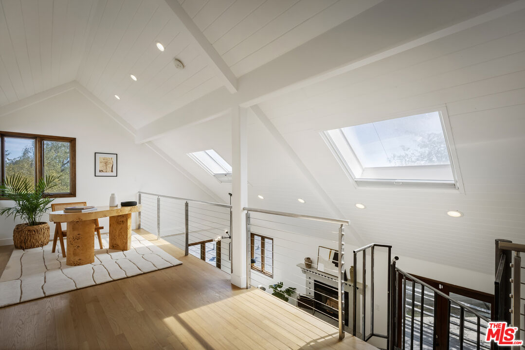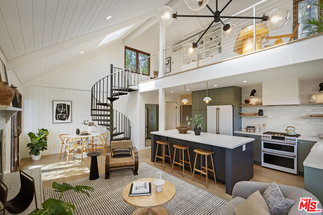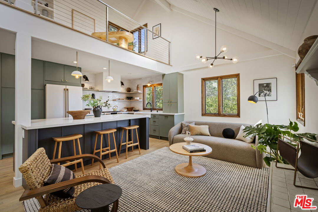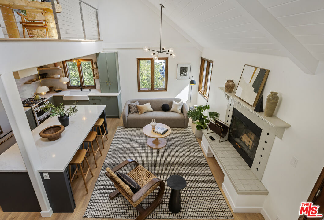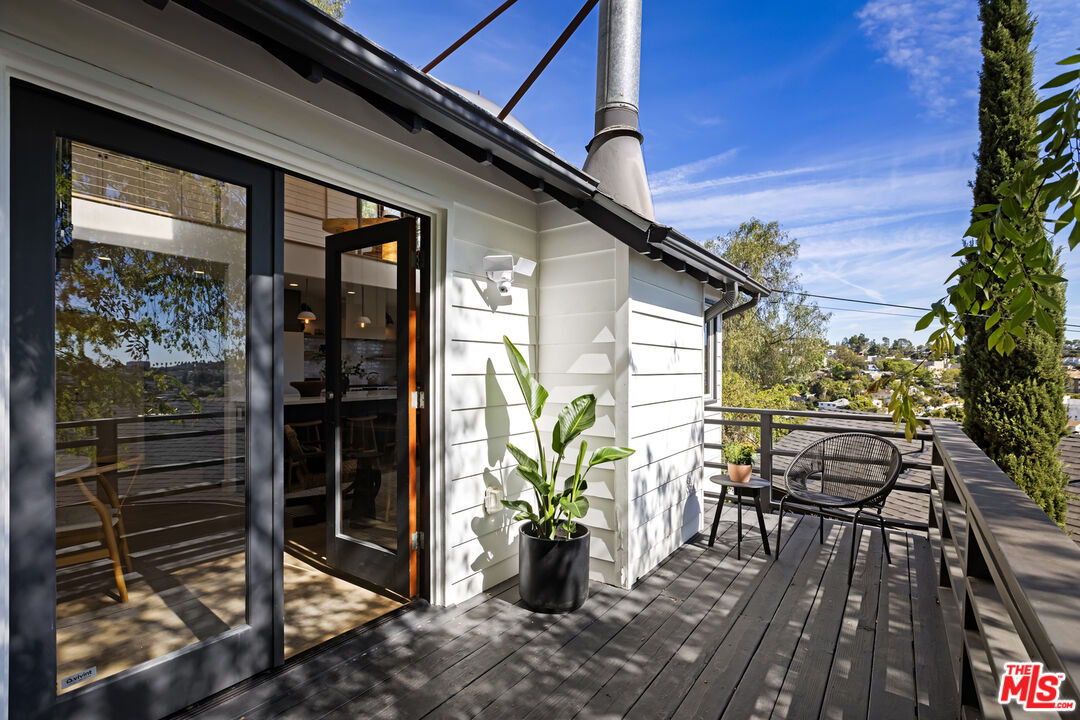Thoughtfully positioned on a quiet Cul-De-Sac in the Silver Lake Highlands where Effie St. culminates to a stair street sits this exquisite architectural treehouse with 180-degree views. A private oasis in the clouds, gated discreetly for privacy; the front balcony reached from a semi-private driveway reveals a wide-open picture over Elysian Park/Dodger Stadium, spanning beyond Little Tokyo and Downtown LA. Dual front doors of glass open to the bright front room with fireplace. Skylights, a multitude of windows and the glow of glass bricks saturate every bit of space with sunlight and shadows. Spiral staircase leads to the loft with built-in book storage which proves the perfect nook for office or reading. The chic Chef's kitchen features an island with built in beverage/wine cooler and entertainers barstool seating. Designer appliances including Cafe' refrigerator and range and a Bosch dishwasher. Ample cabinets and shelving for appliances give convenience and maximum use of space. On the main level are two generous bedrooms in size, second bedroom with a cedar closet and accent designer wall. From the first level, the private garden with soaring walls of creeping fig, separate entrance, built in Fisher & Paykal grill, gas fire feature and built in seating create the atmosphere for summer time al fresco dining. A stairwell with ascending windows to the primary suite with a private balcony among the trees, oversized luxury closet, primary En suite bath and an airy and bright loft of its own creating a tranquil retreat. The wrap around deck, also overlooking City Hall and DTLA is encompassed by mature pepper trees.Other notables, a tankless water heater, large 2 car garage with integrated shelving for storage and a wide drive for optional parking. Proximity to Sunset Blvd with it's eateries, boutiques and coffee shops. Retreat above the noise and experience Silver Lake and Echo Park with its hidden history feel. Silver Lake continues to be proven one of the most exciting and creative neighborhoods, unmatched in Los Angeles.