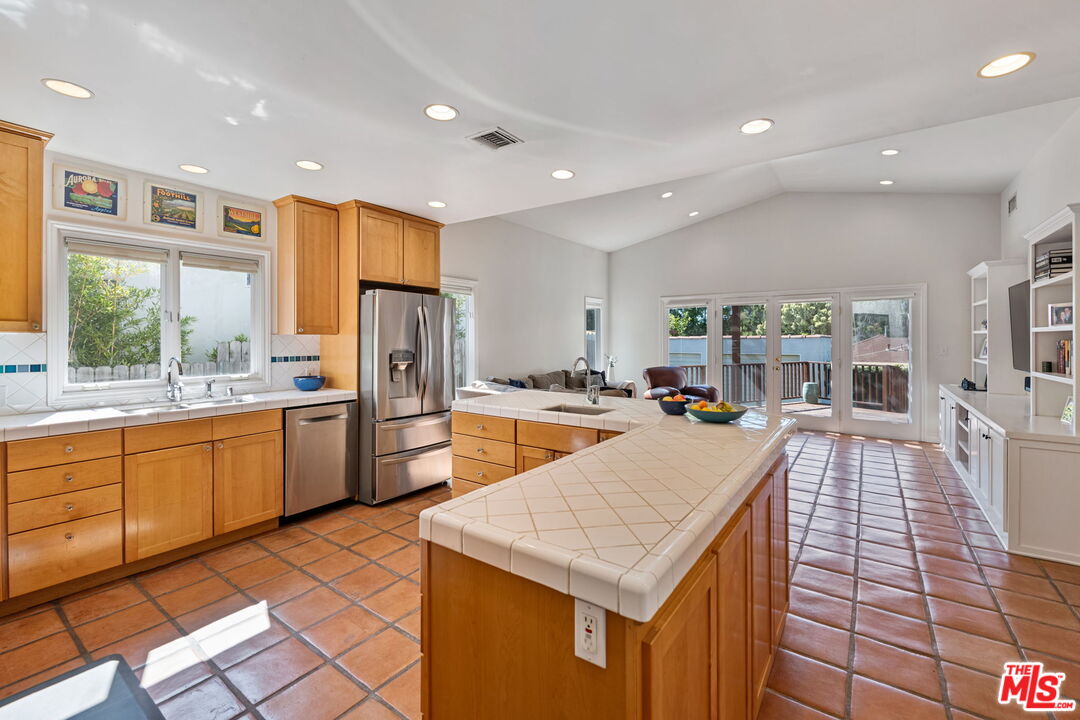 Beautiful 3 bed/2 bath + great room expanded Traditional with the perfect floor plan on a spacious 6,759sf lot. The entry opens to living room with vaulted ceiling, original Batchelder-tiled fireplace and large archway opening to dining room with built-ins and large window overlooking greenery. Spacious kitchen with island and breakfast bar, vintage gas range/oven, tiled countertops and an abundance of cabinetry all opening to family/great room with vaulted ceilings, recessed lighting and French doors to back deck with veranda and grassy backyard, newly hardscape backyard and gated driveway. 2 bedrooms with crown molding and built-out closets and completely remodeled marble-finished full bathroom in hallway and expanded primary suite with French doors to deck and backyard and 2 large closets. Primary bathroom with dual basins and updated tiled shower. Additional features include hardwood and tile flooring, dual-zoned central ac/heat, garage is partially drywalled and currently used as office/gym. Close proximity to Pico Blvd. retail and restaurants, Rancho Park golf/park and recreation center, Westfield Century City Mall, UCLA and Beverly Hills. Located in the highly coveted Westwood Charter School District.