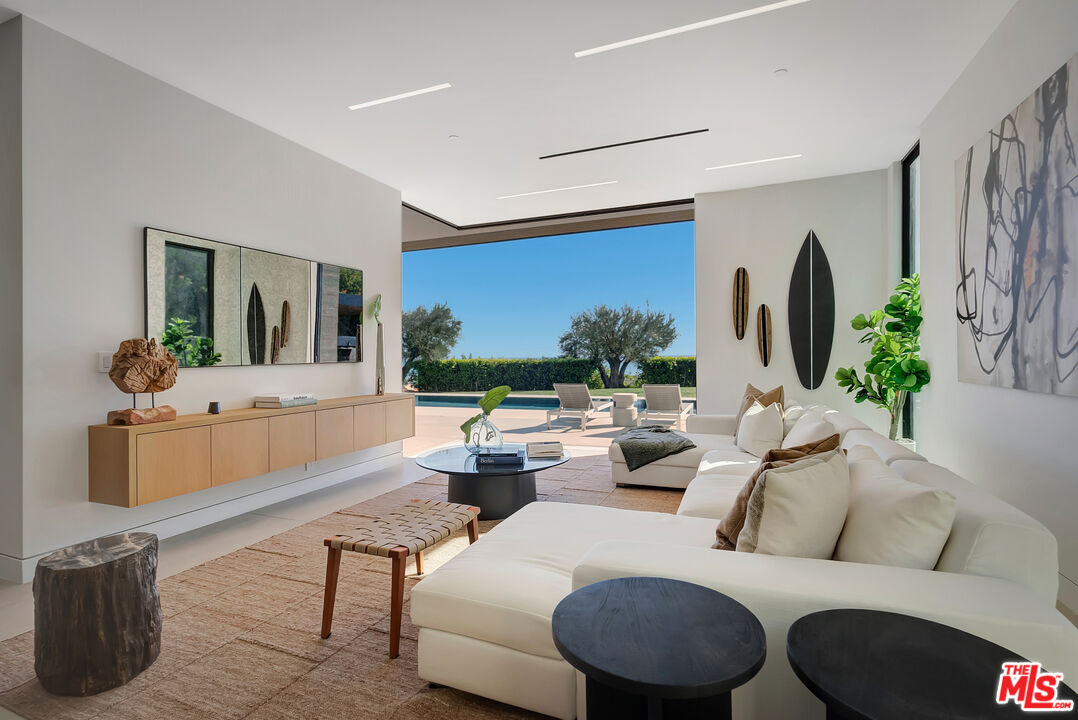 Extraordinary New Construction in Malibu. Located in the private, gated enclave of Malibu Colony Estates at the beginning of Malibu Rd, this stunning home offers breathtaking ocean views and contemporary design by renowned architect Douglas W. Burdge, AIA. One of just four homes in this prestigious community, this crowning jewel sits on approximately 1.3 acres with five bedrooms and ten bathrooms. A dramatic pivot entry door, framed by sculptural water features, sets the stage for the seamless indoor-outdoor flow of the home. Expansive glass walls, high ceilings, and premium materials like vein-cut travertine and rare Calcutta Gold stone enhance the elegant design. The grand living room features a striking floor-to-ceiling Blue Bibas marble fireplace, while the gourmet kitchen is equipped with top-of-the-line appliances and custom backlit cabinetry. Designed for effortless entertaining, the outdoor spaces include multiple lounge areas, a covered bar that seats six and an outdoor dining space. The private backyard also features an infinity pool and spa, a firepit with banquet-style seating, and a fenced lawn ideal for pets or play. The main level of the home includes a media area, a full bar with bifold doors to the patio, a spacious dining area, and an impressive office with stunning views. A guest suite with an en-suite bath completes this main level floor. Upstairs, the primary suite is a private retreat with two en-suite bathrooms, dual walk-in closets, and a wraparound patio with ocean and mountain views. Three additional en-suite bedrooms on the second level provide ample space for family and guests. The lower level is designed for entertainment and relaxation, featuring a home theater, game room, gym/bonus room with large bathroom for a possible sixth sleeping area, separate powder room, and laundry room. A three-car garage, ample guest onsite and street parking, and an elevator to all floors add to the home's conveniences. Just minutes from Malibu's top beaches and shopping, this estate offers a rare combination of luxury, privacy, and breathtaking surroundings. This is a rare coastal setting in Malibu centrally located just moments from Malibu's shoreline and the vibrant heart of Malibu. Recently opened new shops and restraurants offer new energy and a great beach vibe. It is important to note that this home is connected to a central sewer system and all utilities on the cul-de-sac street are undergrounded.