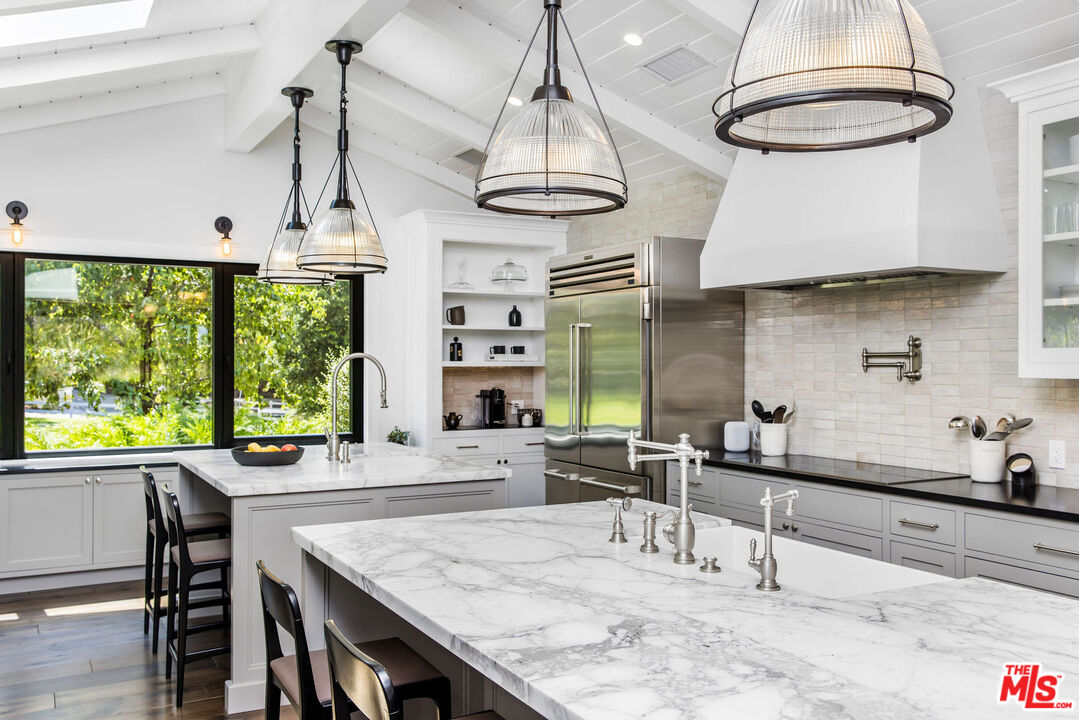 This quintessential Hidden Hills estate is like no other. An outlier in all of the best ways, this property has retained its 1960's pedigree while offering all of today's luxuries in an earthy, California palette. One of its many unique features is that it lives like a single story with only two of its six en-suite bedrooms on the second floor. Situated on one of Hidden Hills most sought after streets on a flat lot, this property ushers you in with its long circular driveway and beautiful native landscaping. Upon entering, you'll notice the sophisticated materials used to transform this home into a sanctuary for everyday living and entertaining. Designed by Jessica Risko Smith to capture luxurious comfort as well as simplicity, this home offers understated elegance throughout. Featuring Oregon oak flooring, the elegant living room flows out to the yard through European tilt-turn doors. The spacious family room has gorgeous vaulted ceilings with skylights and leads out to a covered al fresco dining area. The spectacular kitchen also has vaulted ceilings and skylights as well as dual marble topped islands. The perimeter soapstone countertops and cabinetry are framed with European tilt-turn windows with views to the front. A walk-in pantry and high-end Miele and SubZero appliances elevate the space. Adjacent family and dining rooms offer seamless flow for entertaining. Three en-suite bedrooms with stunning baths as well as a stackable laundry closet lead to the main level primary suite. The primary suite features cathedral ceilings, dual walk-in closets and doors leading to the patio. The spa-like primary bath has curated details such as an oak dual vanity with center storage, marble flooring, soaking tub and large shower. Additional highlights include a 500 sq ft office/flex space which opens to the yard, a spacious mudroom with prep sink and full laundry, powder room and beautiful pool bath with shower. Two additional vaulted-ceiling bedrooms are located upstairs, each ideal as guest suites or additional primary suites. Outdoor living is just as impressive, with a Pebble Tec pool and spa, a built-in BBQ with soapstone counters, a covered patio, and beautifully landscaped grounds. The 1.25-acre lot also includes a flat area suitable for a barn, ADU, tennis court, or other structure. This home is both high-performance and highly comfortable. Every detail has been thoughtfully considered to support a lifestyle that is elevated, and beautifully in tune with its surroundings. Every system - from foundation to roof - were upgraded, creating a property that blends modern function with timeless design. All located in prestigious Hidden Hills with its top tier security, numerous community amenities, horseback riding arenas and trails, and Blue Ribbon schools.