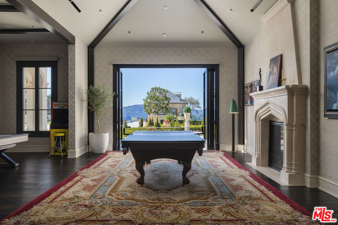 Behind the double gates of The Estates at The Oaks, this majestic residence offers rare privacy and sweeping, unobstructed views across the rolling hills of Malibu. Set at the end of a long, quiet driveway, and spanning over two acres, the property evokes a European country estate, thoughtfully built over more than a decade with exceptional care and intention. Traditional craftsmanship is showcased through hand-selected stone, custom wall treatments, intricate moldings, and layered tile work, with bespoke wallpaper, paneling, and millwork sourced from JP Weaver Company. The architecture feels timeless yet current, anchored by a grand arrival court with a scaled stone fountain and an entry aligned perfectly with the horizon. Inside, soaring domed ceilings, wide hallways, and sweeping bronze staircases frame endless vistas and create a striking sense of arrival. The main level unfolds through a seamless blend of formal and informal spaces. A monumental entry leads to an elegant lounge with a Spanish limestone fireplace opening to the gardens, while a Louis XIV inspired dining room with custom French wall coverings overlooks the grounds. The chef's kitchen flows into the family room, bar, and fireside gathering areas, finished with refined European details and a full suite of Miele and Wolf appliances. Dual library offices with concealed bath and Minotti cabinetry, a vaulted game room opening to outdoor entertaining areas, three guest suites with outdoor access, and a glass-wrapped gym with steam room and massage suite complete the level. Wraparound terraces extend the living spaces outdoors, ideal for both entertaining and quiet retreat. Upstairs, five bedroom suites surround a grand landing, including an exceptional primary suite with vaulted ceilings, a private living room, domed office, dual spa-caliber bathrooms, expansive closets, and a sweeping terrace with outdoor fireplace overlooking Malibu State Park. A secondary primary offers similar scale with its own foyer, stone fireplace, soaking tub, and private terrace. The lower level features a 5,225 sq. ft. air-conditioned garage, a French-inspired cinema with fiber-optic ceiling and Dolby Atmos sound, an entertaining lounge with bar, wine cellar and tasting room, and a private beauty salon. The grounds unfold as a series of curated experiences, including tennis, pickleball, and bocce courts, a solar-heated ozone pool, dramatic fire pits, and a fully equipped outdoor pavilion with dual BBQs, pizza oven, bar, and integrated bathrooms. A vegetable garden adds a quieter rhythm to the property. Above it all, an elevator-accessed rooftop deck offers uninterrupted 360-degree views across the entire community. The estate is engineered for longevity and sustainability with advanced HVAC, whole-home water purification, solar power, fire-resistant construction, a full backup generator, and a triple-phase electrical system guided by Vastu and feng shui principles for balance and clarity.