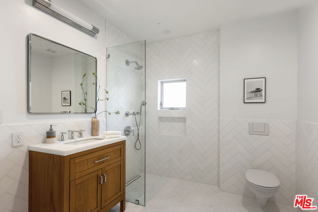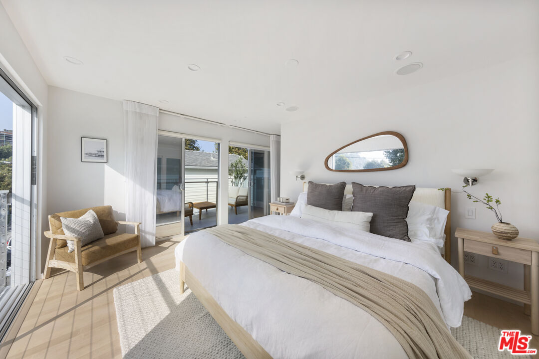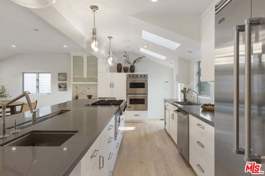 Just moments from the beach, this beautifully updated three bedroom, three bath home captures the essence of relaxed California coastal living. The open-concept main level features spacious living and dining areas alongside a gourmet kitchen with Viking stainless steel appliances, a large island with breakfast bar, and elegant lighting that is perfect for entertaining. On the first floor is also a guest bedroom, fully remodeled bath, and laundry area. Upstairs the primary suite opens to a delightful private patio and a second wall features multi-stacking sliding glass doors that invite in the ocean breeze. The luxurious ensuite bath includes Waterworks fixtures, marble finishes, dual shower heads, and an oversized soaking tub. A second bedroom and renovated bath complete the second level. Enjoy ocean, canyon and stunning sunset views from the expansive rooftop deck - the ideal space for relaxing or spending time with friends. Additional highlights include hardwood floors throughout, abundant natural light from windows and skylights, closets with built-ins, a private backyard with outdoor shower, and close proximity to Canyon Elementary, the Santa Monica Stairs, local restaurants and coffee shops. Experience refined coastal living in this exceptional Santa Monica Canyon home.